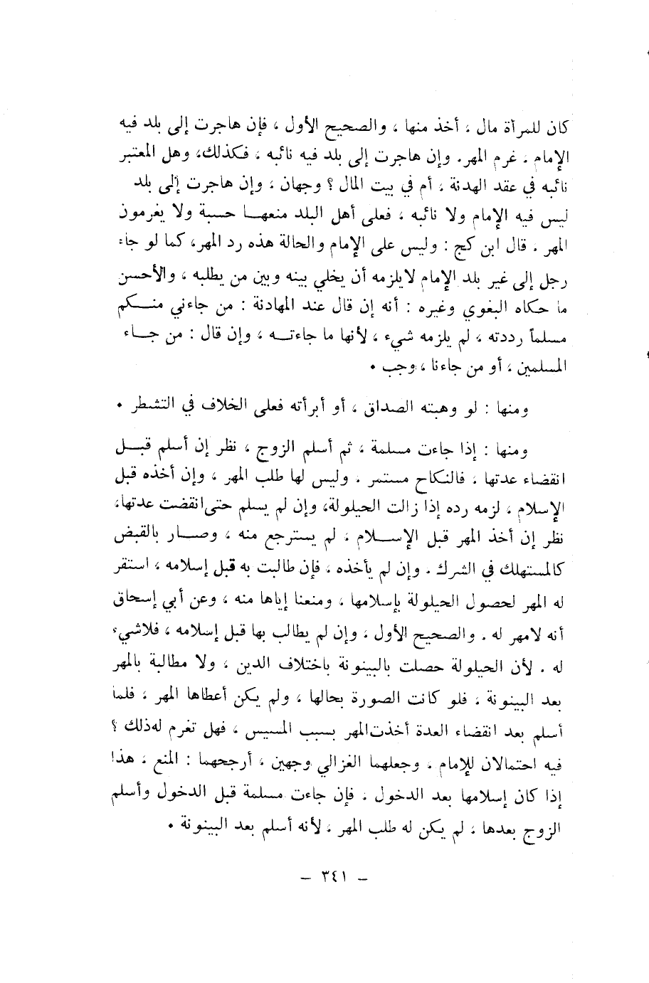 وَمِنْهَا: إِذَا جَاءَتْ مُسْلِمَةً، ثُمَّ أَسْلَمَ الزَّوْجُ، نُظِرَ إِنْ أَسْلَمَ قَبْلَ انْقِضَاءِ عِدَّتِهَا، فَالنِّكَاحُ مُسْتَمِرٌّ، وَلَيْسَ لَهَا طَلَبُ الْمَهْرِ، وَإِنْ أَخَذَهُ قَبْلَ الْإِسْلَامِ، لَزِمَهُ رَدُّهُ إِذَا زَالَتِ الْحَيْلُولَةُ، وَإِنْ لَمْ يُسْلِمْ حَتَّى انْقَضَتْ عِدَّتُهَا، نُظِرَ إِنْ أَخَذَ الْمَهْرَ قَبْلَ الْإِسْلَامِ، لَمْ يُسْتَرْجَعْ مِنْهُ، وَصَارَ بِالْقَبْضِ كَالْمُسْتَهْلَكِ فِي الشِّرْكِ، وَإِنْ لَمْ يَأْخُذْهُ، فَإِنْ طَالَبَتْ بِهِ قَبْلَ إِسْلَامِهِ، اسْتَقَرَّ لَهُ الْمَهْرُ لِحُصُولِ الْحَيْلُولَةِ بِإِسْلَامِهَا، وَمَنَعْنَا إِيَّاهَا مِنْهُ، وَعَنْ أَبِي إِسْحَاقَ أَنَّهُ لَا مَهْرَ لَهُ، وَالصَّحِيحُ الْأَوَّلُ، وَإِنْ لَمْ يُطَالِبْ بِهَا قَبْلَ إِسْلَامِهِ، فَلَا شَيْءَ لَهُ، لِأَنَّ الْحَيْلُولَةَ حَصَلَتْ بِالْبَيْنُونَةِ بِاخْتِلَافِ الدِّينِ، وَلَا مُطَالَبَةَ بِالْمَهْرِ بَعْدَ الْبَيْنُونَةِ، فَلَوْ كَانَتِ الصُّورَةُ بِحَالِهَا، وَلَمْ يَكُنْ أُعْطَاهَا الْمَهْرَ، فَلَمَّا أَسْلَمْ بَعْدَ انْقِضَاءِ الْعِدَّةِ أَخَذَتِ الْمَهْرَ بِسَبَبِ الْمَسِيسِ، فَهَلْ تَغْرَمُ لَهُ ذَلِكَ؟ فِيهِ احْتِمَالَانِ لِلْإِمَامِ، وَجَعَلَهُمَا الْغَزَالِيُّ وَجْهَيْنِ، أَرْجَحُهُمَا: الْمَنْعُ، هَذَا إِذَا كَانَ إِسْلَامُهَا بَعْدَ الدُّخُولِ، فَإِنْ جَاءَتْ مُسْلِمَةً قَبْلَ الدُّخُولِ وَأَسْلَمَ الزَّوْجُ بَعْدَهَا، لَمْ يَكُنْ لَهُ طَلَبُ الْمَهْرِ، لِأَنَّهُ أَسْلَمَ بَعْدَ الْبَيْنُونَةِ.