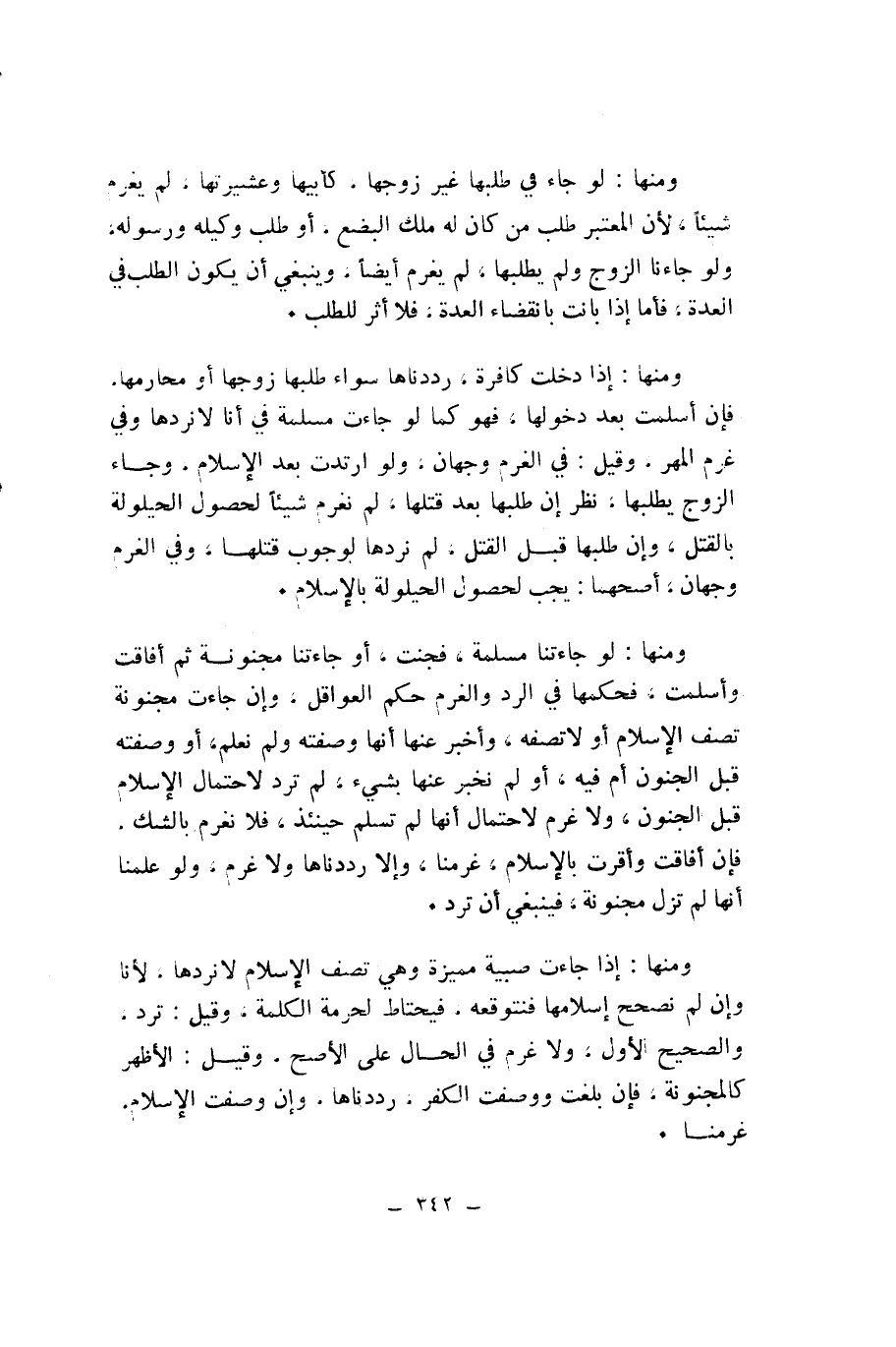 وَمِنْهَا: لَوْ جَاءَتْنَا مُسْلِمَةً، فَجُنَّتْ، أَوْ جَاءَتْنَا مَجْنُونَةً ثُمَّ أَفَاقَتْ وَأَسْلَمَتْ، فَحُكْمُهَا فِي الرَّدِّ وَالْغُرْمِ حُكْمُ الْعَوَاقِلِ، وَإِنْ جَاءَتْ مَجْنُونَةً تَصِفُ الْإِسْلَامَ أَوْ لَا تَصِفُهُ، وَأُخْبِرَ عَنْهَا أَنَّهَا وَصَفَتْهُ وَلَمْ نَعْلَمْ، أَوْ وَصَفَتْهُ قَبْلَ الْجُنُونِ أَمْ فِيهِ، أَوْ لَمْ نُخْبَرْ عَنْهَا بِشَيْءٍ، لَمْ تُرَدَّ لِاحْتِمَالِ الْإِسْلَامِ قَبْلَ الْجُنُونِ، وَلَا غُرْمَ لِاحْتِمَالِ أَنَّهَا لَمْ تُسْلِمْ حِينَئِذٍ، فَلَا نَغْرَمُ بِالشَّكِّ، فَإِنْ أَفَاقَتْ وَأَقَرَّتْ بِالْإِسْلَامِ، غَرَمْنَا، وَإِلَّا رَدَدْنَاهَا وَلَا غُرْمَ، وَلَوْ عَلِمْنَا أَنَّهَا لَمْ تَزَلْ مَجْنُونَةً، فَيَنْبَغِي أَنْ تُرَدَّ.