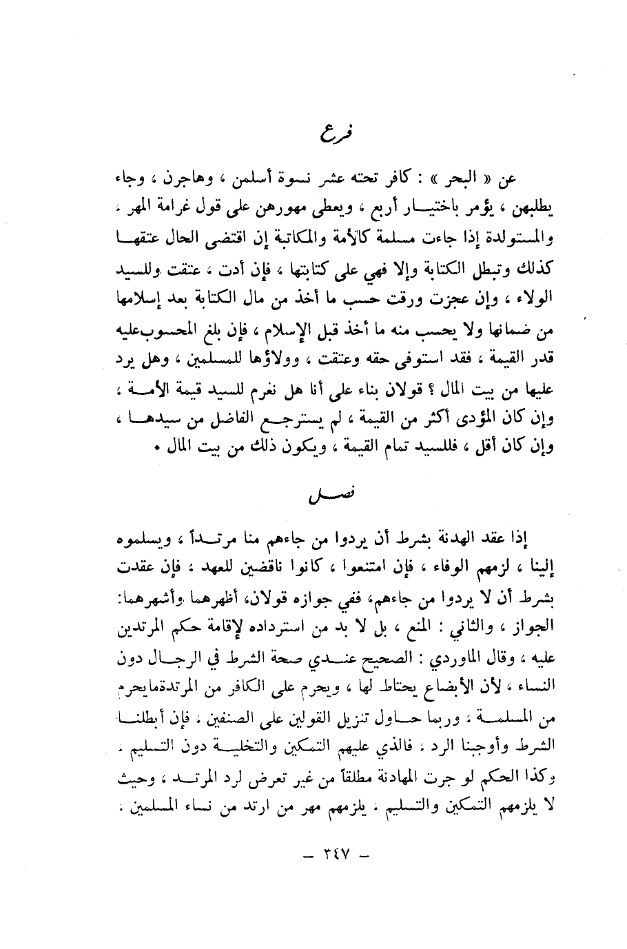 عَنْ «الْبَحْرِ» : كَافِرٌ تَحْتَهُ عَشْرُ نِسْوَةٍ أَسْلَمْنَ، وَهَاجَرْنَ، وَجَاءَ يَطْلُبُهُنَّ، يُؤْمَرُ بِاخْتِيَارِ أَرْبَعٍ، وَيُعْطَى مُهُورَهُنَّ عَلَى قَوْلِ غَرَامَةِ الْمَهْرِ، وَالْمُسْتَوْلَدَةُ إِذَا جَاءَتْ مُسْلِمَةً كَالْأَمَةِ وَالْمُكَاتَبَةِ إِنِ اقْتَضَى الْحَالُ عِتْقَهَا كَذَلِكَ وَتَبْطُلُ الْكِتَابَةُ وَإِلَّا فَهِيَ عَلَى كِتَابَتِهَا، فَإِنْ أَدَّتْ، عَتَقَتْ وَلِلسَّيِّدِ الْوَلَاءُ، وَإِنْ عَجَزَتْ وَرَقَّتْ حُسِبَ مَا أُخِذَ مِنْ مَالِ الْكِتَابَةِ بَعْدَ إِسْلَامِهَا مِنْ ضَمَانِهَا وَلَا يُحْسَبُ مِنْهُ مَا أَخَذَ قَبْلَ الْإِسْلَامِ، فَإِنْ بَلَغَ الْمَحْسُوبُ عَلَيْهِ قَدْرَ الْقِيمَةِ، فَقَدِ اسْتَوْفَى حَقَّهُ وَعَتَقَتْ، وَوَلَاؤُهَا لِلْمُسْلِمِينَ، وَهَلْ يُرَدُّ عَلَيْهَا مِنْ بَيْتِ الْمَالِ؟ قَوْلَانِ بِنَاءٍ عَلَى أَنَّا هَلْ نَغْرَمُ لِلسَّيِّدِ قِيمَةَ الْأَمَةِ، وَإِنْ كَانَ الْمُؤَدَّى أَكْثَرَ مِنَ الْقِيمَةِ، لَمْ يُسْتَرْجِعِ الْفَاضِلُ مِنْ سَيِّدِهَا، وَإِنْ كَانَ أَقَلَّ، فَلِلسَّيِّدِ تَمَامُ الْقِيمَةِ، وَيَكُونُ ذَلِكَ مِنْ بَيْتِ الْمَالِ.
