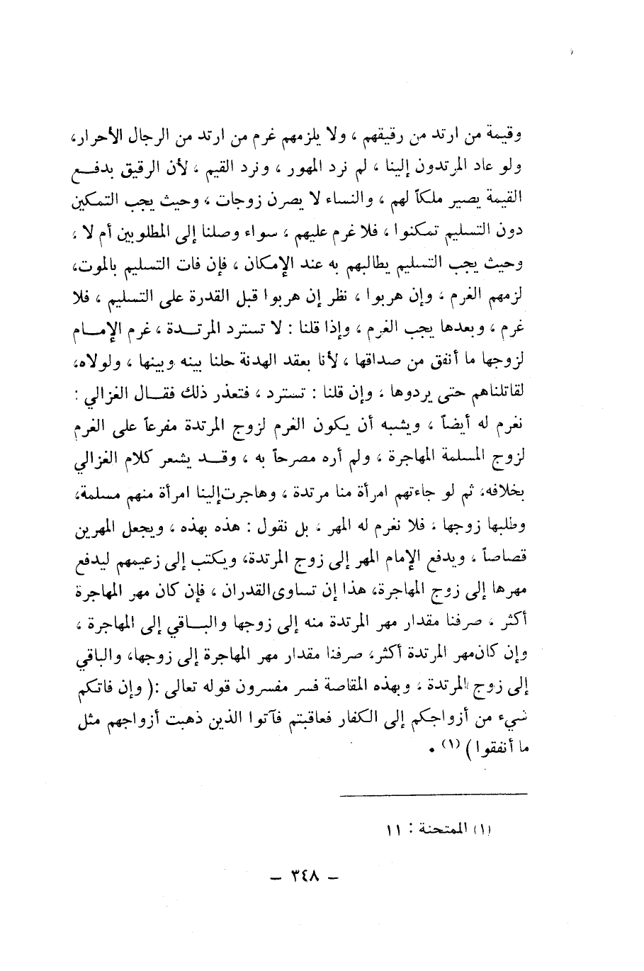وَقِيمَةُ مَنِ ارْتَدَّ مِنْ رَقِيقِهِمْ، وَلَا يَلْزَمُهُمْ غُرْمُ مَنِ ارْتَدَّ مِنَ الرِّجَالِ الْأَحْرَارِ، وَلَوْ عَادَ الْمُرْتَدُّونَ إِلَيْنَا، لَمْ نَرُدَّ الْمُهُورَ، وَنَرُدُّ الْقِيَمَ، لِأَنَّ الرَّقِيقَ بِدَفْعِ الْقِيمَةِ يَصِيرُ مِلْكًا لَهُمْ، وَالنِّسَاءَ لَا يَصِرْنَ زَوْجَاتٍ، وَحَيْثُ يَجِبُ التَّمْكِينُ دُونَ التَّسْلِيمِ تَمَكَّنُوا، فَلَا غُرْمَ عَلَيْهِمْ، سَوَاءً وَصَلْنَا إِلَى الْمَطْلُوبِينَ أَمْ لَا، وَحَيْثُ يَجِبُ التَّسْلِيمُ يُطَالِبُهُمْ بِهِ عِنْدَ الْإِمْكَانِ، فَإِنْ فَاتَ التَّسْلِيمُ بِالْمَوْتِ، لَزِمَهُمُ الْغُرْمُ، وَإِنْ هَرَبُوا، نُظِرَ إِنْ هَرَبُوا قَبْلَ الْقُدْرَةِ عَلَى التَّسْلِيمِ، فَلَا غُرْمَ، وَبَعْدَهَا يَجِبُ الْغُرْمُ، وَإِذَا قُلْنَا: لَا تُسْتَرَدُّ الْمُرْتَدَّةُ، غَرِمَ الْإِمَامُ لِزَوْجِهَا مَا أَنْفَقَ مِنْ صَدَاقِهَا، لِأَنَّا بِعَقْدِ الْهُدْنَةِ حُلْنَا بَيْنَهُ وَبَيْنَهَا، وَلَوْلَاهُ، لَقَاتَلْنَاهُمْ حَتَّى يَرُدُّوهَا، وَإِنْ قُلْنَا: تُسْتَرَدُّ، فَتَعَذَّرَ ذَلِكَ فَقَالَ الْغَزَالِيُّ: نَغْرَمُ لَهُ أَيْضًا، وَيُشْبِهُ أَنْ يَكُونَ الْغُرْمُ لِزَوْجِ الْمُرْتَدَّةِ مُفَرَّعًا عَلَى الْغُرْمِ لِزَوْجِ الْمُسْلِمَةِ الْمُهَاجِرَةِ، وَلَمْ أَرَهُ مُصَرِّحًا بِهِ، وَقَدْ يُشْعِرُ كَلَامُ الْغَزَالِيِّ بِخِلَافِهِ، ثُمَّ لَوْ جَاءَتْهُمُ امْرَأَةٌ مِنَّا مُرْتَدَّةً، وَهَاجَرَتْ إِلَيْنَا امْرَأَةٌ مِنْهُمْ مُسْلِمَةً، وَطَلَبهَا زَوْجُهَا، فَلَا نَغْرَمُ لَهُ الْمَهْرَ، بَلْ نَقُولُ: هَذِهِ بِهَذِهِ، وَيَجْعَلُ الْمَهْرَيْنِ قِصَاصًا، وَيَدْفَعُ الْإِمَامُ الْمَهْرَ إِلَى زَوْجِ الْمُرْتَدَّةِ، وَيَكْتُبُ إِلَى زَعِيمِهِمْ لِيَدْفَعَ مَهْرَهَا إِلَى زَوْجِ الْمُهَاجِرَةِ، هَذَا إِنْ تَسَاوَى الْقِدْرَانِ، فَإِنْ كَانَ مَهْرُ الْمُهَاجِرَةِ أَكْثَرَ، صَرَفْنَا مِقْدَارَ مَهْرِ الْمُرْتَدَّةِ مِنْهُ إِلَى زَوْجِهَا وَالْبَاقِي إِلَى الْمُهَاجِرَةِ، وَإِنْ كَانَ مَهْرُ الْمُرْتَدَّةِ أَكْثَرَ، صَرَفْنَا مِقْدَارَ مَهْرِ الْمُهَاجِرَةِ إِلَى زَوْجِهَا، وَالْبَاقِي إِلَى زَوْجِ الْمُرْتَدَّةِ، وَبِهَذِهِ الْمُقَاصَّةِ فَسَّرَ مُفَسِّرُونَ قَوْلَهُ تَعَالَى: (وَإِنْ فَاتَكُمْ شَيْءٌ مِنْ أَزْوَاجِكُمْ إِلَى الْكُفَّارِ فَعَاقَبْتُمْ فَآتُوا الَّذِينَ ذَهَبَتْ أَزْوَاجُهُمْ مِثْلَ مَا أَنْفَقُوا) .