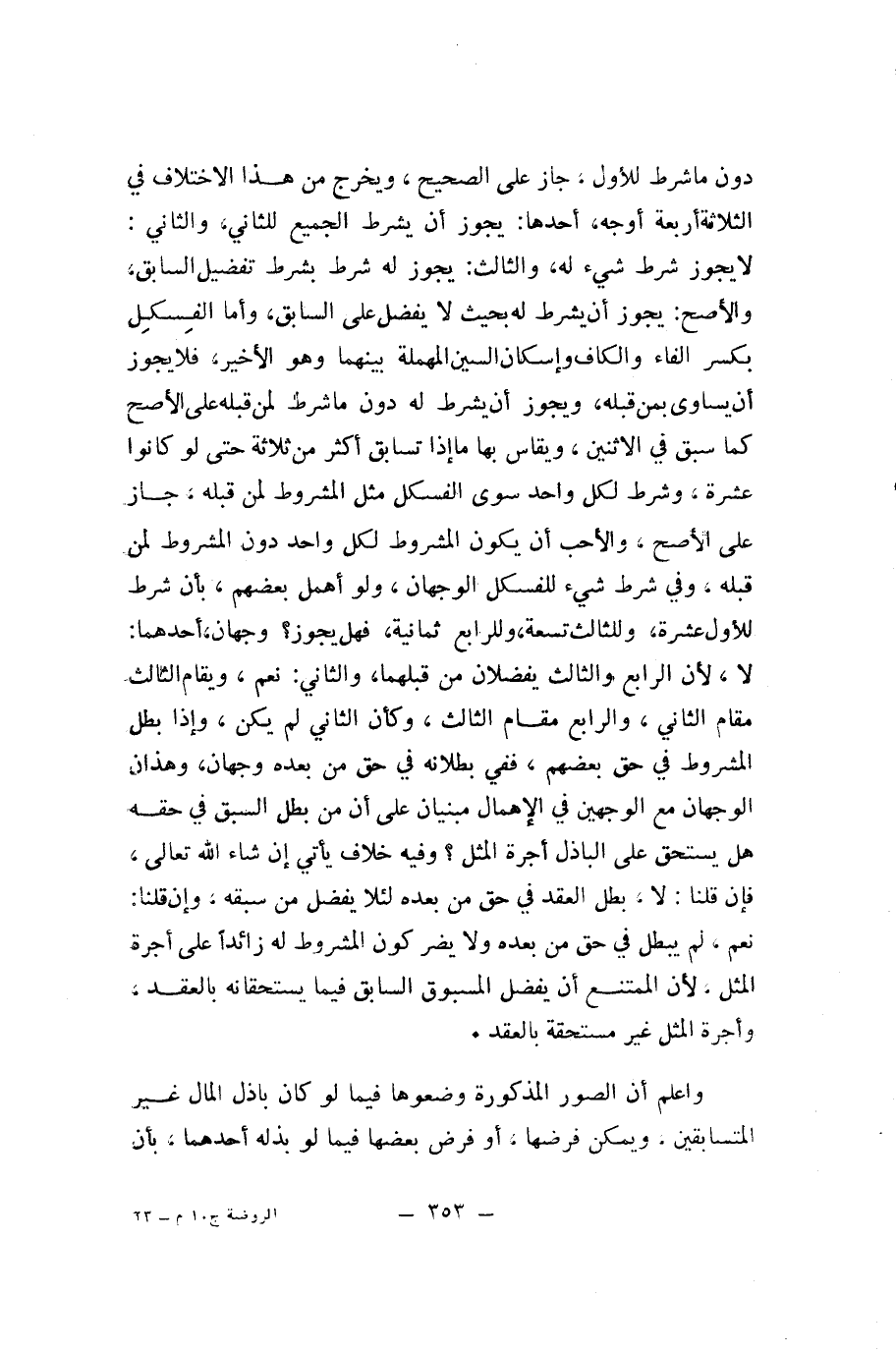 دُونَ مَا شَرَطَ لِلْأَوَّلِ، جَازَ عَلَى الصَّحِيحِ، وَيَخْرُجُ مِنْ هَذَا الِاخْتِلَافِ فِي الثَّلَاثَةِ أَرْبَعَةُ أَوْجُهٍ، أَحَدُهَا: يَجُوزُ أَنْ يَشْرُطَ الْجَمِيعَ لِلثَّانِي، وَالثَّانِي: لَا يَجُوزُ شَرْطُ شَيْءٍ لَهُ، وَالثَّالِثُ: يَجُوزُ لَهُ شَرْطٌ بِشَرْطِ تَفْضِيلِ السَّابِقِ، وَالْأَصَحُّ: يَجُوزُ أَنْ يَشْرُطَ لَهُ بِحَيْثُ لَا يُفَضَّلُ عَلَى السَّابِقِ، وَأَمَّا الْفِسْكِلُ بِكَسْرِ الْفَاءِ وَالْكَافِ وَإِسْكَانِ السِّينِ الْمُهْمَلَةِ بَيْنَهُمَا وَهُوَ الْأَخِيرُ، فَلَا يَجُوزُ أَنْ يُسَاوَى بِمَنْ قَبْلَهُ، وَيَجُوزُ أَنْ يَشْرُطَ لَهُ دُونَ مَا شَرَطَ لِمَنْ قَبْلَهُ عَلَى الْأَصَحِّ كَمَا سَبَقَ فِي الِاثْنَيْنِ، وَيُقَاسُ بِهَا مَا إِذَا تَسَابَقَ أَكْثَرُ مِنْ ثَلَاثَةٍ حَتَّى لَوْ كَانُوا عَشَرَةً، وَشَرَطَ لِكُلِّ وَاحِدَةٍ سِوَى الْفِسْكِلِ مِثْلُ الْمَشْرُوطِ لِمَنْ قَبْلَهُ، جَازَ عَلَى الْأَصَحِّ، وَالْأَحَبُّ أَنْ يَكُونَ الْمَشْرُوطُ لِكُلِّ وَاحِدٍ دُونَ الْمَشْرُوطِ لِمَنْ قَبْلَهُ، وَفِي شَرْطِ شَيْءٍ لِلْفِسْكِلِ الْوَجْهَانِ، وَلَوْ أَهْمَلَ بَعْضَهُمْ، بِأَنْ شَرَطَ لِلْأَوَّلِ عَشَرَةً، وَلِلثَّالِثِ تِسْعَةً، وَلِلرَّابِعِ ثَمَانِيَةً، فَهَلْ يَجُوزُ؟ وَجْهَانِ، أَحَدُهُمَا: لَا، لِأَنَّ الرَّابِعَ وَالثَّالِثَ يَفْضُلَانِ مَنْ قَبْلَهُمَا، وَالثَّانِي: نَعَمْ، وَيُقَامُ الثَّالِثُ مَقَامَ الثَّانِي، وَالرَّابِعُ مَقَامَ الثَّالِثِ، وَكَأَنَّ الثَّانِيَ لَمْ يَكُنْ، وَإِذَا بَطَلَ الْمَشْرُوطُ فِي حَقِّ بَعْضِهِمْ، فَفِي بُطْلَانِهِ فِي حَقِّ مَنْ بَعْدَهُ وَجْهَانِ، وَهَذَانِ الْوَجْهَانِ مَعَ الْوَجْهَيْنِ فِي الْإِهْمَالِ مَبْنِيَّانِ عَلَى أَنَّ مَنْ بَطَلَ السَّبْقُ فِي حَقِّهِ هَلْ يَسْتَحِقُّ عَلَى الْبَاذِلِ أُجْرَةَ الْمِثْلِ؟ وَفِيهِ خِلَافٌ يَأْتِي - إِنْ شَاءَ اللَّهُ تَعَالَى - فَإِنْ قُلْنَا: لَا، بَطَلَ الْعَقْدُ فِي حَقِّ مَنْ بَعْدَهُ لِئَلَّا يَفْضُلَ مَنْ سَبَقَهُ، وَإِنْ قُلْنَا: نَعَمْ، لَمْ يَبْطُلْ فِي حَقِّ مَنْ بَعْدَهُ وَلَا يَضُرُّ كَوْنُ الْمَشْرُوطِ لَهُ زَائِدًا عَلَى أُجْرَةِ الْمِثْلِ، لِأَنَّ الْمُمْتَنِعَ أَنْ يَفْضُلَ الْمَسْبُوقُ السَّابِقَ فِيمَا يَسْتَحِقَّانِهِ بِالْعَقْدِ، وَأُجْرَةُ الْمِثْلِ غَيْرُ مُسْتَحَقَّةٍ بِالْعَقْدِ. وَاعْلَمْ أَنَّ الصُّوَرَ الْمَذْكُورَةَ وَضَعُوهَا فِيمَا لَوْ كَانَ بَاذِلُ الْمَالِ غَيْرَ الْمُتَسَابِقِينَ، وَيُمْكِنُ فَرْضُهَا أَوْ فَرْضُ بَعْضِهَا فِيمَا لَوْ بَذَلَهُ أَحَدُهُمَا، بِأَنْ