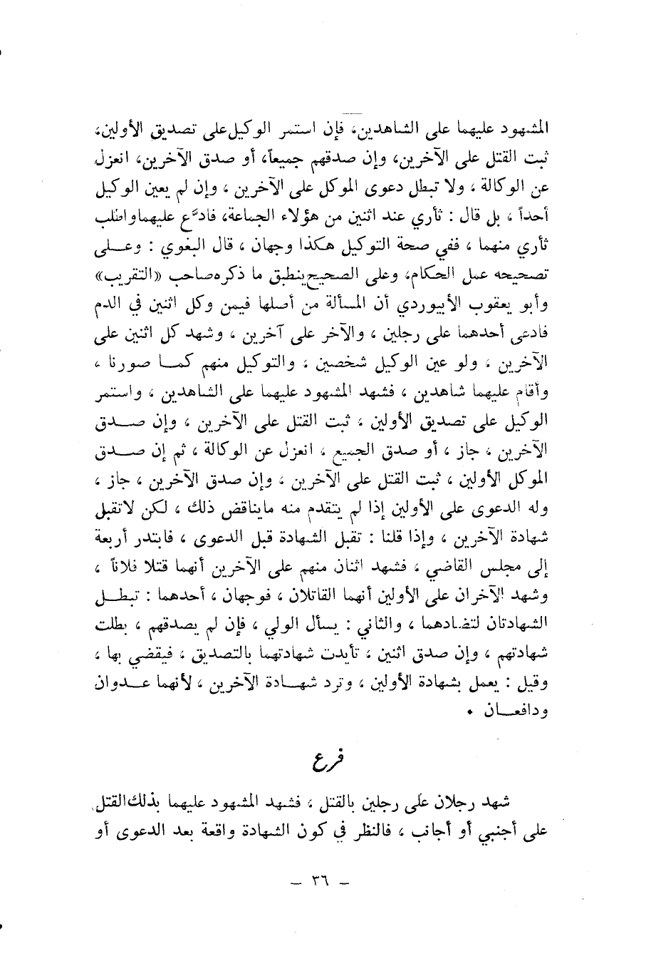 الْمَشْهُودُ عَلَيْهِمَا عَلَى الشَّاهِدَيْنِ، فَإِنِ اسْتَمَرَّ الْوَكِيلُ عَلَى تَصْدِيقِ الْأَوَّلَيْنِ، ثَبَتَ الْقَتْلُ عَلَى الْآخَرَيْنِ، وَإِنْ صَدَّقَهُمْ جَمِيعًا، أَوْ صَدَّقَ الْآخَرَيْنِ، انْعَزَلَ عَنِ الْوَكَالَةِ، وَلَا تَبْطُلُ دَعْوَى الْمُوَكِّلِ عَلَى الْآخَرَيْنِ، وَإِنْ لَمْ يُعَيِّنِ الْوَكِيلُ أَحَدًا، بَلْ قَالَ: ثَأْرِي عِنْدَ اثْنَيْنِ مِنْ هَؤُلَاءِ الْجَمَاعَةِ، فَادْعُ عَلَيْهِمَا وَاطْلُبْ ثَأْرِي مِنْهُمَا، فَفِي صِحَّةِ التَّوْكِيلِ هَكَذَا وَجْهَانِ، قَالَ الْبَغَوِيُّ: وَعَلَى تَصْحِيحِهِ عَمَلُ الْحُكَّامِ، وَعَلَى الصَّحِيحِ يَنْطَبِقُ مَا ذَكَرَهُ صَاحِبُ «التَّقْرِيبِ» وَأَبُو يَعْقُوبَ الْأَبِيوَرْدِيُّ أَنَّ الْمَسْأَلَةَ مِنْ أَصْلِهَا فِيمَنْ وَكَّلَ اثْنَيْنِ فِي الدَّمِ فَادَّعَى أَحَدُهُمَا عَلَى رَجُلَيْنِ، وَالْآخِرُ عَلَى آخَرَيْنِ، وَشَهِدَ كُلُّ اثْنَيْنِ عَلَى الْآخَرَيْنِ، وَلَوْ عَيَّنَ الْوَكِيلُ شَخْصَيْنِ، وَالتَّوْكِيلُ مِنْهُمْ كَمَا صَوَّرْنَا، وَأَقَامَ عَلَيْهِمَا شَاهِدَيْنِ، فَشَهِدَ الْمَشْهُودُ عَلَيْهِمَا عَلَى الشَّاهِدَيْنِ، وَاسْتَمَرَّ الْوَكِيلُ عَلَى تَصْدِيقِ الْأَوَّلَيْنِ، ثَبَتَ الْقَتْلُ عَلَى الْآخَرَيْنِ، وَإِنْ صَدَّقَ الْآخَرَيْنِ، جَازَ، أَوْ صَدَّقَ الْجَمِيعَ، انْعَزَلَ عَنِ الْوَكَالَةِ، ثُمَّ إِنْ صَدَّقَ الْمُوَكِّلُ الْأَوَّلَيْنِ، ثَبَتَ الْقَتْلُ عَلَى الْآخَرَيْنِ، وَإِنْ صَدَّقَ الْآخَرَيْنِ، جَازَ، وَلَهُ الدَّعْوَى عَلَى الْأَوَّلَيْنِ إِذَا لَمْ يَتَقَدَّمْ مِنْهُ مَا يُنَاقِضُ ذَلِكَ، لَكِنْ لَا تُقْبَلُ شَهَادَةُ الْآخَرَيْنِ، وَإِذَا قُلْنَا: تُقْبَلُ الشَّهَادَةُ قَبْلَ الدَّعْوَى، فَابْتَدَرَ أَرْبَعَةٌ إِلَى مَجْلِسِ الْقَاضِي، فَشَهِدَ اثْنَانِ مِنْهُمْ عَلَى الْآخَرَيْنِ أَنَّهُمَا قَتَلَا فُلَانًا، وَشَهِدَ الْآخَرَانِ عَلَى الْأَوَّلَيْنِ أَنَّهُمَا الْقَاتِلَانِ، فَوَجْهَانِ، أَحَدُهُمَا: تَبْطُلُ الشَّهَادَتَانِ لِتَضَادِّهِمَا، وَالثَّانِي: يُسْأَلُ الْوَلِيُّ، فَإِنْ لَمْ يُصَدِّقْهُمْ، بَطَلَتْ شَهَادَتُهُمْ، وَإِنْ صَدَّقَ اثْنَيْنِ، تَأَيَّدَتْ شَهَادَتُهُمَا بِالتَّصْدِيقِ، فَيَقْضِي بِهَا، وَقِيلَ: يَعْمَلُ بِشَهَادَةِ الْأَوَّلَيْنِ، وَتُرَدُّ شَهَادَةُ الْآخَرَيْنِ ; لِأَنَّهُمَا عَدُوَّانِ وَدَافِعَانِ.