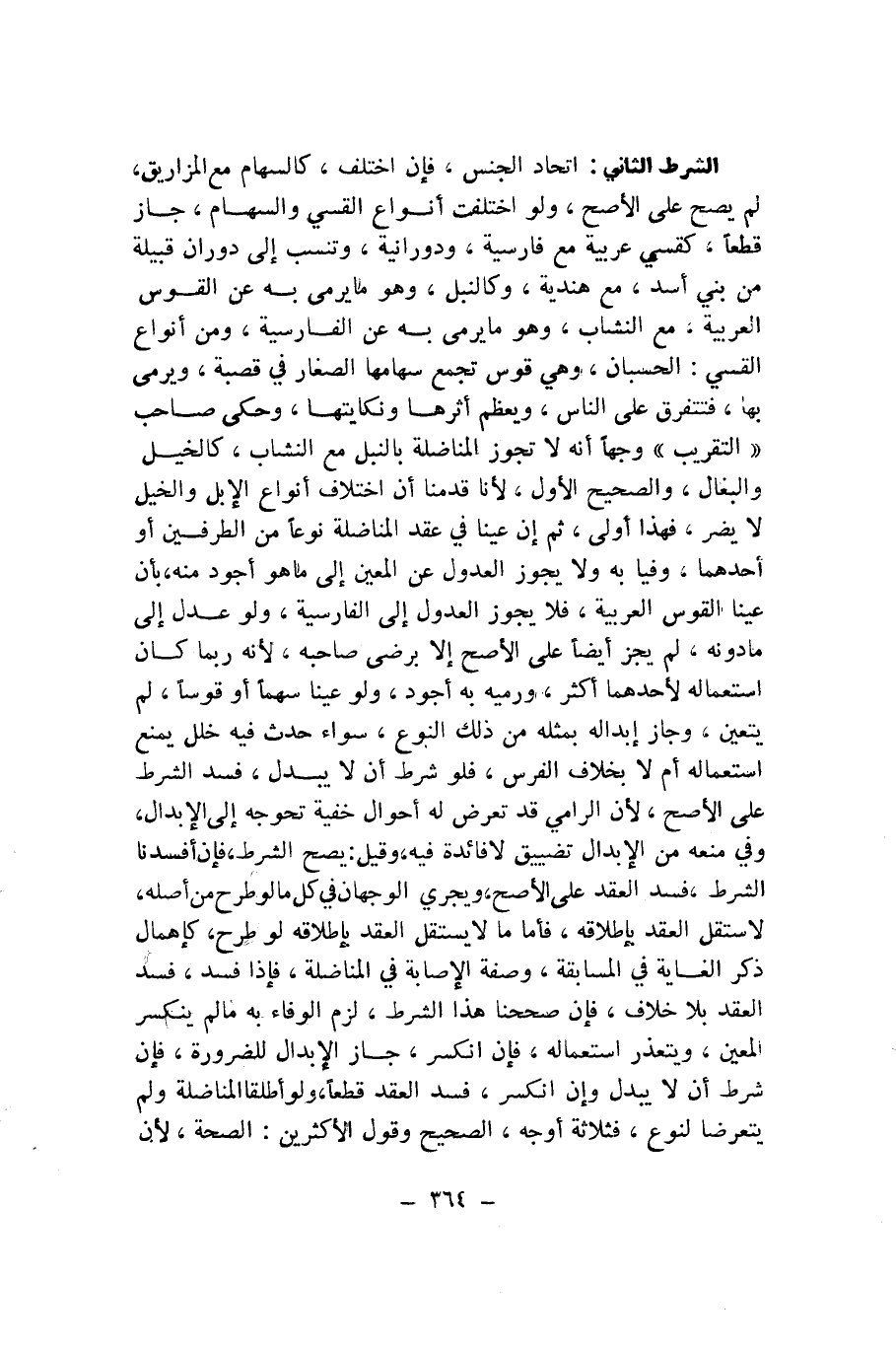 الشَّرْطُ الثَّانِي: اتِّحَادُ الْجِنْسِ، فَإِنِ اخْتَلَفَ، كَالسِّهَامِ مَعَ الْمَزَارِيقِ، لَمْ يَصِحَّ عَلَى الْأَصَحِّ، وَلَوِ اخْتَلَفَتْ أَنْوَاعُ الْقِسِيِّ وَالسِّهَامِ، جَازَ قَطْعًا، كَقِسِيٍّ عَرَبِيَّةٍ مَعَ فَارِسِيَّةٍ، وَدُورَانِيَّةٍ، وَتُنْسَبُ إِلَى دُورَانَ قَبِيلَةٌ مِنْ بَنِي أَسَدٍ، مَعَ هِنْدِيَّةٍ، وَكَالنَّبْلِ، وَهُوَ مَا يُرْمَى بِهِ عَنِ الْقَوْسِ الْعَرَبِيَّةِ، مَعَ النُّشَّابِ، وَهُوَ مَا يُرْمَى بِهِ عَنِ الْفَارِسِيَّةِ، وَمِنْ أَنْوَاعِ الْقِسِيِّ: الْحُسْبَانُ، وَهِيَ قَوْسٌ تُجْمَعُ سِهَامُهَا الصِّغَارُ فِي قَصَبَةٍ، وَيُرْمَى بِهَا، فَتَتَفَرَّقُ عَلَى النَّاسِ، وَيَعْظُمُ أَثَرُهَا وَنِكَايَتُهَا، وَحَكَى صَاحِبُ «التَّقْرِيبِ» وَجْهًا أَنَّهُ لَا تَجُوزُ الْمُنَاضَلَةُ بِالنَّبْلِ مَعَ النُّشَّابِ، كَالْخَيْلِ وَالْبِغَالِ، وَالصَّحِيحُ الْأَوَّلُ، لِأَنَّا قَدَّمْنَا أَنَّ اخْتِلَافَ أَنْوَاعِ الْإِبِلِ وَالْخَيْلِ لَا يَضُرُّ، فَهَذَا أَوْلَى، ثُمَّ إِنَّ عَيَّنَا فِي عَقْدِ الْمُنَاضَلَةِ نَوْعًا مِنَ الطَّرَفَيْنِ أَوْ أَحَدِهِمَا، وَفَّيَا بِهِ وَلَا يَجُوزُ الْعُدُولُ عَنِ الْمُعَيَّنِ إِلَى مَا هُوَ أَجْوَدُ مِنْهُ، بِأَنْ عَيَّنَا الْقَوْسَ الْعَرَبِيَّةَ، فَلَا يَجُوزُ الْعُدُولُ إِلَى الْفَارِسِيَّةِ، وَلَوْ عَدَلَ إِلَى مَا دُونَهُ، لَمْ يَجُزْ أَيْضًا عَلَى الْأَصَحِّ إِلَّا بِرِضَى صَاحِبِهِ، لِأَنَّهُ رُبَّمَا كَانَ اسْتِعْمَالُهُ لِأَحَدِهِمَا أَكْثَرَ، وَرَمْيُهُ بِهِ أَجْوَدَ، وَلَوْ عَيَّنَا سَهْمًا أَوْ قَوْسًا، لَمْ يَتَعَيَّنْ، وَجَازَ إِبْدَالُهُ بِمِثْلِهِ مِنْ ذَلِكَ النَّوْعِ، سَوَاءً حَدَثَ فِيهِ خَلَلٌ يَمْنَعُ اسْتِعْمَالَهُ أَمْ لَا بِخِلَافِ الْفَرَسِ، فَلَوْ شَرَطَ أَنْ لَا يُبَدَّلَ، فَسَدَ الشَّرْطُ عَلَى الْأَصَحِّ، لِأَنَّ الرَّامِيَ قَدْ تَعْرِضُ لَهُ أَحْوَالٌ خَفِيَّةٌ تُحْوِجُهُ إِلَى الْإِبْدَالِ، وَفِي مَنْعِهِ مِنَ الْإِبْدَالِ تَضْيِيقٌ لَا فَائِدَةَ فِيهِ، وَقِيلَ: يَصِحُّ الشَّرْطُ، فَإِنْ أَفْسَدْنَا الشَّرْطَ، فَسَدَ الْعَقْدُ عَلَى الْأَصَحِّ، وَيَجْرِي الْوَجْهَانِ فِي كُلِّ مَا لَوْ طُرِحَ مِنْ أَصْلِهِ لَاسْتَقَلَّ الْعَقْدُ بِإِطْلَاقِهِ، فَأَمَّا مَا لَا يَسْتَقِلُّ الْعَقْدُ بِإِطْلَاقِهِ لَوْ طُرِحَ، كَإِهْمَالِ ذِكْرِ الْغَايَةِ فِي الْمُسَابَقَةِ، وَصِفَةِ الْإِصَابَةِ فِي الْمُنَاضَلَةِ، فَإِذَا فَسَدَ، فَسَدَ الْعَقْدُ بِلَا خِلَافٍ، فَإِنْ صَحَّحْنَا هَذَا الشَّرْطَ، لَزِمَ الْوَفَاءُ بِهِ مَا لَمْ يَنْكَسِرِ الْمُعَيَّنُ، وَيَتَعَذَّرِ اسْتِعْمَالُهُ، فَإِنِ انْكَسَرَ جَازَ الْإِبْدَالُ لِلضَّرُورَةِ، فَإِنْ شَرَطَ أَنْ لَا يُبَدَّلَ وَإِنِ انْكَسَرَ، فَسَدَ الْعَقْدُ قَطْعًا، وَلَوْ أَطْلَقَا الْمُنَاضَلَةَ وَلَمْ يَتَعَرَّضَا لِنَوْعٍ، فَثَلَاثَةُ أَوْجُهٍ، الصَّحِيحُ وَقَوْلُ الْأَكْثَرِينَ: الصِّحَّةُ، لِأَنَّ