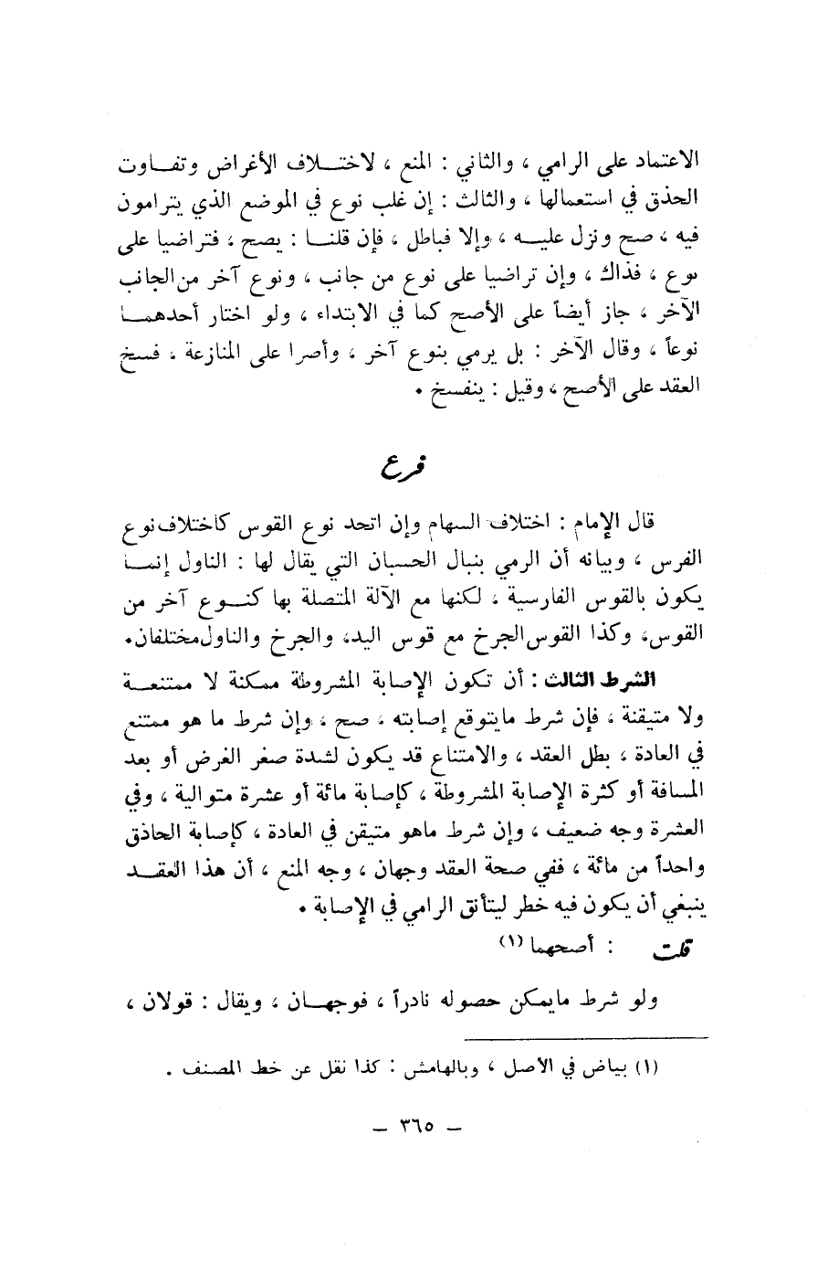 قَالَ الْإِمَامُ: اخْتِلَافُ السِّهَامِ وَإِنِ اتَّحَدَ نَوْعُ الْقَوْسِ كَاخْتِلَافِ نَوْعِ الْفَرَسِ، وَبَيَانُهُ أَنَّ الرَّمْيَ بِنِبَالِ الْحُسْبَانِ الَّتِي يُقَالُ لَهَا: النَّاوِلُ إِنَّمَا يَكُونُ بِالْقَوْسِ الْفَارِسِيَّةِ، لَكِنَّهَا مَعَ الْآلَةِ الْمُتَّصِلَةِ بِهَا كَنَوْعٍ آخَرَ مِنَ الْقَوْسِ، وَكَذَا الْقَوْسُ الْجَرْخُ مَعَ قَوْسِ الْيَدِ، وَالْجَرْخُ وَالنَّاوِلُ مُخْتَلِفَانِ.