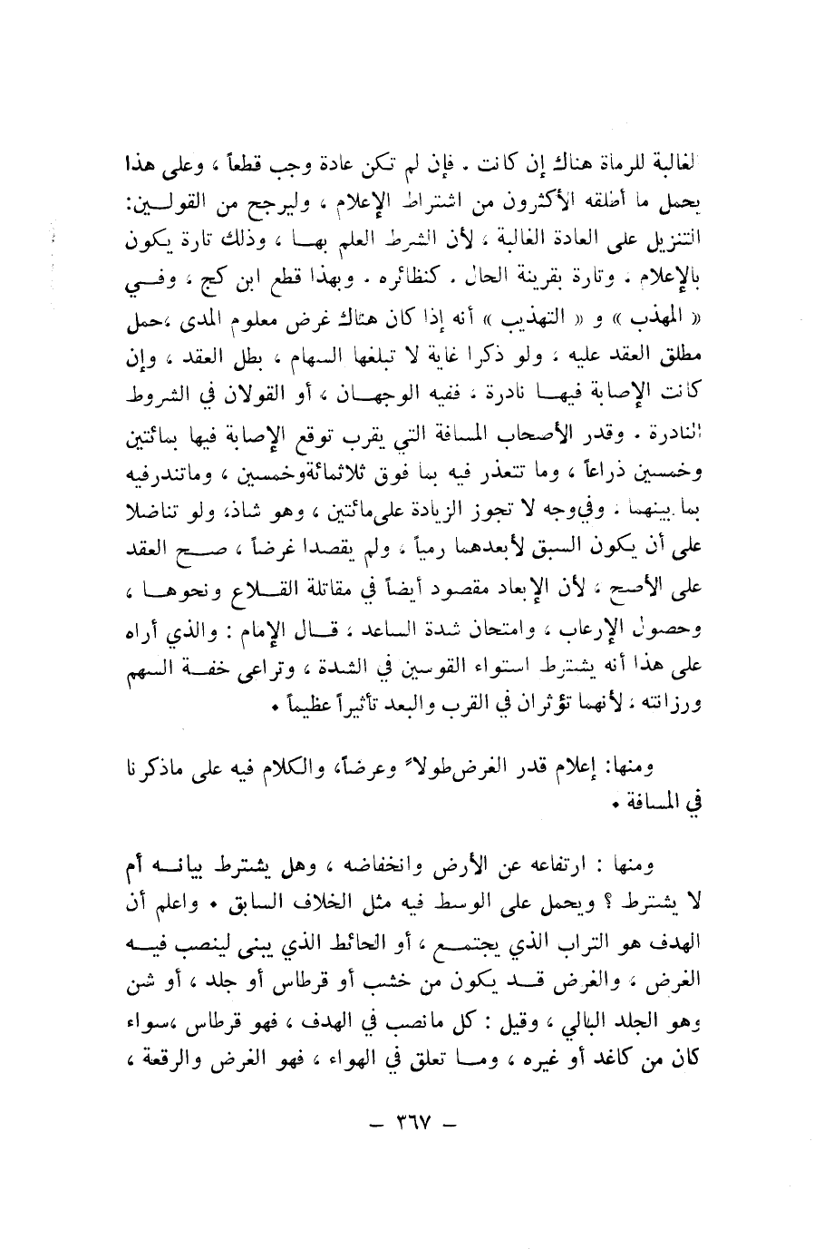 وَمِنْهَا: ارْتِفَاعُهُ عَنِ الْأَرْضِ وَانْخِفَاضُهُ، وَهَلْ يُشْتَرَطُ بَيَانُهُ أَمْ لَا يُشْتَرَطُ؟ وَيُحْمَلُ عَلَى الْوَسَطِ فِيهِ مِثْلَ الْخِلَافِ السَّابِقِ. وَاعْلَمْ أَنَّ الْهَدَفَ هُوَ التُّرَابُ الَّذِي يَجْتَمِعُ، أَوِ الْحَائِطُ الَّذِي يُبْنَى لِيُنْصَبَ فِيهِ الْغَرَضُ، وَالْغَرَضُ قَدْ يَكُونُ مِنْ خَشَبٍ أَوْ قِرْطَاسٍ أَوْ جِلْدٍ، أَوْ شَنٍّ وَهُوَ الْجِلْدُ الْبَالِي، وَقِيلَ: كُلُّ مَا نُصِبَ فِي الْهَدَفِ، فَهُوَ قِرْطَاسً، سَوَاءً كَانَ مِنْ كَاغِدٍ أَوْ غَيْرِهِ، وَمَا تَعَلَّقَ فِي الْهَوَاءِ، فَهُوَ الْغَرَضُ وَالرُّقْعَةُ،
