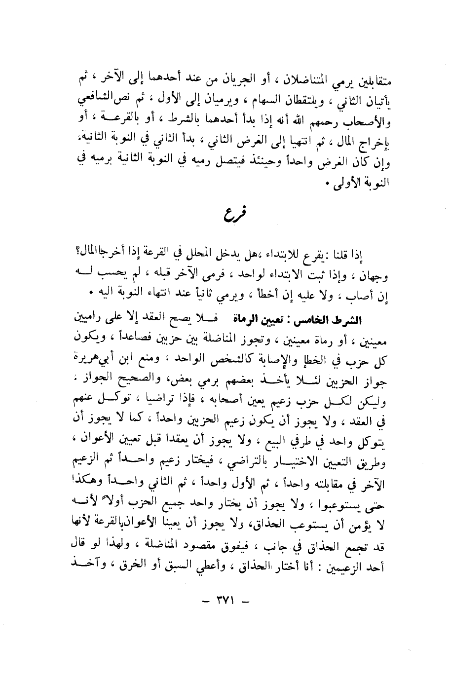 الشَّرْطُ الْخَامِسُ: تَعْيِينُ الرُّمَاةِ فَلَا يَصِحُّ الْعَقْدُ إِلَّا عَلَى رَامِيَيْنِ مُعَيَّنَيْنِ، أَوْ رُمَاةٍ مُعَيَّنِينَ، وَتَجُوزُ الْمُنَاضَلَةُ بَيْنَ حِزْبَيْنِ فَصَاعِدًا، وَيَكُونُ كُلُّ حِزْبٍ فِي الْخَطَأِ وَالْإِصَابَةِ كَالشَّخْصِ الْوَاحِدِ، وَمَنَعَ ابْنُ أَبِي هُرَيْرَةَ جَوَازَ الْحِزْبَيْنِ لِئَلَّا يَأْخُذَ بَعْضُهُمْ بِرَمْيِ بَعْضٍ، وَالصَّحِيحُ الْجَوَازُ، وَلْيَكُنْ لِكُلِّ حِزْبٍ زَعِيمٌ يُعَيِّنُ أَصْحَابَهُ، فَإِذَا تَرَاضَيَا، تَوَكَّلَ عَنْهُمْ فِي الْعَقْدِ، وَلَا يَجُوزُ أَنْ يَكُونَ زَعِيمُ الْحِزْبَيْنِ وَاحِدًا، كَمَا لَا يَجُوزُ أَنْ يَتَوَكَّلَ وَاحِدٌ فِي طَرَفَيِ الْبَيْعِ، وَلَا يَجُوزُ أَنْ يَعْقِدَا قَبْلَ تَعْيِينِ الْأَعْوَانِ، وَطَرِيقُ التَّعْيِينِ الِاخْتِيَارُ بِالتَّرَاضِي، فَيَخْتَارُ زَعِيمٌ وَاحِدًا ثُمَّ الزَّعِيمُ الْآخَرُ فِي مُقَابَلَتِهِ وَاحِدًا، ثُمَّ الْأَوَّلُ وَاحِدًا، ثُمَّ الثَّانِي وَاحِدًا وَهَكَذَا حَتَّى يَسْتَوْعِبُوا، وَلَا يَجُوزَ أَنْ يَخْتَارَ وَاحِدٌ جَمِيعَ الْحِزْبِ أَوَّلًا لِأَنَّهُ لَا يُؤْمَنُ أَنْ يَسْتَوْعِبَ الْحُذَّاقَ، وَلَا يَجُوزُ أَنْ يُعَيِّنَا الْأَعْوَانَ بِالْقُرْعَةِ لِأَنَّهَا قَدْ تَجْمَعُ الْحُذَّاقَ فِي جَانِبٍ، فَيَفُوقُ مَقْصُودُ الْمُنَاضَلَةِ، وَلِهَذَا لَوْ قَالَ أَحَدُ الزَّعِيمَيْنِ: أَنَا أَخْتَارُ الْحُذَّاقَ، وَأُعْطِي السَّبْقَ أَوِ الْخَرْقَ، وَآخُذُ