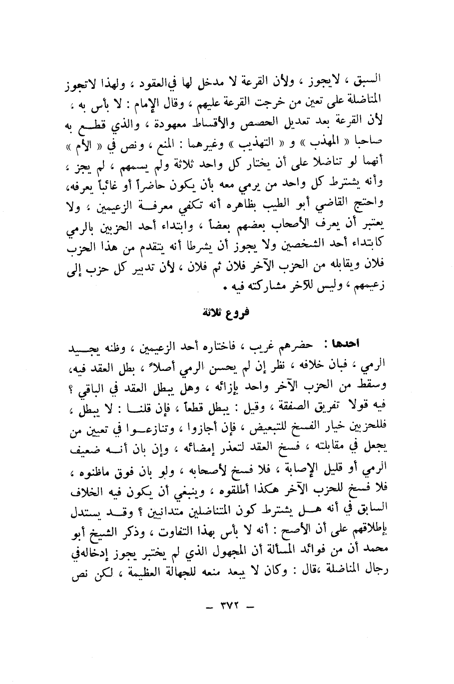 السَّبْقَ، لَا يَجُوزُ، وَلِأَنَّ الْقُرْعَةَ لَا مَدْخَلَ لَهَا فِي الْعُقُودِ، وَلِهَذَا لَا تَجُوزُ الْمُنَاضَلَةُ عَلَى تَعَيُّنِ مَنْ خَرَجَتِ الْقُرْعَةُ عَلَيْهِمْ، وَقَالَ الْإِمَامُ: لَا بَأْسَ بِهِ، لِأَنَّ الْقُرْعَةَ بَعْدَ تَعْدِيلِ الْحِصَصِ وَالْأَقْسَاطِ مَعْهُودَةٌ، وَالَّذِي قَطَعَ بِهِ صَاحِبَا «الْمُهَذَّبِ» «وَالتَّهْذِيبِ» وَغَيْرُهُمَا: الْمَنْعُ، وَنَصَّ فِي «الْأُمِّ» أَنَّهُمَا لَوْ تَنَاضَلَا عَلَى أَنْ يَخْتَارَ كُلُّ وَاحِدٍ ثَلَاثَةً وَلَمْ يُسَمِّهِمْ، لَمْ يَجُزْ، وَأَنَّهُ يَشْتَرِطُ كُلُّ وَاحِدٍ مَنْ يَرْمِي مَعَهُ بِأَنْ يَكُونَ حَاضِرًا أَوْ غَائِبًا يُعَرِّفُهُ، وَاحْتَجَّ الْقَاضِي أَبُو الطَّيِّبِ بِظَاهِرِهِ أَنَّهُ تَكْفِي مَعْرِفَةُ الزَّعِيمَيْنِ، وَلَا يُعْتَبَرُ أَنْ يُعَرِّفَ الْأَصْحَابُ بَعْضَهُمْ بَعْضًا، وَابْتِدَاءُ أَحَدِ الْحِزْبَيْنِ بِالرَّمْيِ كَابْتِدَاءِ أَحَدِ الشَّخْصَيْنِ وَلَا يَجُوزُ أَنْ يَشْرُطَا أَنَّهُ يَتَقَدَّمُ مِنْ هَذَا الْحِزْبِ فُلَانٌ وَيُقَابِلُهُ مِنَ الْحِزْبِ الْآخَرِ فُلَانٌ ثُمَّ فُلَانٌ، لِأَنَّ تَدْبِيرَ كُلِّ حِزْبٍ إِلَى زَعِيمِهِمْ، وَلَيْسَ لِلْآخَرِ مُشَارَكَتُهُ فِيهِ.