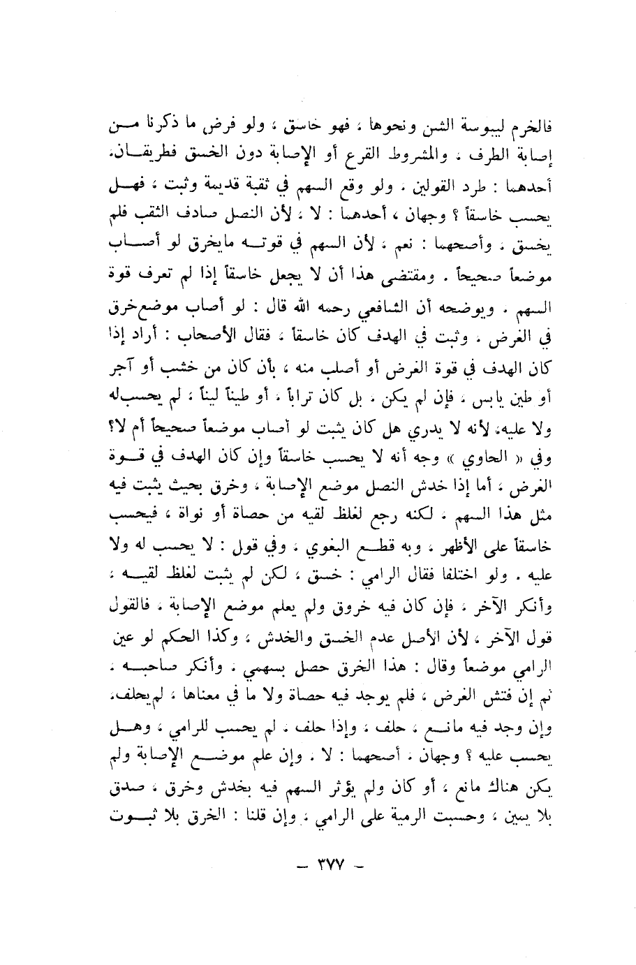 فَالْخَرْمُ لِيُبُوسَةِ الشَّنِّ وَنَحْوِهَا، فَهُوَ خَاسِقٌ، وَلَوْ فُرِضَ مَا ذَكَرْنَا مِنْ إِصَابَةِ الطَّرَفِ، وَالْمَشْرُوطُ الْقَرْعُ أَوِ الْإِصَابَةُ دُونَ الْخَسْقِ فَطَرِيقَانِ، أَحَدُهُمَا: طَرْدُ الْقَوْلَيْنِ، وَلَوْ وَقَعَ السَّهْمُ فِي ثُقْبَةٍ قَدِيمَةٍ وَثَبَتَ، فَهَلْ يُحْسَبُ خَاسِقًا؟ وَجْهَانِ، أَحَدُهُمَا: لَا، لِأَنَّ النَّصْلَ صَادَفَ الثُّقْبَ فَلَمْ يَخْسِقْ، وَأَصَحُّهُمَا: نَعَمْ، لِأَنَّ السَّهْمَ فِي قُوَّتِهِ مَا يَخْرُقُ لَوْ أَصَابَ مَوْضِعًا صَحِيحًا، وَمُقْتَضَى هَذَا أَنْ لَا يُجْعَلَ خَاسِقًا إِذَا لَمْ تُعْرَفُ قُوَّةُ السَّهْمِ، وَيُوَضِّحُهُ أَنَّ الشَّافِعِيَّ - رَحِمَهُ اللَّهُ - قَالَ: لَوْ أَصَابَ مَوْضِعَ خَرْقٍ فِي الْغَرَضِ، وَثَبَتَ فِي الْهَدَفِ كَانَ خَاسِقًا، فَقَالَ الْأَصْحَابُ: أَرَادَ إِذَا كَانَ الْهَدَفُ فِي قُوَّةِ الْغَرَضِ أَوْ أَصْلَبَ مِنْهُ، بِأَنْ كَانَ مِنْ خَشَبٍ أَوْ آجِرٍ أَوْ طِينٍ يَابِسٍ، فَإِنْ لَمْ يَكُنْ بَلْ كَانَ تُرَابًا، أَوْ طِينًا لَيِّنًا، لَمْ يُحْسَبْ لَهُ وَلَا عَلَيْهِ، لِأَنَّهُ لَا يَدْرِي هَلْ كَانَ يَثْبُتُ لَوْ أَصَابَ مَوْضِعًا صَحِيحًا أَمْ لَا؟ وَفِي «الْحَاوِي» وَجْهٌ أَنَّهُ لَا يُحْسَبُ خَاسِقًا وَإِنْ كَانَ الْهَدَفُ فِي قُوَّةِ الْغَرَضِ، أَمَّا إِذَا خَدَشَ النَّصْلُ مَوْضِعَ الْإِصَابَةِ، وَخَرَقَ بِحَيْثُ يَثْبُتُ فِيهِ مِثْلُ هَذَا السَّهْمِ، لَكِنَّهُ رَجَعَ لِغِلَظٍ لَقِيَهُ مِنْ حَصَاةٍ أَوْ نَوَاةٍ، فَيُحْسَبُ خَاسِقًا عَلَى الْأَظْهَرِ، وَبِهِ قَطَعَ الْبَغَوِيُّ، وَفِي قَوْلٍ: لَا يُحْسَبُ لَهُ وَلَا عَلَيْهِ، وَلَوِ اخْتَلَفَا فَقَالَ الرَّامِي: خَسَقَ، لَكِنْ لَمْ يَثْبُتْ لِغِلَظٍ لَقِيَهُ، وَأَنْكَرَ الْآخَرُ، فَإِنْ كَانَ فِيهِ خُرُوقٌ وَلَمْ يُعْلَمْ مَوْضِعُ الْإِصَابَةِ، فَالْقَوْلُ قَوْلُ الْآخَرِ، لِأَنَّ الْأَصْلَ عَدَمُ الْخَسْقِ وَالْخَدْشِ، وَكَذَا الْحُكْمُ لَوْ عَيَّنَ الرَّامِي مَوْضِعًا وَقَالَ: هَذَا الْخَرْقُ حَصَلَ بِسَهْمِي، وَأَنْكَرَ صَاحِبُهُ، ثُمَّ إِنْ فُتِّشَ الْغَرَضُ، فَلَمْ يُوجَدْ فِيهِ حَصَاةٌ وَلَا مَا فِي مَعْنَاهَا، لَمْ يَحْلِفْ، وَإِنْ وُجِدَ فِيهِ مَانِعٌ، حَلَفَ، وَإِذَا حَلَفَ، لَمْ يُحْسَبْ لِلرَّامِي، وَهَلْ يُحْسَبُ عَلَيْهِ؟ وَجْهَانِ، أَصَحُّهُمَا: لَا، وَإِنْ عُلِمَ مَوْضِعُ الْإِصَابَةِ وَلَمْ يَكُنْ هُنَاكَ مَانَعٌ، أَوْ كَانَ وَلَمْ يُؤَثِّرِ السَّهْمُ فِيهِ بِخَدْشٍ وَخَرْقٍ، صُدِّقَ بِلَا يَمِينٍ، وَحُسِبَتِ الرَّمْيَةُ عَلَى الرَّامِي، وَإِنْ قُلْنَا: الْخَرْقُ بِلَا ثُبُوتٍ