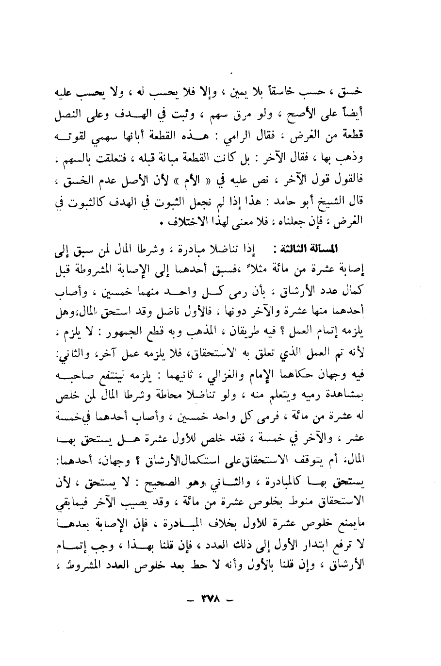 الْمَسْأَلَةُ الثَّالِثَةُ: إِذَا تَنَاضَلَا مُبَادَرَةً، وَشَرَطَا الْمَالَ لِمَنْ سَبَقَ إِلَى إِصَابَةِ عَشَرَةٍ مِنْ مِائَةٍ مَثَلًا، فَسَبَقَ أَحَدُهُمَا إِلَى الْإِصَابَةِ الْمَشْرُوطَةِ قَبْلَ كَمَالِ عَدَدِ الْأَرْشَاقِ، بِأَنْ رَمَى كُلُّ وَاحِدٍ مِنْهُمَا خَمْسِينَ، وَأَصَابَ أَحَدُهُمَا مِنْهَا عَشَرَةً وَالْآخَرُ دُونَهَا، فَالْأَوَّلُ نَاضِلٌ وَقَدِ اسْتَحَقَّ الْمَالَ، وَهَلْ يَلْزَمُهُ إِتْمَامُ الْعَمَلِ؟ فِيهِ طَرِيقَانِ، الْمَذْهَبُ وَبِهِ قَطَعَ الْجُمْهُورُ: لَا يَلْزَمُ، لِأَنَّهُ تَمَّ الْعَمَلُ الَّذِي تَعَلَّقَ بِهِ الِاسْتِحْقَاقُ، فَلَا يَلْزَمُهُ عَمَلٌ آخَرُ، وَالثَّانِي: فِيهِ وَجْهَانِ حَكَاهُمَا الْإِمَامُ وَالْغَزَالِيُّ، ثَانِيهِمَا: يَلْزَمُهُ لِيَنْتَفِعَ صَاحِبُهُ بِمُشَاهَدَةِ رَمْيِهِ وَيَتَعَلَّمَ مِنْهُ، وَلَوْ تَنَاضَلَا مُحَاطَةً وَشَرَطَا الْمَالَ لِمَنْ خَلُصَ لَهُ عَشَرَةٌ مِنْ مِائَةٍ، فَرَمَى كُلُّ وَاحِدٍ خَمْسِينَ، وَأَصَابَ أَحَدُهُمَا فِي خَمْسَةَ عَشَرَ، وَالْآخَرُ فِي خَمْسَةٍ، فَقَدْ خَلُصَ لِلْأَوَّلِ عَشَرَةٌ هَلْ يَسْتَحِقُّ بِهَا الْمَالَ، أَمْ يَتَوَقَّفُ الِاسْتِحْقَاقُ عَلَى اسْتِكْمَالِ الْأَرْشَاقِ؟ وَجْهَانِ، أَحَدُهُمَا: يَسْتَحِقُّ بِهَا كَالْمُبَادَرَةِ، وَالثَّانِي وَهُوَ الصَّحِيحُ: لَا يَسْتَحِقُّ، لِأَنَّ الِاسْتِحْقَاقَ مَنُوطٌ بِخُلُوصِ عَشَرَةٍ مِنْ مِائَةٍ، وَقَدْ يُصِيبُ الْآخَرُ فِيمَا بَقِيَ مَا يَمْنَعُ خُلُوصَ عَشَرَةٍ لِلْأَوَّلِ بِخِلَافِ الْمُبَادَرَةِ، فَإِنَّ الْإِصَابَةَ بَعْدَهَا لَا تَرْفَعُ ابْتِدَارَ الْأَوَّلِ إِلَى ذَلِكَ الْعَدَدِ، فَإِنْ قُلْنَا بِهَذَا، وَجَبَ إِتْمَامُ الْأَرْشَاقِ، وَإِنْ قُلْنَا بِالْأَوَّلِ وَأَنَّهُ لَا حَطَّ بَعْدَ خُلُوصِ الْعَدَدِ الْمَشْرُوطِ،
