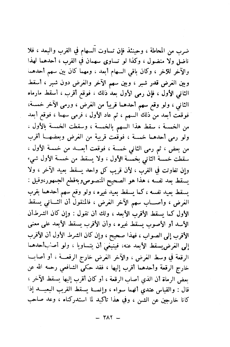 ضَرْبٌ مِنَ الْمُحَاطَةِ، وَحِينَئِذٍ فَإِنْ تَسَاوَتِ السِّهَامُ فِي الْقُرْبِ وَالْبُعْدِ، فَلَا نَاضِلَ وَلَا مَنْضُولَ، وَكَذَا لَوْ تَسَاوَى سَهْمَانِ فِي الْقُرْبِ، أَحَدُهُمَا لِهَذَا وَالْآخَرُ لِلْآخَرِ، وَكَانَ بَاقِي السِّهَامُ أَبْعَدَ، وَمَهْمَا كَانَ بَيْنَ سَهْمِ أَحَدِهِمَا وَبَيْنَ الْغَرَضِ قَدْرُ شِبْرٍ، وَبَيْنَ سَهْمِ الْآخَرِ وَالْغَرَضِ دُونَ شِبْرٍ، أَسْقَطَ الثَّانِي الْأَوَّلَ، فَإِنْ رَمَى الْأَوَّلُ بَعْدَ ذَلِكَ، فَوَقَعَ أَقْرَبُ، أَسْقَطَ مَا رَمَاهُ الثَّانِي، وَلَوْ وَقَعَ سَهْمُ أَحَدِهِمَا قَرِيبًا مِنَ الْغَرَضِ، وَرَمَى الْآخَرُ خَمْسَةً، فَوَقَعَتْ أَبْعَدَ مِنْ ذَلِكَ السَّهْمِ، ثُمَّ عَادَ الْأَوَّلُ، فَرَمَى سَهْمًا، فَوَقَعَ أَبْعَدَ مِنَ الْخَمْسَةِ، سَقَطَ هَذَا السَّهْمُ بِالْخَمْسَةِ، وَسَقَطَتِ الْخُمُسَةُ بِالْأَوَّلِ، وَلَوْ رَمَى أَحَدُهُمَا خَمْسَةً، فَوَقَعَتْ قَرِيبَةً مِنَ الْغَرَضِ وَبَعْضُهَا أَقْرَبُ مِنْ بَعْضٍ، ثُمَّ رَمَى الثَّانِي خَمْسَةً، فَوَقَعَتْ أَبْعَدَ مِنْ خَمْسَةِ الْأَوَّلِ، سَقَطَتْ خَمْسَةُ الثَّانِي بِخَمْسَةِ الْأَوَّلِ، وَلَا يَسْقُطُ مِنْ خَمْسَةِ الْأَوَّلِ شَيْءٌ وَإِنْ تَفَاوَتَتْ فِي الْقُرْبِ، لِأَنَّ قَرِيبَ كُلِّ وَاحِدٍ يُسْقِطُ بَعِيدَ الْآخَرِ، وَلَا يُسْقِطُ بُعْدَ نَفْسِهِ، هَذَا هُوَ الصَّحِيحُ الْمَنْصُوصُ وَبِهِ قَطَعَ الْجُمْهُورُ، وَقِيلَ: يُسْقِطُ بَعِيدَ نَفْسِهِ، كَمَا يُسْقِطُ بِعِيدَ غَيْرِهِ، وَلَوْ وَقَعَ سَهْمُ أَحَدِهِمَا بِقُرْبِ الْغَرَضِ، وَأَصَابَ سَهْمُ الْآخَرِ الْغَرَضَ، فَالْمَنْقُولُ أَنَّ الثَّانِيَ يُسْقِطُ الْأَوَّلَ كَمَا يُسْقِطُ الْأَقْرَبُ الْأَبْعَدَ، وَلَكَ أَنْ تَقُولَ: وَإِنْ كَانَ الشَّرْطُ أَنَّ الْأَسَدَ أَوِ الْأَصْوَبَ يُسْقِطُ غَيْرَهُ، وَأَنَّ الْأَقْرَبَ يُسْقِطُ الْأَبْعَدَ عَلَى مَعْنَى الْأَقْرَبِ إِلَى الصَّوَابِ، فَهَذَا صَحِيحٌ، وَإِنْ كَانَ الشَّرْطُ الْأَوَّلُ أَنَّ الْأَقْرَبَ إِلَى الْغَرَضِ يُسْقِطُ الْأَبْعَدَ عَنْهُ، فَيَنْبَغِي أَنْ يَتَسَاوَيَا، وَلَوْ أَصَابَ أَحَدُهُمَا الرُّقْعَةَ فِي وَسَطِ الْغَرَضِ، وَالْآخَرُ الْغَرَضَ خَارِجَ الرُّقْعَةِ، أَوْ أَصَابَا خَارِجَ الرُّقْعَةِ وَأَحَدُهمَا أَقْرَبُ إِلَيْهَا، فَقَدْ حَكَى الشَّافِعِيُّ - رَحِمَهُ اللَّهُ - عَنْ بَعْضِ الرُّمَاةِ أَنَّ الَّذِي أَصَابَ الرُّقْعَةَ، أَوْ كَانَ أَقْرَبَ إِلَيْهَا يُسْقِطُ الْآخَرَ، قَالَ: وَالْقِيَاسُ عِنْدِي أَنَّهُمَا سَوَاءٌ، وَإِنَّمَا يُسْقِطُ الْقَرِيبُ الْبَعِيدَ إِذَا كَانَا خَارِجَيْنِ عَنِ الشَّنِّ، وَفِي هَذَا تَأْكِيدٌ لِمَا اسْتَدْرَكْنَاهُ، وَعَدَّ صَاحِبُ