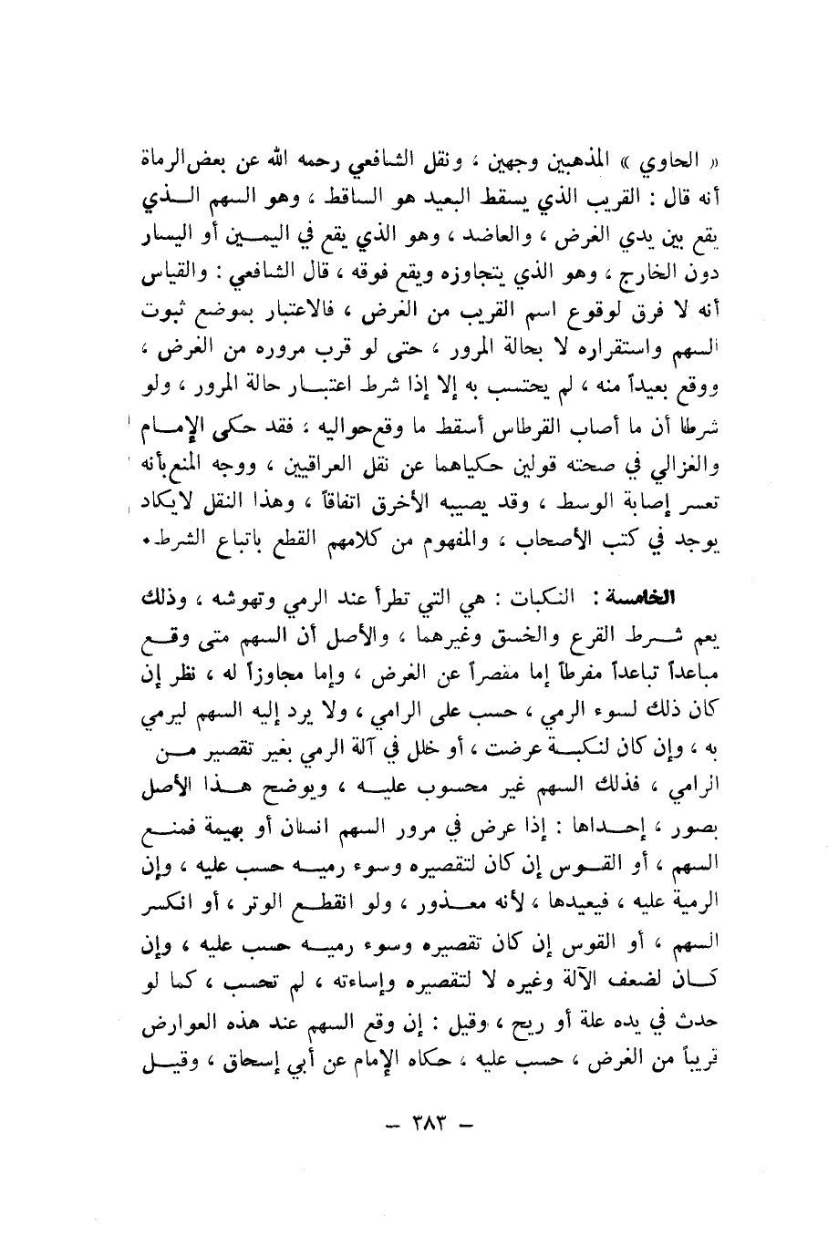 الْخَامِسَةُ: النَّكَبَاتُ: هِيَ الَّتِي تَطْرَأُ عِنْدَ الرَّمْيِ وَتُهَوِّشُهُ، وَذَلِكَ يَعُمُّ شَرْطَ الْقَرْعِ وَالْخَسْقِ وَغَيْرِهِمَا، وَالْأَصْلُ أَنَّ السَّهْمَ مَتَى وَقَعَ مُبَاعِدًا تَبَاعُدًا مُفْرِطًا إِمَّا مُقَصِّرًا عَنِ الْغَرَضِ، وَإِمَّا مُجَاوِزًا لَهُ، نُظِرَ إِنْ كَانَ ذَلِكَ لِسُوءِ الرَّمْيِ، حُسِبَ عَلَى الرَّامِي، وَلَا يُرَدُّ إِلَيْهِ السَّهْمُ لِيَرْمِيَ بِهِ، وَإِنْ كَانَ لِنَكْبَةٍ عَرَضَتْ، أَوْ خَلَلٍ فِي آلَةِ الرَّمْيِ بِغَيْرِ تَقْصِيرٍ مِنَ الرَّامِي، فَذَلِكَ السَّهْمُ غَيْرُ مَحْسُوبٍ عَلَيْهِ، وَيُوَضَّحُ هَذَا الْأَصْلُ بِصُوَرٍ، إِحْدَاهَا: إِذَا عَرَضَ فِي مُرُورِ السَّهْمِ إِنْسَانٌ أَوْ بَهِيمَةٌ فَمَنَعَ السَّهْمَ، أَوِ الْقَوْسَ إِنْ كَانَ لِتَقْصِيرِهِ وَسُوءِ رَمْيِهِ حُسِبَ عَلَيْهِ، وَإِنَّ الرَّمْيَةَ عَلَيْهِ، فَيُعِيدُهَا، لِأَنَّهُ مَعْذُورٌ، وَلَوِ انْقَطَعَ الْوَتَرُ، أَوِ انْكَسَرَ السَّهْمُ، أَوِ الْقَوْسُ إِنْ كَانَ تَقْصِيرُهُ وَسُوءُ رَمْيِهِ حُسِبَ عَلَيْهِ، وَإِنْ كَانَ لِضَعْفِ الْآلَةِ وَغَيْرِهِ لَا لِتَقْصِيرِهِ وَإِسَاءَتِهِ، لَمْ تُحْسَبْ، كَمَا لَوْ حَدَثَ فِي يَدِهِ عِلَّةٌ أَوْ رِيحٌ، وَقِيلَ: إِنْ وَقَعَ السَّهْمُ عِنْدَ هَذِهِ الْعَوَارِضِ قَرِيبًا مِنَ الْغَرَضِ، حُسِبَ عَلَيْهِ، حَكَاهُ الْإِمَامُ عَنْ أَبِي إِسْحَاقَ، وَقِيلَ