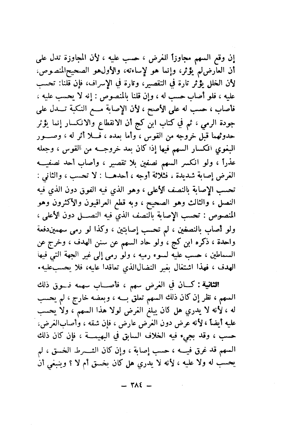 إِنْ وَقَعَ السَّهْمُ مُجَاوِزًا لِلْغَرَضِ، حُسِبَ عَلَيْهِ، لِأَنَّ الْمُجَاوَزَةَ تَدُلُّ عَلَى أَنَّ الْعَارِضَ لَمْ يُؤَثِّرْ، وَإِنَّمَا هُوَ لِإِسَاءَتِهِ، وَالْأَوَّلُ هُوَ الصَّحِيحُ الْمَنْصُوصُ، لِأَنَّ الْخَلَلَ يُؤَثِّرُ تَارَةً فِي التَّقْصِيرِ، وَتَارَةً فِي الْإِسْرَافِ، فَإِنْ قُلْنَا: تُحْسَبُ عَلَيْهِ، فَلَوْ أَصَابَ حُسِبَ لَهُ، وَإِنْ قُلْنَا بِالْمَنْصُوصِ: إِنَّهُ لَا يُحْسُبُ عَلَيْهِ، فَأَصَابَ، حُسِبَ لَهُ عَلَى الْأَصَحِّ، لِأَنَّ الْإِصَابَةَ مَعَ النَّكْبَةِ تَدُلُّ عَلَى جَوْدَةِ الرَّمْيِ، ثُمَّ فِي كِتَابِ ابْنِ كَجٍّ أَنَّ الِانْقِطَاعَ وَالِانْكِسَارَ إِنَّمَا يُؤَثِّرُ حُدُوثُهُمَا قَبْلَ خُرُوجِهِ مِنَ الْقَوْسِ، وَأَمَّا بَعْدَهُ، فَلَا أَثَرَ لَهُ، وَصَوَّرَ الْبَغَوِيُّ انْكِسَارَ السَّهْمِ فِيهَا إِذَا كَانَ بَعْدَ خُرُوجِهِ مِنَ الْقَوْسِ، وَجَعَلَهُ عُذْرًا، وَلَوِ انْكَسَرَ السَّهْمُ نِصْفَيْنِ بِلَا تَقْصِيرٍ، وَأَصَابَ أَحَدُ نِصْفَيْهِ الْغَرَضَ إِصَابَةً شَدِيدَةً، فَثَلَاثَةُ أَوْجُهٍ، أَحَدُهَا: لَا تُحْسَبُ، وَالثَّانِي: تُحْسَبُ الْإِصَابَةُ بِالنِّصْفِ الْأَعْلَى، وَهُوَ الَّذِي فِيهِ الْفَوْقُ دُونَ الَّذِي فِيهِ النَّصْلُ، وَالثَّالِثُ وَهُوَ الصَّحِيحُ، وَبِهِ قَطَعَ الْعِرَاقِيُّونَ وَالْأَكْثَرُونَ وَهُوَ الْمَنْصُوصُ: تُحْسَبُ الْإِصَابَةُ بِالنِّصْفِ الَّذِي فِيهِ النَّصْلُ دُونَ الْأَعْلَى، وَلَوْ أَصَابَ بِالنِّصْفَيْنِ، لَمْ تُحْسَبْ إِصَابَتَيْنِ، وَكَذَا لَوْ رَمَى سَهْمَيْنِ دُفْعَةً وَاحِدَةً، ذَكَرَهُ ابْنُ كَجٍّ، وَلَوْ حَادَ السَّهْمُ عَنْ سُنَنِ الْهَدَفِ، وَخَرَجَ عَنِ السِّمَاطَيْنِ، حُسِبَ عَلَيْهِ لِسُوءِ رَمْيِهِ، وَلَوْ رَمَى إِلَى غَيْرِ الْجِهَةِ الَّتِي فِيهَا الْهَدَفُ، فَهَذَا اشْتِغَالٌ بِغَيْرِ النِّضَالِ الَّذِي تَعَاقَدَا عَلَيْهِ، فَلَا يُحْسَبُ عَلَيْهِ.