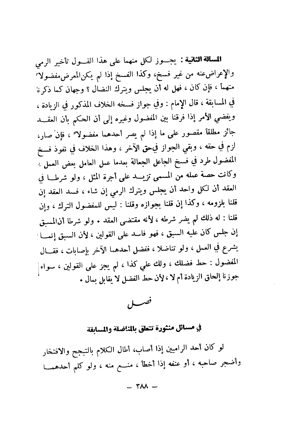 فِي مَسَائِلَ مَنْثُورَةٍ تَتَعَلَّقُ بِالْمُنَاضَلَةِ وَالْمُسَابَقَةِ