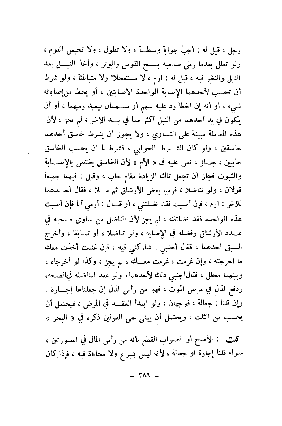 رَجُلٌ، قِيلَ لَهُ: أَجِبْ جَوَابًا وَسَطًا، وَلَا تُطَوِّلْ، وَلَا تَحْبِسِ الْقَوْمَ، وَلَوْ تُعَلِّلْ بَعْدَمَا رَمَى صَاحِبُهُ بِمَسْحِ الْقَوْسِ وَالْوَتَرِ، وَأَخْذِ النَّبْلِ بَعْدَ النَّبْلِ وَالنَّظَرِ فِيهِ، قِيلَ لَهُ: ارْمِ، لَا مُسْتَعْجِلًا وَلَا مُتَبَاطِئًا، وَلَوْ شَرَطَا أَنْ تُحْسَبَ لِأَحَدِهِمَا الْإِصَابَةُ الْوَاحِدَةُ الْإِصَابَتَيْنِ، أَوْ يُحَطُّ مِنْ إِصَابَاتِهِ شَيْءٌ، أَوْ أَنَّهُ إِنْ أَخْطَأَ رُدَّ عَلَيْهِ سَهْمٌ أَوْ سَهْمَانِ لِيُعِيدَ رَمْيَهُمَا، أَوْ أَنْ يَكُونَ فِي يَدِ أَحَدِهِمَا مِنَ النَّبْلِ أَكْثَرُ مِمَّا فِي يَدِ الْآخَرِ، لَمْ يَجُزْ، لِأَنَّ هَذِهِ الْمُعَامَلَةَ مُبَيَّنَةٌ عَلَى التَّسَاوِي، وَلَا يَجُوزُ أَنْ يَشْرُطَ خَاسِقُ أَحَدِهِمَا خَاسِقَيْنِ، وَلَوْ كَانَ الشَّرْطُ الْحَوَابِيَ، فَشَرَطَا أَنْ يَحْسِبَ الْخَاسِقَ حَابِيَيْنِ، جَازَ، نَصَّ عَلَيْهِ فِي «الْأُمِّ» لِأَنَّ الْخَاسِقَ يَخْتَصُّ بِالْإِصَابَةِ وَالثُّبُوتِ فَجَازَ أَنْ تُجْعَلَ تِلْكَ الزِّيَادَةُ مَقَامَ حَابٍ، وَقِيلَ: فِيهِمَا جَمِيعًا قَوْلَانِ، وَلَوْ تَنَاضَلَا فَرَمَيَا بَعْضَ الْأَرْشَاقِ ثُمَّ مَلَّا، فَقَالَ أَحَدُهُمَا لِلْآخَرِ: ارْمِ، فَإِنْ أَصَبْتَ فَقَدَ نَضَلْتَنِي، أَوْ قَالَ: أَرْمِي أَنَا فَإِنْ أَصَبْتُ هَذِهِ الْوَاحِدَةَ فَقْد نَضَلْتُكَ، لَمْ يَجُزْ لِأَنَّ النَّاضِلَ مَنْ سَاوَى صَاحِبَهُ فِي عَدَدِ الْأَرْشَاقِ وَفَضَلَهُ فِي الْإِصَابَةِ، وَلَوْ تَنَاضَلَا، أَوْ تَسَابَقَا، وَأَخْرَجَ السَّبْقُ أَحَدَهُمَا، فَقَالَ أَجْنَبِيٌّ: شَارِكْنِي فِيهِ، فَإِنْ غَنِمْتَ أَخَذْتُ مَعَكَ مَا أَخْرَجْتَهُ، وَإِنْ غَرِمْتَ، غَرِمْتُ مَعَكَ، لَمْ يَجُزْ، وَكَذَا لَوْ أَخْرَجَاهُ، وَبَيْنَهُمَا مُحَلِّلٌ، فَقَالَ أَجْنَبِيٌّ ذَلِكَ لِأَحَدِهِمَا. وَلَوْ عَقَدَ الْمُنَاضَلَةَ فِي الصِّحَّةِ، وَدَفَعَ الْمَالَ فِي مَرَضِ الْمَوْتِ، فَهُوَ مِنْ رَأْسِ الْمَالِ إِنْ جَعَلْنَاهَا إِجَارَةً، وَإِنْ قُلْنَا: جَعَالَةٌ، فَوَجْهَانِ، وَلَوِ ابْتَدَأَ الْعَقْدُ فِي الْمَرَضِ، فَيُحْتَمَلُ أَنْ يُحْسَبَ مِنَ الثُّلُثِ، وَيُحْتَمَلَ أَنْ يُبْنَى عَلَى الْقَوْلَيْنِ ذَكَرَهُ فِي «الْبَحْرِ» .