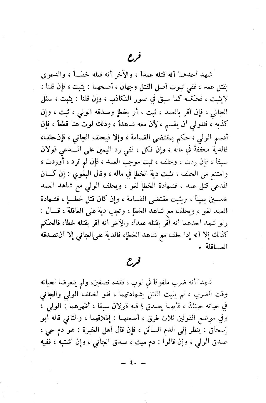 شَهِدَ أَحَدُهُمَا أَنَّهُ قَتَلَهُ عَمْدًا، وَالْآخَرُ أَنَّهُ قَتَلَهُ خَطَأً، وَالدَّعْوَى بِقَتْلِ عَمْدٍ، فَفِي ثُبُوتِ أَصْلِ الْقَتْلِ وَجْهَانِ، أَصَحُّهُمَا: يَثْبُتُ، فَإِنْ قُلْنَا: لَا يَثْبُتُ، فَحُكْمُهُ كَمَا سَبَقَ فِي صُوَرِ التَّكَاذُبِ، وَإِنْ قُلْنَا: يَثْبُتُ، سُئِلَ الْجَانِي، فَإِنْ أَقَرَّ بِالْعَمْدِ، ثَبَتَ، أَوْ بِخَطَأٍ وَصَدَّقَهُ الْوَلِيُّ، ثَبَتَ، وَإِنْ كَذَّبَهُ، فَلِلْوَلِيِّ أَنْ يُقْسِمَ ; لِأَنَّ مَعَهُ شَاهِدًا، وَذَلِكَ لَوْثٌ هُنَا قَطْعًا، فَإِنْ أَقْسَمَ الْوَلِيُّ، حُكِمَ بِمُقْتَضَى الْقَسَامَةِ، وَإِلَّا فَيَحْلِفُ الْجَانِي، فَإِنْ حَلَفَ، فَالدِّيَةُ مُخَفَّفَةٌ فِي مَالِهِ، وَإِنْ نَكَلَ، فَفِي رَدِّ الْيَمِينِ عَلَى الْمُدَّعِي قَوْلَانِ سَبَقَا، فَإِنْ رُدَّتْ، وَحَلَفَ، ثَبَتَ مُوجَبُ الْعَمْدِ، فَإِنْ لَمْ تَرِدْ، أَوْ رُدَّتْ، وَامْتَنَعَ مِنَ الْحَلِفِ، تَثْبُتُ دِيَةُ الْخَطَأِ فِي مَالِهِ، وَقَالَ الْبَغَوِيُّ: إِنْ كَانَ الْمُدَّعَى قَتْلَ عَمْدٍ، فَشَهَادَةُ الْخَطَأِ لَغْوٌ، وَيَحْلِفُ الْوَلِيُّ مَعَ شَاهِدِ الْعَمْدِ خَمْسِينَ يَمِينًا، وَيَثْبُتُ مُقْتَضَى الْقَسَامَةِ، وَإِنْ كَانَ قَتْلَ خَطَأٍ، فَشَهَادَةُ الْعَمْدِ لَغْوٌ، وَيَحْلِفُ مَعَ شَاهِدِ الْخَطَأِ، وَتَجِبُ دِيَةٌ عَلَى الْعَاقِلَةِ، قَالَ: وَلَوْ شَهِدَ أَحَدُهُمَا أَنَّهُ أَقَرَّ بِقَتْلِهِ عَمْدًا، وَالْآخَرُ أَنَّهُ أَقَرَّ بِقَتْلِهِ خَطَأً، فَالْحُكْمُ كَذَلِكَ إِلَّا أَنَّهُ إِذَا حَلَفَ مَعَ شَاهِدِ الْخَطَأِ، فَالدِّيَةُ عَلَى الْجَانِي إِلَّا أَنْ تُصَدِّقَهُ الْعَاقِلَةُ.