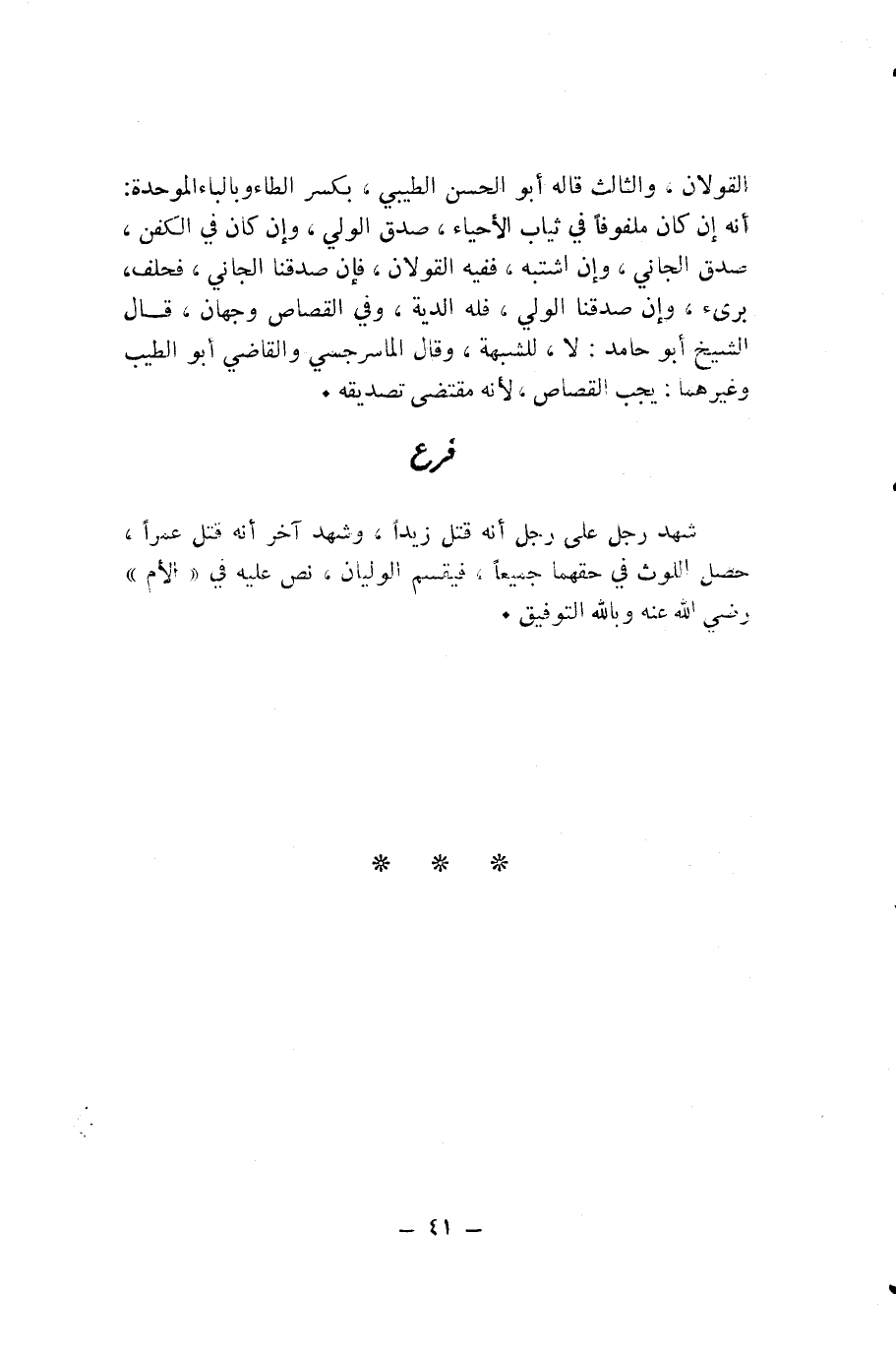 الْقَوْلَانِ، وَالثَّالِثُ قَالَهُ أَبُو الْحَسَنِ الطِّيبِيُّ، بِكَسْرِ الطَّاءِ وَبِالْبَاءِ الْمُوَحَّدَةِ: أَنَّهُ إِنْ كَانَ مَلْفُوفًا فِي ثِيَابِ الْأَحْيَاءِ، صُدِّقَ الْوَلِيُّ، وَإِنْ كَانَ فِي الْكَفَنِ، صُدِّقَ الْجَانِي، وَإِنِ اشْتَبَهَ، فَفِيهِ الْقَوْلَانِ، فَإِنْ صَدَّقْنَا الْجَانِيَ، فَحَلَفَ، بَرِئَ، وَإِنْ صَدَّقْنَا الْوَلِيَّ، فَلَهُ الدِّيَةُ، وَفِي الْقِصَاصِ وَجْهَانِ، قَالَ الشَّيْخُ أَبُو حَامِدٍ: لَا، لِلشُّبْهَةِ وَقَالَ الْمَاسَرْجِسِيُّ وَالْقَاضِي أَبُو الطَّيِّبُ وَغَيْرُهُمَا: يَجِبُ الْقِصَاصُ ; لِأَنَّهُ مُقْتَضَى تَصْدِيقِهِ.