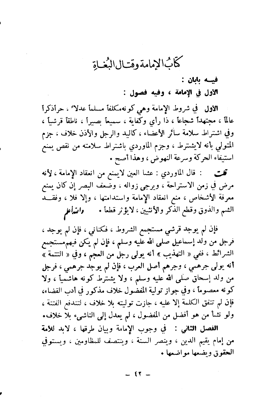 الْفَصْلُ الثَّانِي: فِي وُجُوبِ الْإِمَامَةِ وَبَيَانِ طُرُقِهَا، لَا بُدَّ لِلْأُمَّةِ مِنْ إِمَامٍ يُقِيمُ الدِّينَ، وَيَنْصُرُ السُّنَّةَ، وَيَنْتَصِفُ لِلْمَظْلُومِينَ، وَيَسْتَوْفِي الْحُقُوقَ وَيَضَعُهَا مَوَاضِعَهَا.