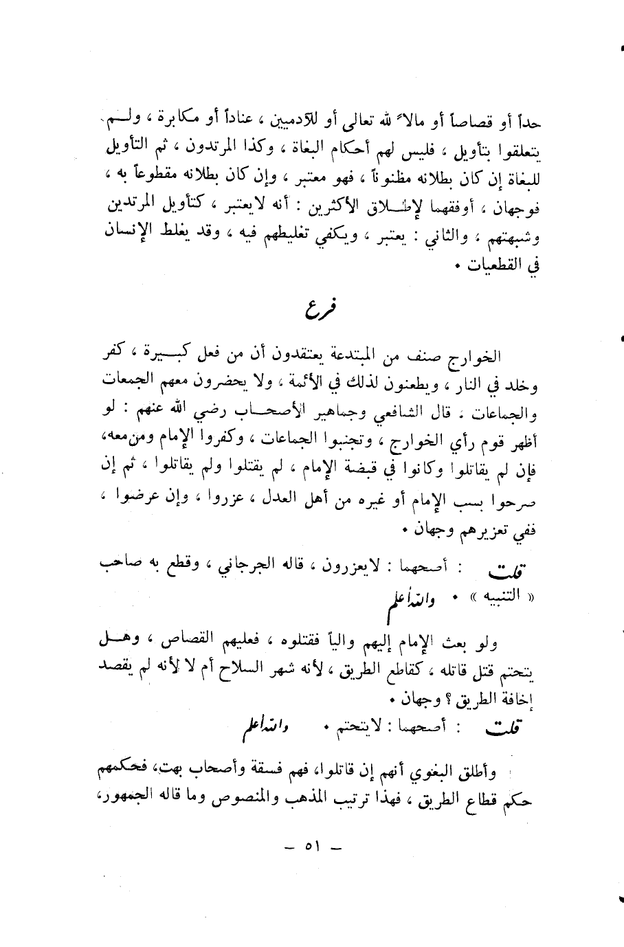 الْخَوَارِجُ صِنْفٌ مِنَ الْمُبْتَدِعَةِ يَعْتَقِدُونَ أَنَّ مَنْ فَعَلَ كَبِيرَةً كَفَرَ وَخُلِّدَ فِي النَّارِ، وَيَطْعَنُونَ لِذَلِكَ فِي الْأَئِمَّةِ، وَلَا يَحْضُرُونَ مَعَهُمُ الْجُمُعَاتِ وَالْجَمَاعَاتِ، قَالَ الشَّافِعِيُّ وَجَمَاهِيرُ الْأَصْحَابِ رَضِيَ اللَّهُ عَنْهُمْ: لَوْ أَظْهَرَ قَوْمٌ رَأْيَ الْخَوَارِجِ، وَتَجَنَّبُوا الْجَمَاعَاتِ، وَكَفَّرُوا الْإِمَامَ وَمَنْ مَعَهُ، فَإِنْ لَمْ يُقَاتِلُوا وَكَانُوا فِي قَبْضَةِ الْإِمَامِ، لَمْ يُقْتَلُوا وَلَمْ يُقَاتَلُوا، ثُمَّ إِنَّ صَرَّحُوا بِسَبِّ الْإِمَامِ أَوْ غَيْرِهِ مِنْ أَهْلِ الْعَدْلِ، عُزِّرُوا، وَإِنْ عَرَّضُوا، فَفِي تَعْزِيرِهِمْ وَجْهَانِ.