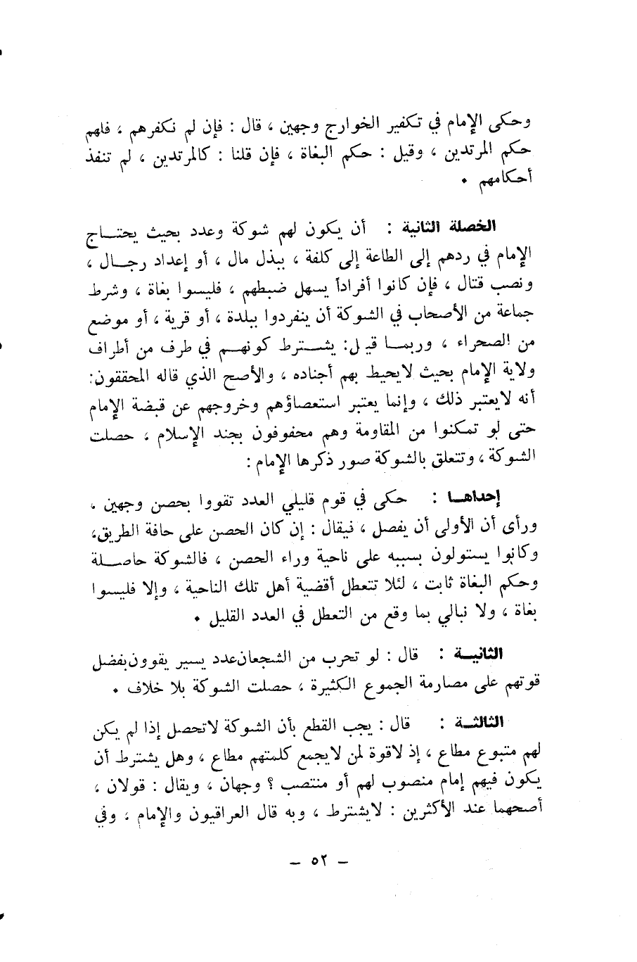 الْخَصْلَةُ الثَّانِيَةُ: أَنْ يَكُونَ لَهُمْ شَوْكَةٌ وَعَدَدٌ بِحَيْثُ يَحْتَاجُ الْإِمَامُ فِي رَدِّهِمْ إِلَى الطَّاعَةِ إِلَى كُلْفَةٍ، بِبَذْلِ مَالٍ، أَوْ إِعْدَادِ رِجَالٍ، وَنَصْبِ قِتَالٍ، فَإِنْ كَانُوا أَفْرَادًا يَسْهُلُ ضَبْطُهُمْ، فَلَيْسُوا بُغَاةً، وَشَرَطَ جَمَاعَةٌ مِنَ الْأَصْحَابِ فِي الشَّوْكَةِ أَنْ يَنْفَرِدُوا بِبَلْدَةٍ، أَوْ قَرْيَةٍ، أَوْ مَوْضِعٍ مِنَ الصَّحْرَاءِ، وَرُبَّمَا قِيلَ: يُشْتَرَطُ كَوْنُهُمْ فِي طَرَفٍ مِنْ أَطْرَافِ وِلَايَةِ الْإِمَامِ بِحَيْثُ لَا يُحِيطُ بِهِمْ أَجْنَادُهُ، وَالْأَصَحُّ الَّذِي قَالَهُ الْمُحَقِّقُونَ: أَنَّهُ لَا يُعْتَبَرُ ذَلِكَ، وَإِنَّمَا يُعْتَبَرُ اسْتِعْصَاؤُهُمْ وَخُرُوجُهُمْ عَنْ قَبْضَةِ الْإِمَامِ حَتَّى لَوْ تَمَكَّنُوا مِنَ الْمُقَاوَمَةِ وَهُمْ مَحْفُوفُونَ بِجُنْدِ الْإِسْلَامِ، حَصَلَتِ الشَّوْكَةُ، وَتَتَعَلَّقُ بِالشَّوْكَةِ صُوَرٌ ذَكَرَهَا الْإِمَامُ: