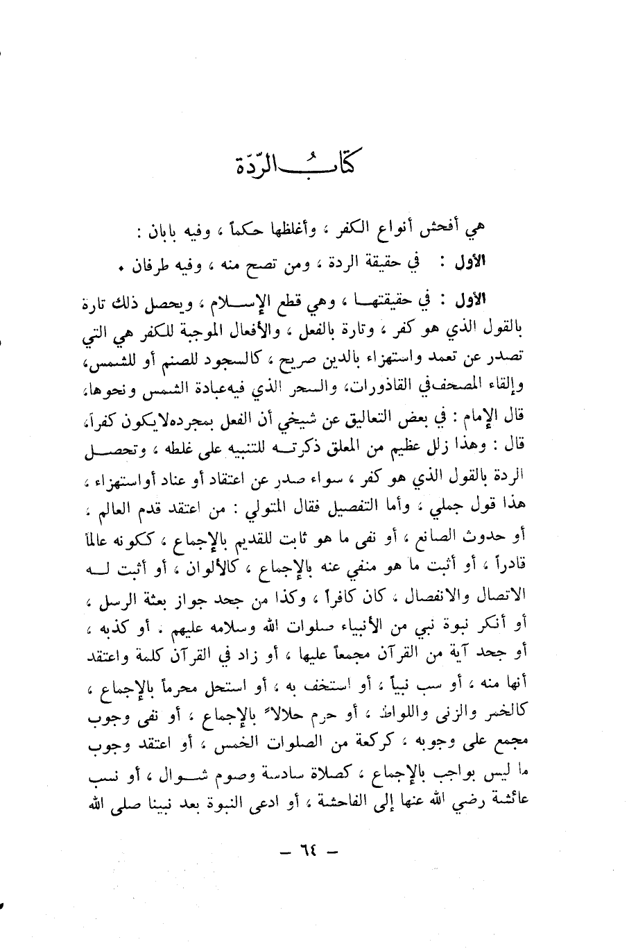 الْأَوَّلُ: فِي حَقِيقَتِهَا، وَهِيَ قَطْعُ الْإِسْلَامِ، وَيَحْصُلُ ذَلِكَ تَارَةً بِالْقَوْلِ الَّذِي هُوَ كُفْرٌ، وَتَارَةً بِالْفِعْلِ، وَالْأَفْعَالُ الْمُوجِبَةُ لِلْكُفْرِ هِيَ الَّتِي تَصْدُرُ عَنْ تَعَمُّدٍ وَاسْتِهْزَاءٍ بِالدِّينِ صَرِيحٍ، كَالسُّجُودِ لِلصَّنَمِ أَوْ لِلشَّمْسِ، وَإِلْقَاءِ الْمُصْحَفِ فِي الْقَاذُورَاتِ، وَالسِّحْرِ الَّذِي فِيهِ عِبَادَةُ الشَّمْسِ وَنَحْوِهَا، قَالَ الْإِمَامُ: فِي بَعْضِ التَّعَالِيقِ عَنْ شَيْخِي أَنَّ الْفِعْلَ بِمُجَرَّدِهِ لَا يَكُونُ كُفْرًا، قَالَ: وَهَذَا زَلَلٌ عَظِيمٌ مِنَ الْمُعَلِّقِ ذَكَرْتُهُ لِلتَّنْبِيهِ عَلَى غَلَطِهِ، وَتَحْصُلُ الرِّدَّةُ بِالْقَوْلِ الَّذِي هُوَ كُفْرٌ، سَوَاءٌ صَدَرَ عَنِ اعْتِقَادٍ أَوْ عِنَادٍ أَوِ اسْتِهْزَاءٍ، هَذَا قَوْلٌ جُمَلِيٌّ، وَأَمَّا التَّفْصِيلُ فَقَالَ الْمُتَوَلِّي: مَنِ اعْتَقَدَ قِدَمَ الْعَالَمِ، أَوْ حُدُوثَ الصَّانِعِ، أَوْ نَفَى مَا هُوَ ثَابِتٌ لِلْقَدِيمِ بِالْإِجْمَاعِ، كَكَوْنِهِ عَالِمًا قَادِرًا، أَوْ أَثْبَتَ مَا هُوَ مَنْفِيٌّ عَنْهُ بِالْإِجْمَاعِ، كَالْأَلْوَانِ، أَوْ أَثْبَتَ لَهُ الِاتِّصَالَ وَالِانْفِصَالَ، كَانَ كَافِرًا، وَكَذَا مَنْ جَحَدَ جَوَازَ بَعْثَةِ الرُّسُلِ، أَوْ أَنْكَرَ نُبُوَّةَ نَبِيٍّ مِنَ الْأَنْبِيَاءِ صَلَوَاتُ اللَّهِ وَسَلَامُهُ عَلَيْهِمْ، أَوْ كَذَّبَهُ، أَوْ جَحَدَ آيَةً مِنَ الْقُرْآنِ مُجْمَعًا عَلَيْهَا، أَوْ زَادَ فِي الْقُرْآنِ كَلِمَةً وَاعْتَقَدَ أَنَّهَا مِنْهُ، أَوْ سَبَّ نَبِيًّا، أَوِ اسْتَخَفَّ بِهِ، أَوِ اسْتَحَلَّ مُحَرَّمًا بِالْإِجْمَاعِ كَالْخَمْرِ وَاللِّوَاطِ، أَوْ حَرَّمَ حَلَالًا بِالْإِجْمَاعِ، أَوْ نَفَى وُجُوبَ مُجْمَعٍ عَلَى وُجُوبِهِ، كَرَكْعَةٍ مِنَ الصَّلَوَاتِ الْخَمْسِ، أَوِ اعْتَقَدَ وُجُوبَ مَا لَيْسَ بِوَاجِبٍ بِالْإِجْمَاعِ، كَصَلَاةٍ سَادِسَةٍ وَصَوْمِ شَوَّالٍ، أَوْ نَسَبَ عَائِشَةَ رَضِيَ اللَّهُ عَنْهَا إِلَى الْفَاحِشَةِ، أَوِ ادَّعَى النُّبُوَّةَ بَعْدَ نَبِيِّنَا صَلَّى اللَّهُ