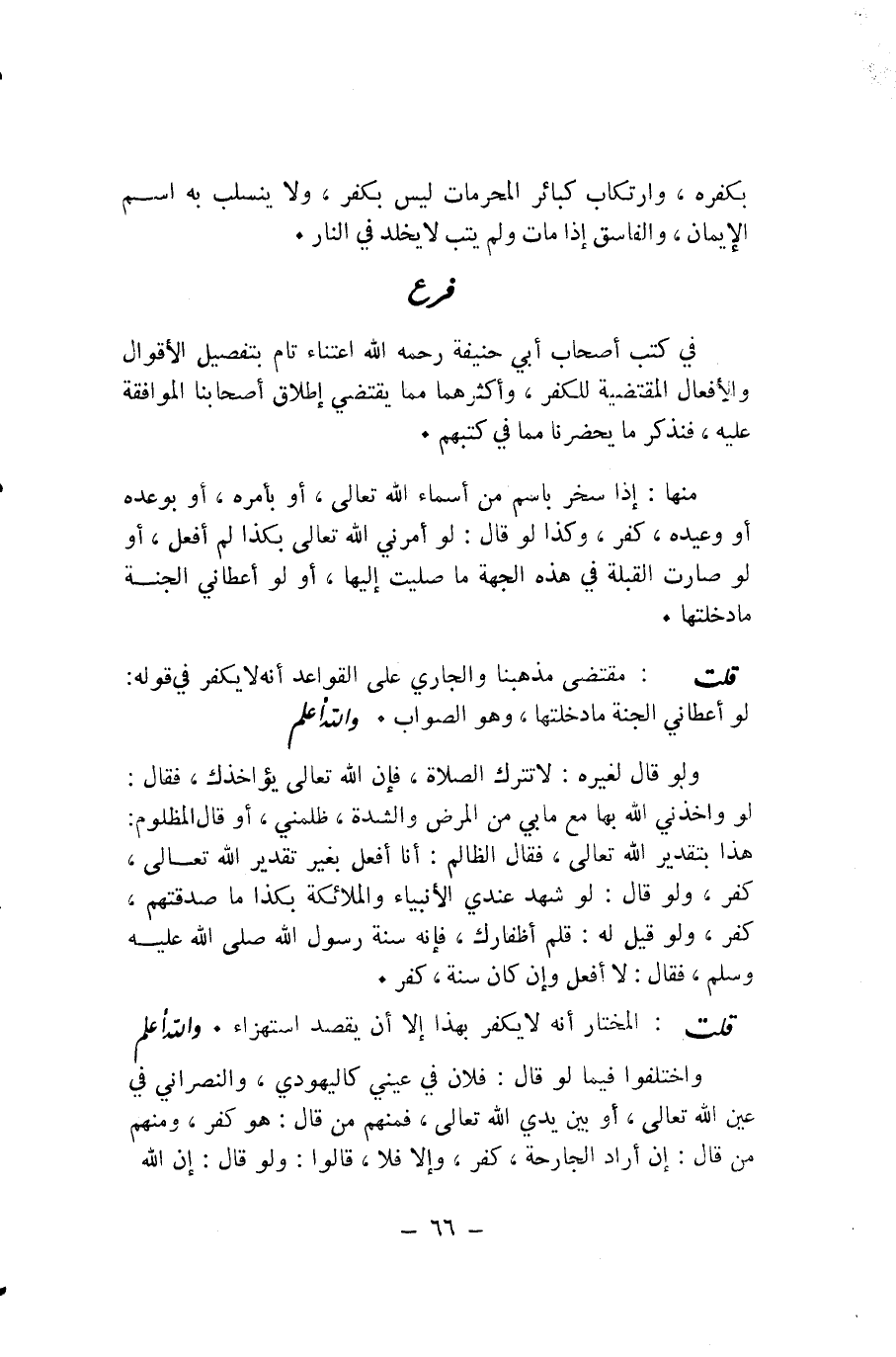 قُلْتُ: الْمُخْتَارُ أَنَّهُ لَا يَكْفُرُ بِهَذَا إِلَّا أَنْ يَقْصِدَ اسْتِهْزَاءً. وَاللَّهُ أَعْلَمُ.