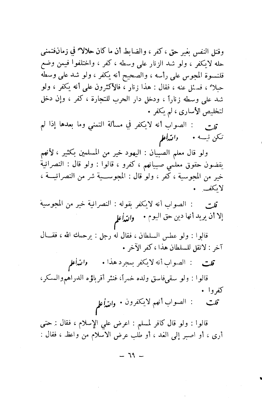 وَقَتْلَ النَّفْسِ بِغَيْرِ حَقٍّ، كَفَرَ، وَالضَّابِطُ أَنَّ مَا كَانَ حَلَالًا فِي زَمَانٍ فَتَمَنَّى حِلَّهُ لَا يَكْفُرُ، وَلَوْ شَدَّ الزُّنَّارَ عَلَى وَسَطِهِ، كَفَرَ، وَاخْتَلَفُوا فِيمَنْ وَضَعَ قَلَنْسُوَةَ الْمَجُوسِ عَلَى رَأْسِهِ، وَالصَّحِيحُ أَنَّهُ يَكْفُرُ، وَلَوْ شَدَّ عَلَى وَسَطِهِ حَبْلًا، فَسُئِلَ عَنْهُ، فَقَالَ: هَذَا زُنَّارٌ، فَالْأَكْثَرُونَ عَلَى أَنَّهُ يَكْفُرُ، وَلَوْ شَدَّ عَلَى وَسَطِهِ زُنَّارًا، وَدَخَلَ دَارَ الْحَرْبِ لِلتِّجَارَةِ، كَفَرَ، وَإِنْ دَخَلَ لِتَخْلِيصِ الْأُسَارَى، لَمْ يَكْفُرْ.