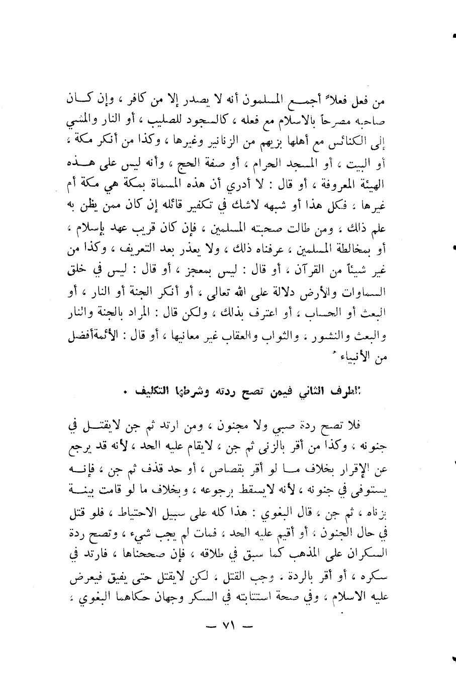 مَنْ فَعَلَ فِعْلًا أَجْمَعَ الْمُسْلِمُونَ أَنَّهُ لَا يَصْدُرُ إِلَّا مِنْ كَافِرٍ، وَإِنْ كَانَ صَاحِبُهُ مُصَرِّحًا بِالْإِسْلَامِ مَعَ فِعْلِهِ، كَالسُّجُودِ لِلصَّلِيبِ، أَوِ النَّارِ وَالْمَشْيِ إِلَى الْكَنَائِسِ مَعَ أَهْلِهَا بِزِيِّهِمْ مِنَ الزُّنَّانِيرِ وَغَيْرِهَا، وَكَذَا مَنْ أَنْكَرَ مَكَّةَ، أَوِ الْبَيْتَ، أَوِ الْمَسْجِدَ الْحَرَامَ، أَوْ صِفَةَ الْحَجِّ، وَأَنَّهُ لَيْسَ عَلَى هَذِهِ الْهَيْئَةِ الْمَعْرُوفَةِ، أَوْ قَالَ: لَا أَدْرِي أَنَّ هَذِهِ الْمُسَمَّاةَ بِمَكَّةَ هِيَ مَكَّةُ أَمْ غَيْرُهَا، فَكُلُّ هَذَا أَوْ شَبَهُهُ لَا شَكَّ فِي تَكْفِيرِ قَائِلِهِ إِنْ كَانَ مِمَّنْ يُظَنُّ بِهِ عِلْمُ ذَلِكَ، وَمَنْ طَالَتْ صُحْبَتُهُ الْمُسْلِمِينَ، فَإِنْ كَانَ قَرِيبَ عَهْدٍ بِإِسْلَامٍ، أَوْ بِمُخَالَطَةِ الْمُسْلِمِينَ، عَرَّفْنَاهُ ذَلِكَ، وَلَا يُعْذَرُ بَعْدَ التَّعْرِيفِ، وَكَذَا مَنْ غَيَّرَ شَيْئًا مِنَ الْقُرْآنِ، أَوْ قَالَ: لَيْسَ بِمُعْجِزٍ، أَوْ قَالَ: لَيْسَ فِي خَلْقِ السَّمَاوَاتِ وَالْأَرْضِ دَلَالَةٌ عَلَى اللَّهِ تَعَالَى، أَوْ أَنْكَرَ الْجَنَّةَ أَوِ النَّارَ، أَوِ الْبَعْثَ أَوِ الْحِسَابَ، أَوِ اعْتَرَفَ بِذَلِكَ، وَلَكِنْ قَالَ: الْمُرَادُ بِالْجَنَّةِ وَالنَّارِ وَالْبَعْثِ وَالنُّشُورِ، وَالثَّوَابِ وَالْعِقَابِ غَيْرُ مَعَانِيهَا، أَوْ قَالَ: الْأَئِمَّةُ أَفْضَلُ مِنَ الْأَنْبِيَاءِ.