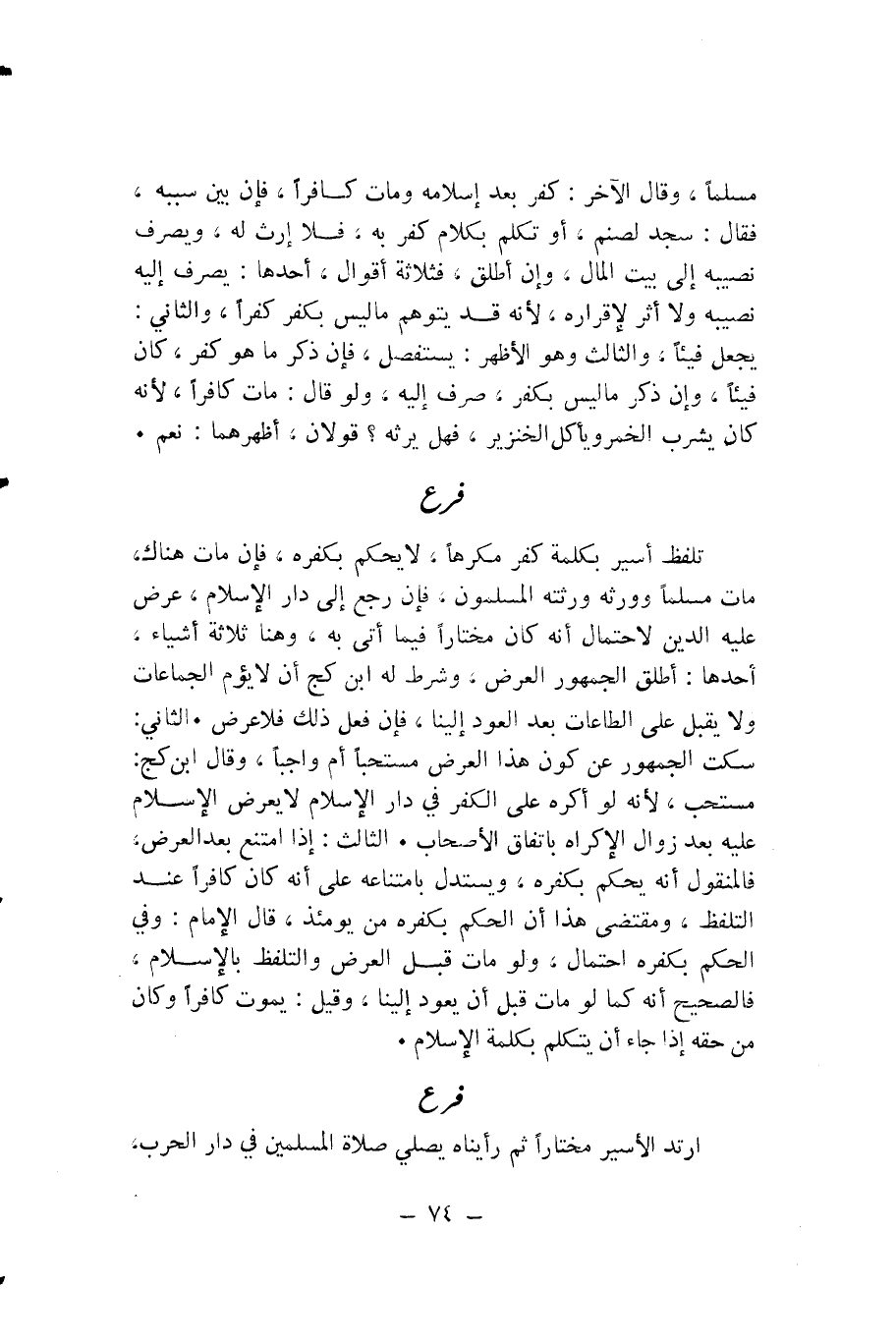 تَلَفَّظَ أَسِيرٌ بِكَلِمَةِ كُفْرٍ مُكْرَهًا، لَا يُحْكَمُ بِكُفْرِهِ، فَإِنْ مَاتَ هُنَاكَ، مَاتَ مُسْلِمًا وَوَرِثَهُ وَرَثَتُهُ الْمُسْلِمُونَ، فَإِنْ رَجَعَ إِلَى دَارِ الْإِسْلَامِ، عُرِضَ عَلَيْهِ الدِّينُ لِاحْتِمَالِ أَنَّهُ كَانَ مُخْتَارًا فِيمَا أَتَى بِهِ، وَهُنَا ثَلَاثَةُ أَشْيَاءَ، أَحَدُهَا: أَطْلَقَ الْجُمْهُورُ الْعَرْضَ، وَشَرَطَ لَهُ ابْنُ كَجٍّ أَنْ لَا يَؤُمَّ الْجَمَاعَاتِ وَلَا يُقْبِلَ عَلَى الطَّاعَاتِ بَعْدَ الْعَوْدِ إِلَيْنَا، فَإِنْ فَعَلَ ذَلِكَ فَلَا عَرْضَ.