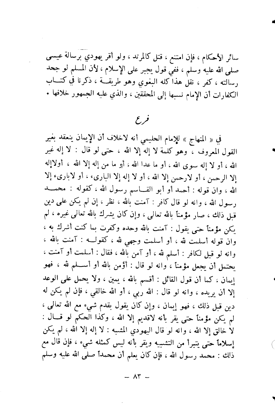 فِي «الْمِنْهَاجِ» لِلْإِمَامِ الْحَلِيمِيِّ أَنَّهُ لَا خِلَافَ أَنَّ الْإِيمَانَ يَنْعَقِدُ بِغَيْرِ الْقَوْلِ الْمَعْرُوفِ، وَهُوَ كَلِمَةُ لَا إِلَهَ إِلَّا اللَّهُ، حَتَّى لَوْ قَالَ: لَا إِلَهَ غَيْرُ اللَّهِ، أَوْ لَا إِلَهَ سِوَى اللَّهِ، أَوْ مَا عَدَا اللَّهَ، أَوْ مَا مِنْ إِلَهٍ إِلَّا اللَّهُ، أَوْ لَا إِلَهَ إِلَّا الرَّحْمَنُ، أَوْ لَا رَحْمَنَ إِلَّا اللَّهُ، أَوْ لَا إِلَهَ إِلَّا الْبَارِئُ، أَوْ لَا بَارِئَ إِلَّا اللَّهُ، وَأَنَّ قَوْلَهُ: أَحْمَدُ أَوْ أَبُو الْقَاسِمِ رَسُولُ اللَّهِ، كَقَوْلِهِ: مُحَمَّدٌ رَسُولُ اللَّهِ، وَأَنَّهُ لَوْ قَالَ كَافِرٌ: آمَنْتُ بِاللَّهِ، نُظِرَ، إِنْ لَمْ يَكُنْ عَلَى دِينٍ قَبْلَ ذَلِكَ، صَارَ مُؤْمِنًا بِاللَّهِ تَعَالَى، وَإِنْ كَانَ يُشْرِكُ بِاللَّهِ تَعَالَى غَيْرَهُ، لَمْ يَكُنْ مُؤْمِنًا حَتَّى يَقُولَ: آمَنْتُ بِاللَّهِ وَحْدَهُ وَكَفَرْتُ بِمَا كُنْتُ أُشْرِكُ بِهِ، وَأَنَّ قَوْلَهُ أَسْلَمْتُ لِلَّهِ، أَوْ أَسْلَمْتُ وَجْهِي لِلَّهِ، كَقَوْلِهِ: آمَنْتُ بِاللَّهِ، وَأَنَّهُ لَوْ قِيلَ لِكَافِرٍ: أَسْلِمْ لِلَّهِ، أَوْ آمِنْ بِاللَّهِ، فَقَالَ: أَسْلَمْتُ أَوْ آمَنْتُ، يُحْتَمَلُ أَنْ يُجْعَلَ مُؤْمِنًا، وَأَنَّهُ لَوْ قَالَ: أُؤْمِنُ بِاللَّهِ أَوْ أُسْلِمُ لِلَّهِ، فَهُوَ إِيمَانٌ، كَمَا أَنَّ قَوْلَ الْقَائِلِ: أُقْسِمُ بِاللَّهِ، يَمِينٌ، وَلَا يُحْمَلُ عَلَى الْوَعْدِ إِلَّا أَنْ يُرِيدَهُ، وَأَنَّهُ لَوْ قَالَ: اللَّهُ رَبِّي، أَوِ اللَّهُ خَالِقِي، فَإِنْ لَمْ يَكُنْ لَهُ دِينٌ قَبْلَ ذَلِكَ، فَهُوَ إِيمَانٌ، وَإِنْ كَانَ يَقُولُ بِقِدَمِ شَيْءٍ مَعَ اللَّهِ تَعَالَى، لَمْ يَكُنْ مُؤْمِنًا حَتَّى يُقِرَّ بِأَنَّهُ لَا قَدِيمَ إِلَّا اللَّهُ، وَكَذَا الْحُكْمُ لَوْ قَالَ: لَا خَالِقَ إِلَّا اللَّهُ، وَأَنَّهُ لَوْ قَالَ الْيَهُودِيُّ الْمُشَبِّهُ: لَا إِلَهَ إِلَّا اللَّهُ، لَمْ يَكُنْ إِسْلَامًا حَتَّى يَتَبَرَّأَ مِنَ التَّشْبِيهِ وَيُقِرَّ بِأَنَّهُ لَيْسَ كَمِثْلِهِ شَيْءٌ، فَإِنْ قَالَ مَعَ ذَلِكَ: مُحَمَّدٌ رَسُولُ اللَّهِ، فَإِنْ كَانَ يَعْلَمُ أَنَّ مُحَمَّدًا صَلَّى اللَّهُ عَلَيْهِ وَسَلَّمَ،