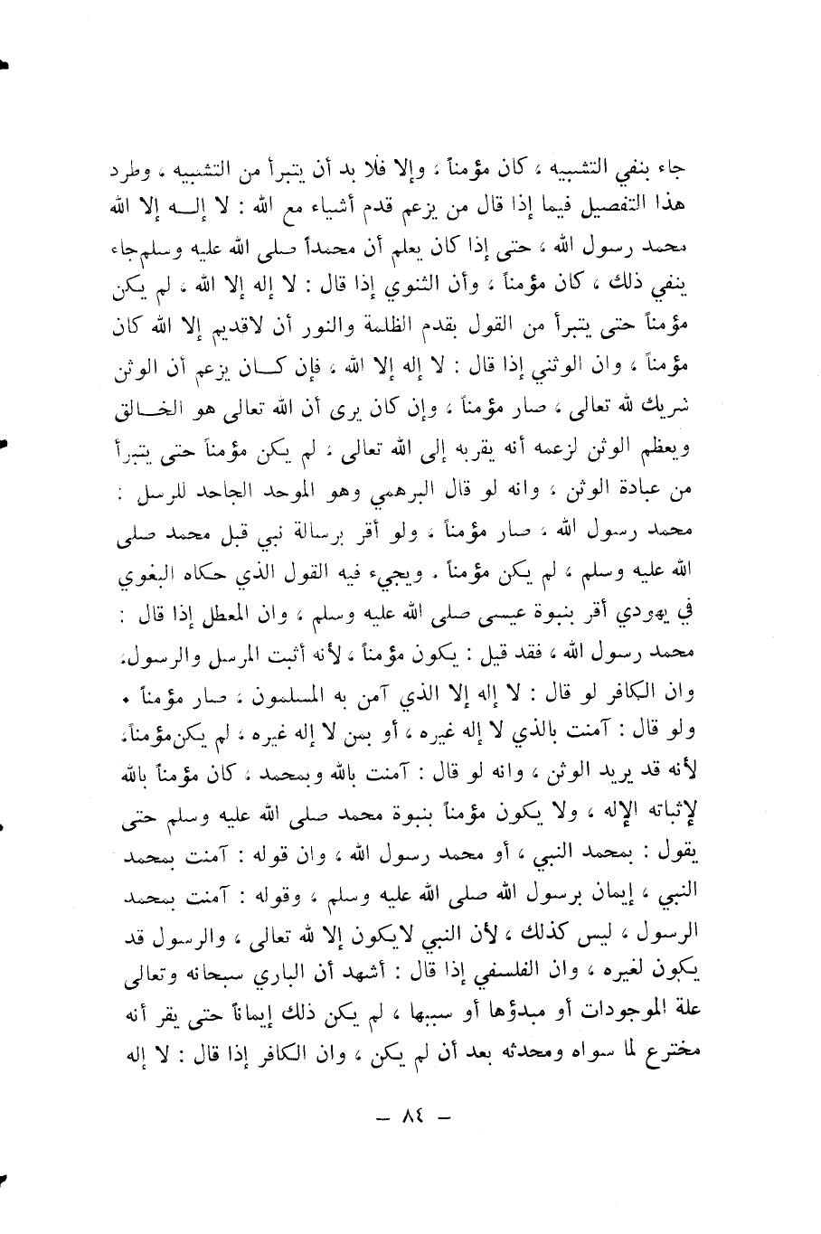 جَاءَ بِنَفْيِ التَّشْبِيهِ، كَانَ مُؤْمِنًا، وَإِلَّا فَلَا بُدَّ أَنْ يَتَبَرَّأَ مِنَ التَّشْبِيهِ، وَطَرْدِ هَذَا التَّفْصِيلِ فِيمَا إِذَا قَالَ مَنْ يَزْعُمُ قِدَمَ أَشْيَاءَ مَعَ اللَّهِ: لَا إِلَهَ إِلَّا اللَّهُ مُحَمَّدٌ رَسُولُ اللَّهِ، حَتَّى إِذَا كَانَ يَعْلَمُ أَنَّ مُحَمَّدًا صَلَّى اللَّهُ عَلَيْهِ وَسَلَّمَ جَاءَ يَنْفِي ذَلِكَ، كَانَ مُؤْمِنًا، وَأَنَّ الثَّنَوِيَّ إِذَا قَالَ: لَا إِلَهَ إِلَّا اللَّهُ، لَمْ يَكُنْ مُؤْمِنًا حَتَّى يَتَبَرَّأَ مِنَ الْقَوْلِ بِقِدَمِ الظُّلْمَةِ وَالنُّورِ أَنْ لَا قَدِيمَ إِلَّا اللَّهُ كَانَ مُؤْمِنًا، وَأَنَّ الْوَثَنِيَّ إِذَا قَالَ: لَا إِلَهَ إِلَّا اللَّهُ، فَإِنْ كَانَ يَزْعُمُ أَنَّ الْوَثَنَ شَرِيكٌ لِلَّهِ تَعَالَى، صَارَ مُؤْمِنًا.