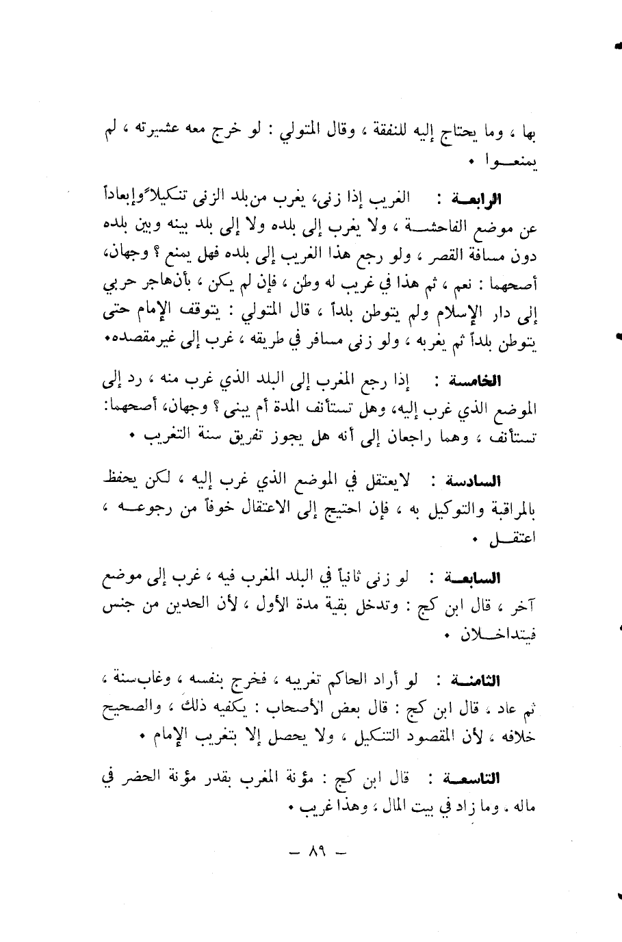 الرَّابِعَةُ: الْغَرِيبُ إِذَا زَنَى، يُغَرَّبُ مِنْ بَلَدِ الزِّنَا تَنْكِيلًا وَإِبْعَادًا عَنْ مَوْضِعِ الْفَاحِشَةِ، لَا يُغَرَّبُ إِلَى بَلَدِهِ وَلَا إِلَى بَلَدٍ بَيْنَهُ وَبَيْنَ بَلَدِهِ دُونَ مَسَافَةِ الْقَصْرِ، وَلَوْ رَجَعَ هَذَا الْغَرِيبُ إِلَى بَلَدِهِ فَهَلْ يُمْنَعُ؟ وَجْهَانِ، أَصَحُّهُمَا: نَعَمْ، ثُمَّ هَذَا فِي غَرِيبٍ لَهُ وَطَنٌ، فَإِنْ لَمْ يَكُنْ، بِأَنْ هَاجَرَ حَرْبِيٌّ إِلَى دَارِ الْإِسْلَامِ وَلَمْ يَتَوَطَّنْ بَلَدًا، قَالَ الْمُتَوَلِّي: يَتَوَقَّفُ الْإِمَامُ حَتَّى يَتَوَطَّنَ بَلَدًا ثُمَّ يُغَرِّبُهُ، وَلَوْ زَنَى مُسَافِرٌ فِي طَرِيقِهِ، غُرِّبَ إِلَى غَيْرِ مَقْصِدِهِ.