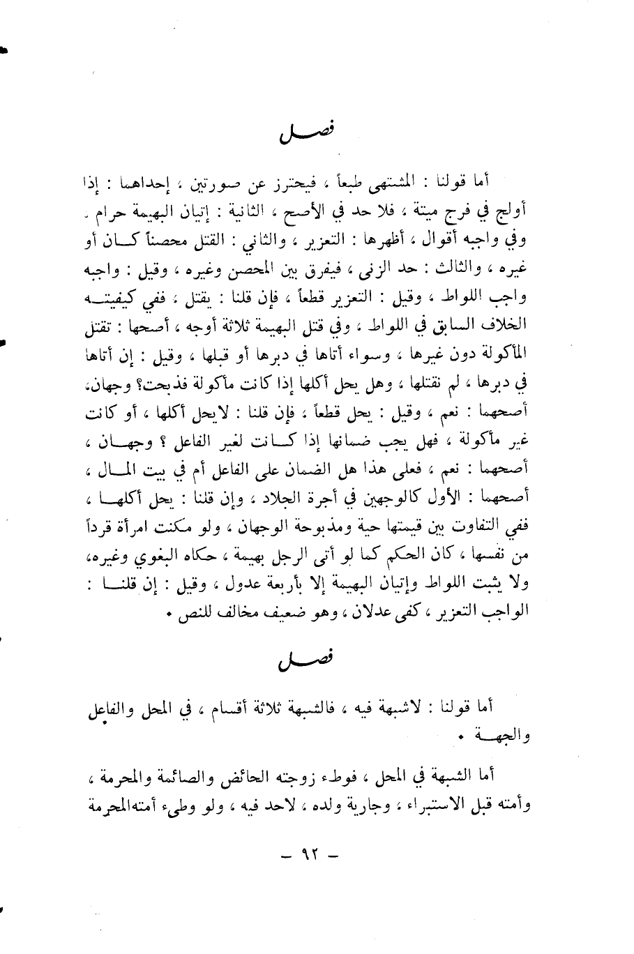 أَمَّا قَوْلُنَا: الْمُشْتَهِي طَبْعًا، فَيَحْتَرِزُ عَنْ صُورَتَيْنِ إِحْدَاهُمَا: إِذَا أَوْلَجَ فِي فَرْجِ مَيْتَةٍ، فَلَا حَدَّ فِي الْأَصَحِّ، الثَّانِيَةُ: إِتْيَانُ الْبَهِيمَةِ حَرَامٌ، وَفِي وَاجِبِهِ أَقْوَالٌ، أَظْهَرُهَا: التَّعْزِيرُ، وَالثَّانِي: الْقَتْلُ مُحْصَنًا كَانَ أَوْ غَيْرَهُ، وَالثَّالِثُ: حَدُّ الزِّنَا، فَيُفَرَّقُ بَيْنَ الْمُحْصَنِ وَغَيْرِهِ، وَقِيلَ: وَاجِبُهُ وَاجِبُ اللِّوَاطِ، وَقِيلَ: التَّعْزِيزُ قَطْعًا، فَإِنْ قُلْنَا: يُقْتَلُ، فَفِي كَيْفِيَّتِهِ الْخِلَافُ السَّابِقُ فِي اللِّوَاطِ، وَفِي قَتْلِ الْبَهِيمَةِ ثَلَاثَةُ أَوْجُهٍ، أَصَحُّهُمَا: تُقْتَلُ الْمَأْكُولَةُ دُونَ غَيْرِهَا، وَسَوَاءٌ أَتَاهَا فِي دُبُرِهَا أَوْ قُبُلِهَا، وَقِيلَ: إِنْ أَتَاهَا فِي دُبُرِهَا، لَمْ نَقْتُلْهَا، وَهَلْ يَحِلُّ أَكْلُهَا إِذَا كَانَتْ مَأْكُولَةً فَذُبِحَتْ؟ وَجْهَانِ، أَصَحُّهُمَا: نَعَمْ، وَقِيلَ: يَحِلُّ قَطْعًا، فَإِنْ قُلْنَا: لَا يَحِلُّ أَكْلُهَا، أَوْ كَانَتْ غَيْرَ مَأْكُولَةٍ، فَهَلْ يَجِبُ ضَمَانُهَا إِذَا كَانَتْ لِغَيْرِ الْفَاعِلِ؟ وَجْهَانِ.