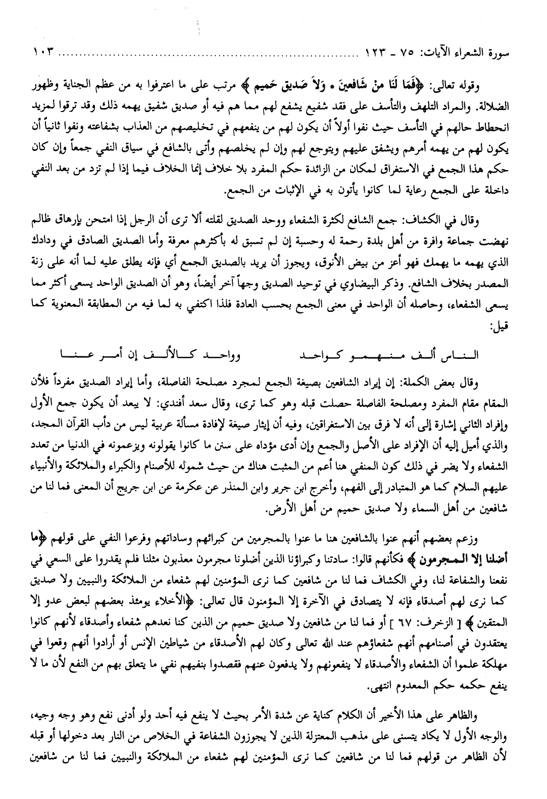 وقال بعض الكلمة: إن إيراد الشافعين بصيغة الجمع لمجرد مصلحة الفاصلة، وأما إيراد الصديق مفردا فلأن المقام مقام المفرد ومصلحة الفاصلة حصلت قبله وهو كما ترى، وقال سعد أفندي: لا يبعد أن يكون جمع الأول وإفراد الثاني إشارة إلى أنه لا فرق بين الاستغراقين، وفيه أن إيثار صيغة لإفادة مسألة عربية ليس من دأب القرآن المجد، والذي أميل إليه أن الإفراد على الأصل والجمع وإن أدى مؤداه على سنن ما كانوا يقولونه ويزعمونه في الدنيا من تعدد الشفعاء ولا يضر في ذلك كون المنفي هنا أعم من المثبت هناك من حيث شموله للأصنام والكبراء والملائكة والأنبياء عليهم السلام كما هو المتبادر إلى الفهم، وأخرج ابن جرير وابن المنذر عن عكرمة عن ابن جريج أن المعنى فما لنا من شافعين من أهل السماء ولا صديق حميم من أهل الأرض.