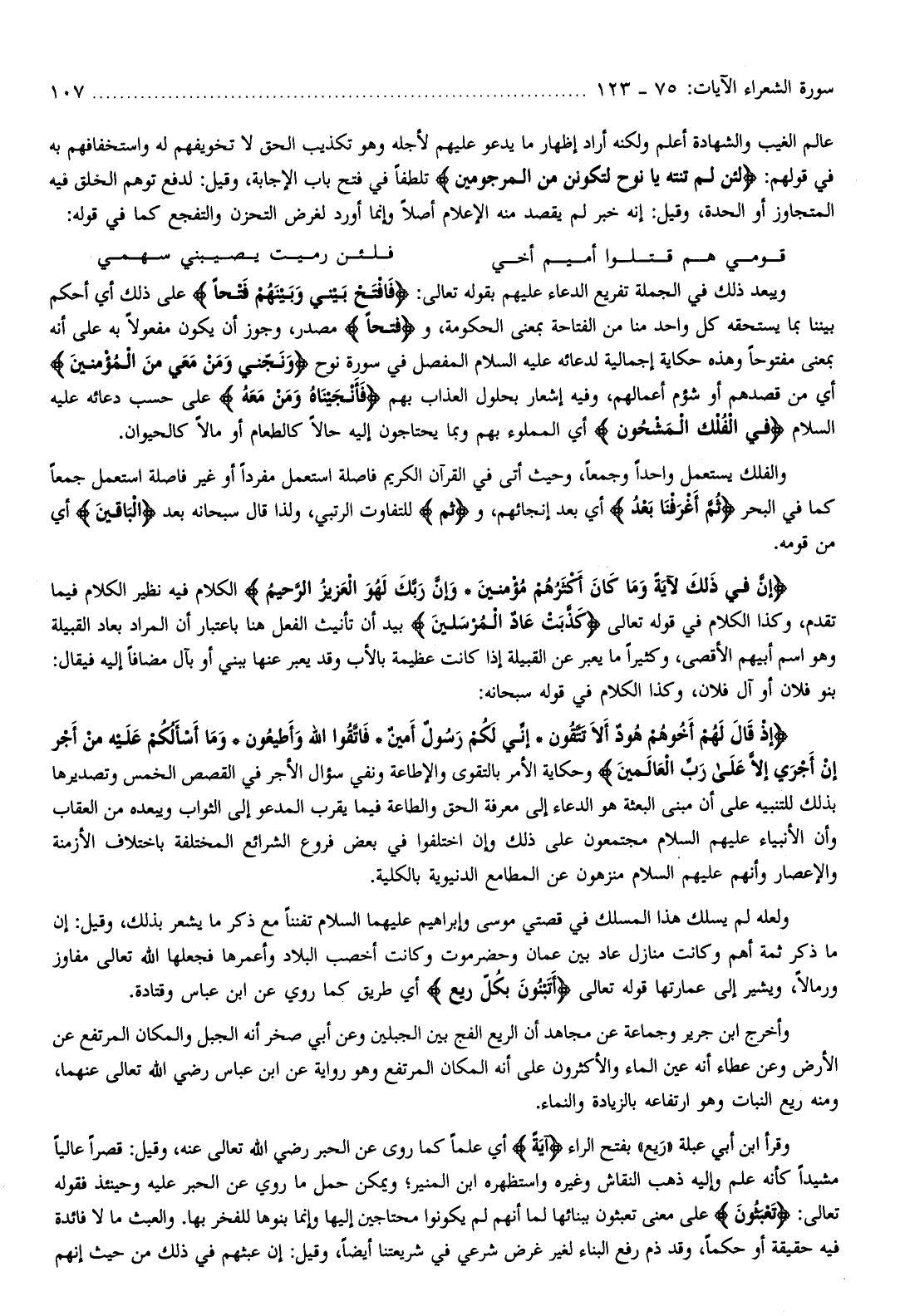 إِنَّ فِي ذلِكَ لَآيَةً وَما كانَ أَكْثَرُهُمْ مُؤْمِنِينَ وَإِنَّ رَبَّكَ لَهُوَ الْعَزِيزُ الرَّحِيمُ الكلام فيه نظير الكلام فيما تقدم، وكذا الكلام في قوله تعالى كَذَّبَتْ عادٌ الْمُرْسَلِينَ بيد أن تأنيث الفعل هنا باعتبار أن المراد بعاد القبيلة وهو اسم أبيهم الأقصى، وكثيرا ما يعبر عن القبيلة إذا كانت عظيمة بالأب وقد يعبر عنها ببني أو بآل مضافا إليه فيقال: