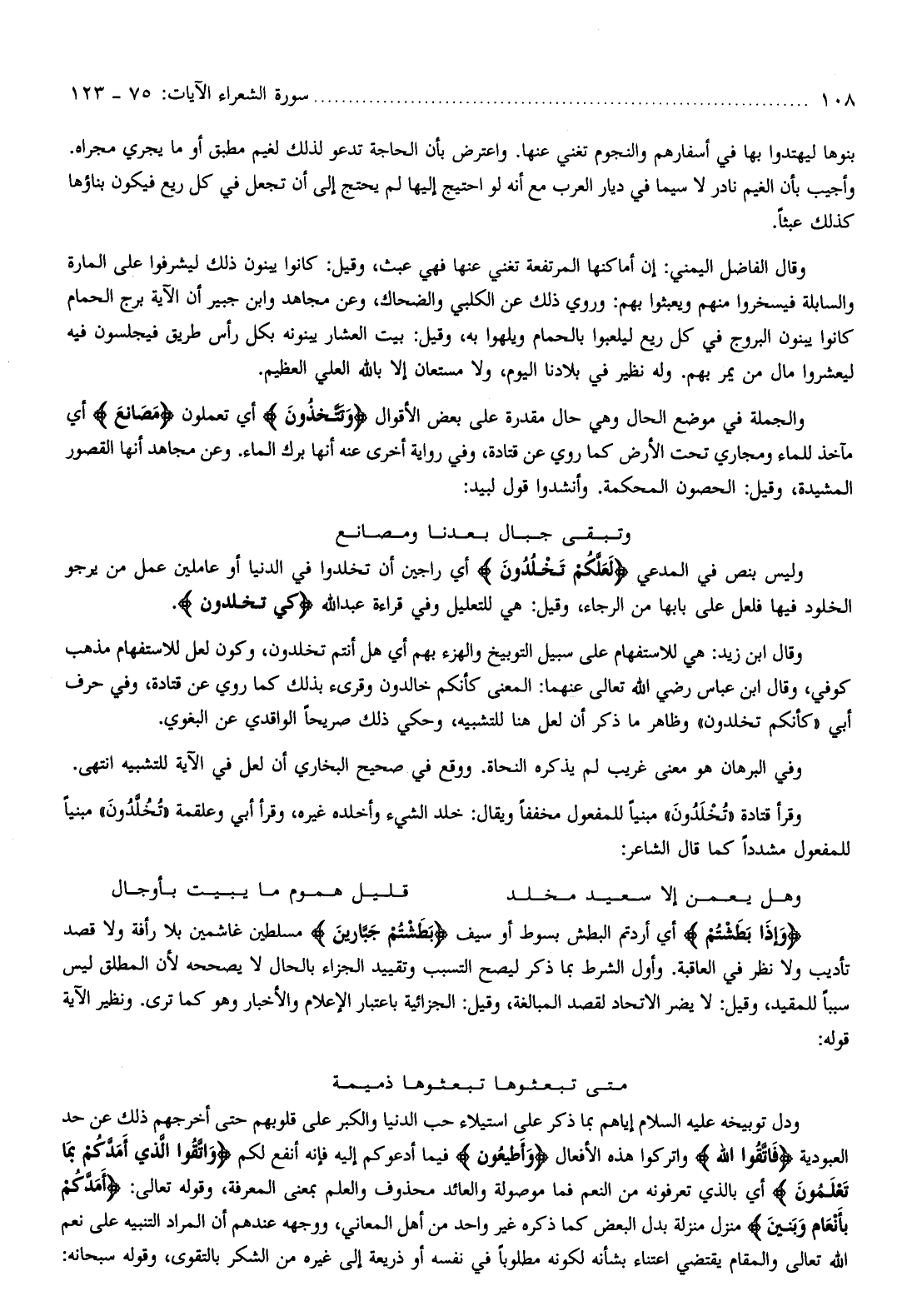 وقال ابن زيد: هي للاستفهام على سبيل التوبيخ والهزء بهم أي هل أنتم تخلدون، وكون لعل للاستفهام مذهب كوفي، وقال ابن عباس رضي الله تعالى عنهما: المعنى كأنكم خالدون وقرىء بذلك كما روي عن قتادة، وفي حرف أبي «كأنكم تخلدون» وظاهر ما ذكر أن لعل هنا للتشبيه، وحكي ذلك صريحا الواقدي عن البغوي.