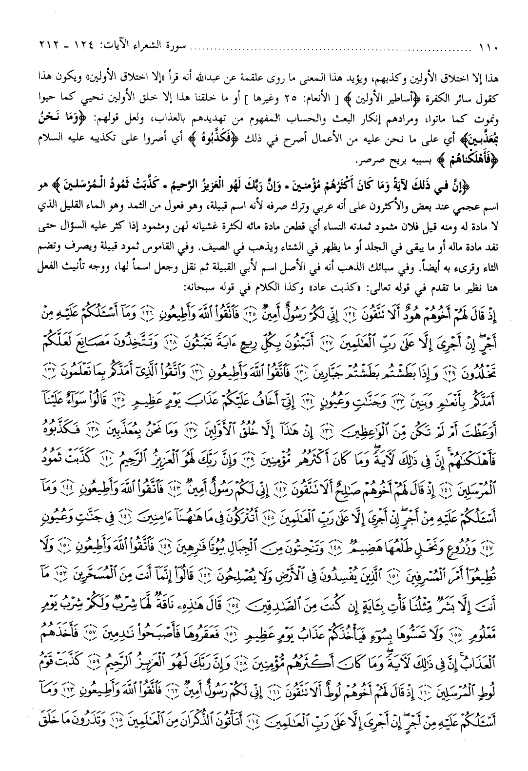 إِنَّ فِي ذلِكَ لَآيَةً وَما كانَ أَكْثَرُهُمْ مُؤْمِنِينَ وَإِنَّ رَبَّكَ لَهُوَ الْعَزِيزُ الرَّحِيمُ كَذَّبَتْ ثَمُودُ الْمُرْسَلِينَ هو اسم عجمي عند بعض والأكثرون على أنه عربي وترك صرفه لأنه اسم قبيلة، وهو فعول من الثمد وهو الماء القليل الذي لا مادة له ومنه قيل فلان مثمود ثمدته النساء أي قطعن مادة مائة لكثرة غشيانه لهن ومثمود إذا كثر عليه السؤال حتى نفد مادة ماله أو ما يبقى في الجلد أو ما يظهر في الشتاء ويذهب في الصيف. وفي القاموس ثمود قبيلة ويصرف وتضم الثاء وقرىء به أيضا. وفي سبائك الذهب أنه في الأصل اسم لأبي القبيلة ثم نقل وجعل اسما لها، ووجه تأنيث الفعل هنا نظير ما تقدم في قوله تعالى: «كذبت عاد» وكذا الكلام في قوله سبحانه: