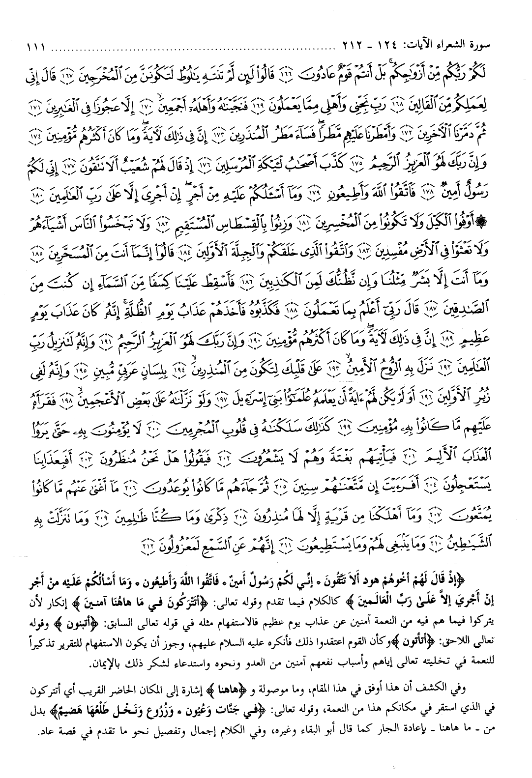 إِذْ قالَ لَهُمْ أَخُوهُمْ هُودٌ أَلا تَتَّقُونَ إِنِّي لَكُمْ رَسُولٌ أَمِينٌ فَاتَّقُوا اللَّهَ وَأَطِيعُونِ وَما أَسْئَلُكُمْ عَلَيْهِ مِنْ أَجْرٍ إِنْ أَجْرِيَ إِلَّا عَلى رَبِّ الْعالَمِينَ كالكلام فيما تقدم وقوله تعالى: أَتُتْرَكُونَ فِي ما هاهُنا آمِنِينَ إنكار لأن يتركوا فيما هم فيه من النعمة آمنين عن عذاب يوم عظيم فالاستفهام مثله في قوله تعالى السابق: أَتَبْنُونَ وقوله تعالى اللاحق: أَتَأْتُونَ وكأن القوم اعتقدوا ذلك فأنكره عليه السلام عليهم، وجوز أن يكون الاستفهام للتقرير تذكيرا للنعمة في تخليته تعالى إياهم وأسباب نفعهم آمنين من العدو ونحوه واستدعاء لشكر ذلك بالإيمان.