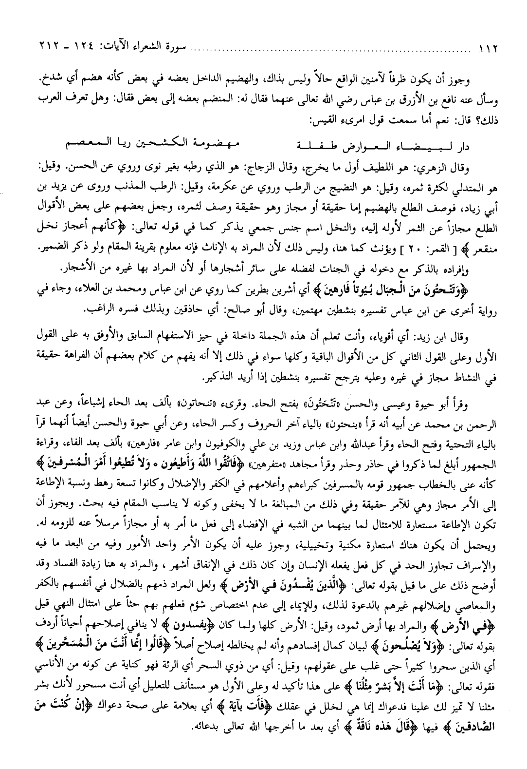 وقرأ أبو حيوة وعيسى والحسن «تنحتون» بفتح الحاء. وقرىء «تنحاتون» بألف بعد الحاء إشباعا، وعن عبد الرحمن بن محمد عن أبيه أنه قرأ «ينحتون» بالياء آخر الحروف وكسر الحاء، وعن أبي حيوة والحسن أيضا أنهما قرآ بالياء التحتية وفتح الحاء وقرأ عبد الله وابن عباس وزيد بن علي والكوفيون وابن عامر «فارهين» بألف بعد الفاء، وقراءة الجمهور أبلغ لما ذكروا في حاذر وحذر وقرأ مجاهد «متفرهين» فَاتَّقُوا اللَّهَ وَأَطِيعُونِ وَلا تُطِيعُوا أَمْرَ الْمُسْرِفِينَ كأنه عنى بالخطاب جمهور قومه بالمسرفين كبراءهم وأعلامهم في الكفر والإضلال وكانوا تسعة رهط ونسبة الإطاعة إلى الأمر مجاز وهي للآمر حقيقة وفي ذلك من المبالغة ما لا يخفى وكونه لا يناسب المقام فيه بحث. ويجوز أن تكون الإطاعة مستعارة للامتثال لما بينهما من الشبه في الإفضاء إلى فعل ما أمر به أو مجازا مرسلا عنه للزومه له.