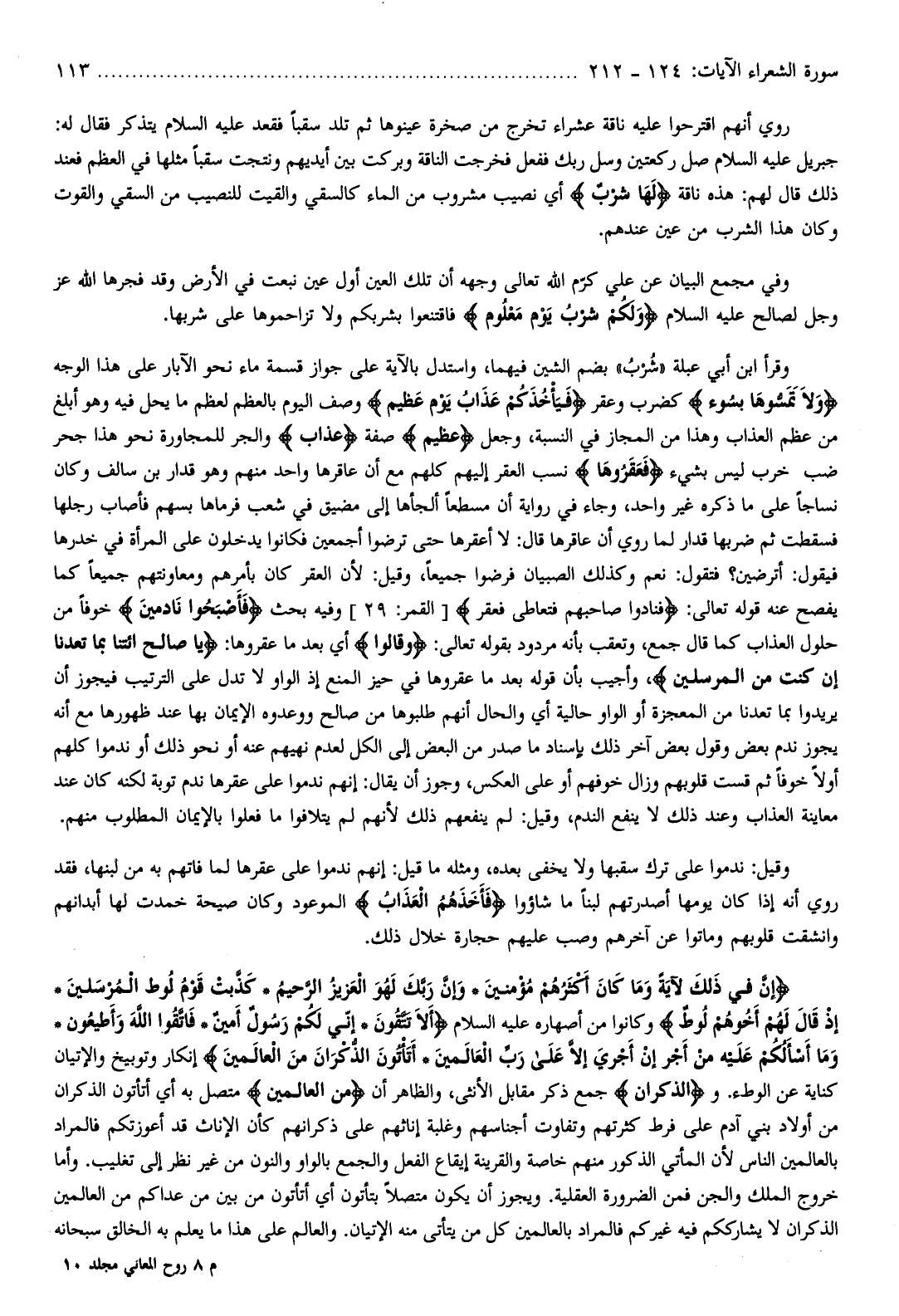 ، وقيل: لأن العقر كان بأمرهم ومعاونتهم جميعا كما يفصح عنه قوله تعالى: فَنادَوْا صاحِبَهُمْ فَتَعاطى فَعَقَرَ [القمر: 29] وفيه بحث فَأَصْبَحُوا نادِمِينَ خوفا من حلول العذاب كما قال جمع، وتعقب بأنه مردود بقوله تعالى: وَقالُوا أي بعد ما عقروها: يا صالِحُ ائْتِنا بِما تَعِدُنا إِنْ كُنْتَ مِنَ الْمُرْسَلِينَ، وأجيب بأن قوله بعد ما عقروها في حيز المنع إذ الواو لا تدل على الترتيب فيجوز أن يريدوا بما تعدنا من المعجزة أو الواو حالية أي والحال أنهم طلبوها من صالح ووعدوه الإيمان بها عند ظهورها مع أنه يجوز ندم بعض وقول بعض آخر ذلك بإسناد ما صدر من البعض إلى الكل لعدم نهيهم عنه أو نحو ذلك أو ندموا كلهم أولا خوفا ثم قست قلوبهم وزال خوفهم أو على العكس، وجوز أن يقال: إنهم ندموا على عقرها ندم توبة لكنه كان عند معاينة العذاب وعند ذلك لا ينفع الندم، وقيل: لم ينفعهم ذلك لأنهم لم يتلافوا ما فعلوا بالإيمان المطلوب منهم.