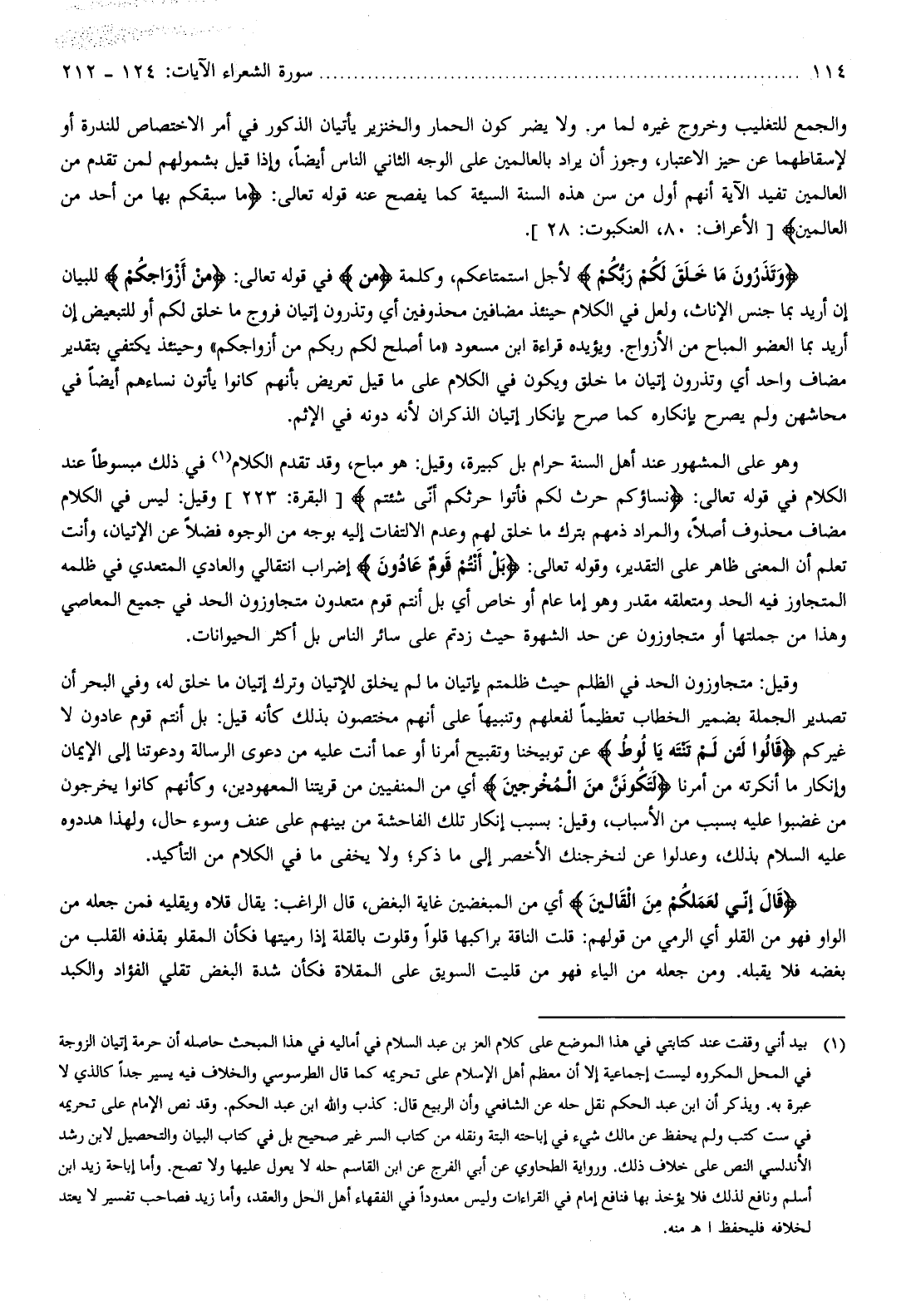 وهو على المشهور عند أهل السنة حرام بل كبيرة، وقيل: هو مباح، وقد تقدم الكلام (¬1) في ذلك مبسوطا عند الكلام في قوله تعالى: نِساؤُكُمْ حَرْثٌ لَكُمْ فَأْتُوا حَرْثَكُمْ أَنَّى شِئْتُمْ [البقرة: 223] وقيل: ليس في الكلام مضاف محذوف أصلا، والمراد ذمهم بترك ما خلق لهم وعدم الالتفات إليه بوجه من الوجوه فضلا عن الإتيان، وأنت تعلم أن المعنى ظاهر على التقدير، وقوله تعالى: بَلْ أَنْتُمْ قَوْمٌ عادُونَ إضراب انتقالي والعادي المتعدي في ظلمه المتجاوز فيه الحد ومتعلقه مقدر وهو إما عام أو خاص أي بل أنتم قوم متعدون متجاوزون الحد في جميع المعاصي وهذا من جملتها أو متجاوزون عن حد الشهوة حيث زدتم على سائر الناس بل أكثر الحيوانات.