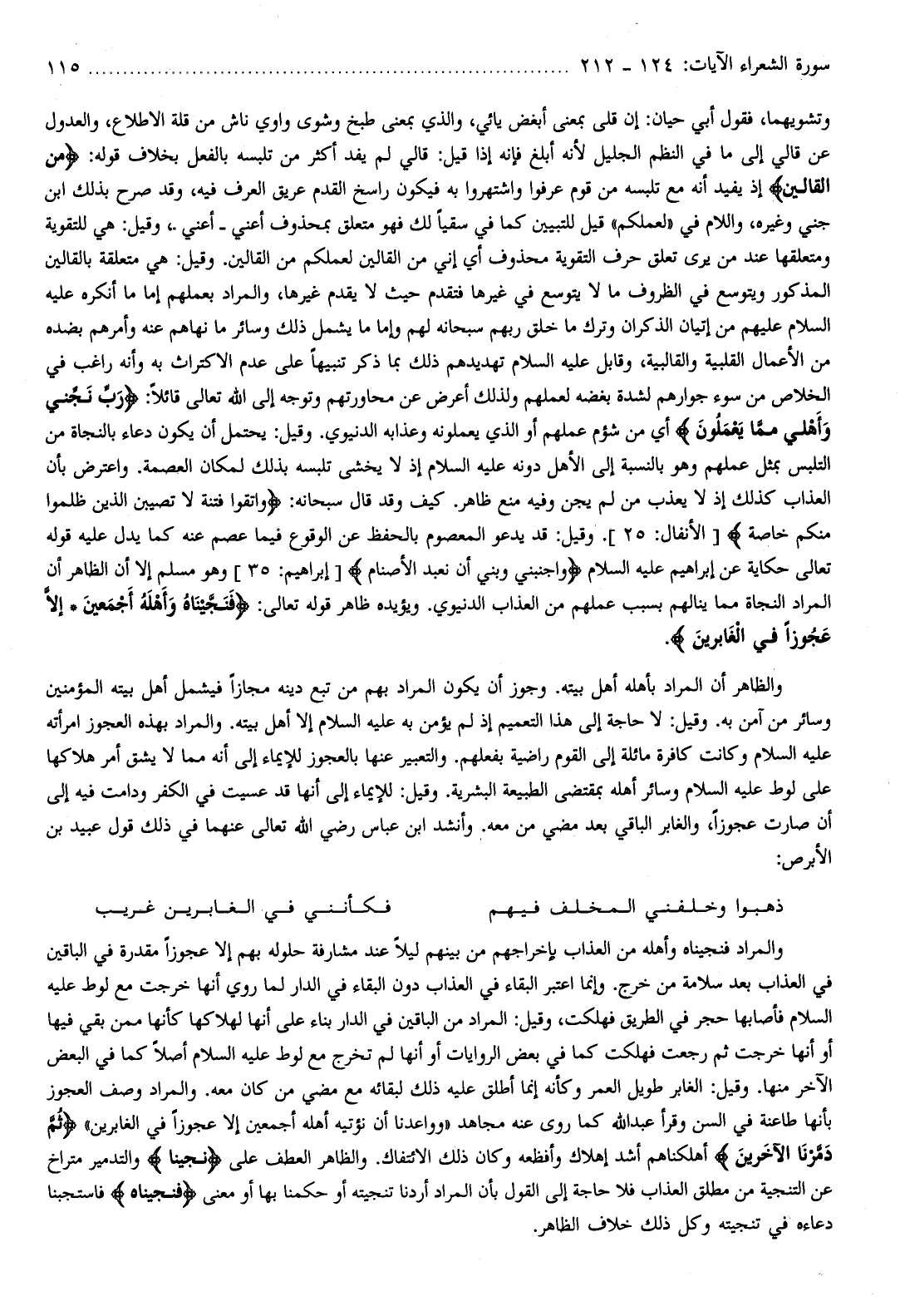 وتشويهما، فقول أبي حيان: إن قلى بمعنى أبغض يائي، والذي بمعنى طبخ وشوى واوي ناش من قلة الاطلاع، والعدول عن قالي إلى ما في النظم الجليل لأنه أبلغ فإنه إذا قيل: قالي لم يفد أكثر من تلبسه بالفعل بخلاف قوله: مِنَ الْقالِينَ إذ يفيد أنه مع تلبسه من قوم عرفوا واشتهروا به فيكون راسخ القدم عريق العرف فيه، وقد صرح بذلك ابن جني وغيره، واللام في «لعملكم» قيل للتبيين كما في سقيا لك فهو متعلق بمحذوف أعني- أعني.، وقيل: هي للتقوية ومتعلقها عند من يرى تعلق حرف التقوية محذوف أي إني من القالين لعملكم من القالين. وقيل: هي متعلقة بالقالين المذكور ويتوسع في الظروف ما لا يتوسع في غيرها فتقدم حيث لا يقدم غيرها، والمراد بعملهم إما ما أنكره عليه السلام عليهم من إتيان الذكران وترك ما خلق ربهم سبحانه لهم وإما ما يشمل ذلك وسائر ما نهاهم عنه وأمرهم بضده من الأعمال القلبية والقالبية، وقابل عليه السلام تهديدهم ذلك بما ذكر تنبيها على عدم الاكتراث به وأنه راغب في الخلاص من سوء جوارهم لشدة بغضه لعملهم ولذلك أعرض عن محاورتهم وتوجه إلى الله تعالى قائلا: رَبِّ نَجِّنِي وَأَهْلِي مِمَّا يَعْمَلُونَ أي من شؤم عملهم أو الذي يعملونه وعذابه الدنيوي. وقيل: يحتمل أن يكون دعاء بالنجاة من التلبس بمثل عملهم وهو بالنسبة إلى الأهل دونه عليه السلام إذ لا يخشى تلبسه بذلك لمكان العصمة. واعترض بأن العذاب كذلك إذ لا يعذب من لم يجن وفيه منع ظاهر. كيف وقد قال سبحانه: وَاتَّقُوا فِتْنَةً لا تُصِيبَنَّ الَّذِينَ ظَلَمُوا مِنْكُمْ خَاصَّةً [الأنفال: 25] . وقيل: قد يدعو المعصوم بالحفظ عن الوقوع فيما عصم عنه كما يدل عليه قوله تعالى حكاية عن إبراهيم عليه السلام وَاجْنُبْنِي وَبَنِيَّ أَنْ نَعْبُدَ الْأَصْنامَ [إبراهيم: 35] وهو مسلم إلا أن الظاهر أن المراد النجاة مما ينالهم بسبب عملهم من العذاب الدنيوي. ويؤيده ظاهر قوله تعالى: فَنَجَّيْناهُ وَأَهْلَهُ أَجْمَعِينَ إِلَّا عَجُوزاً فِي الْغابِرِينَ.