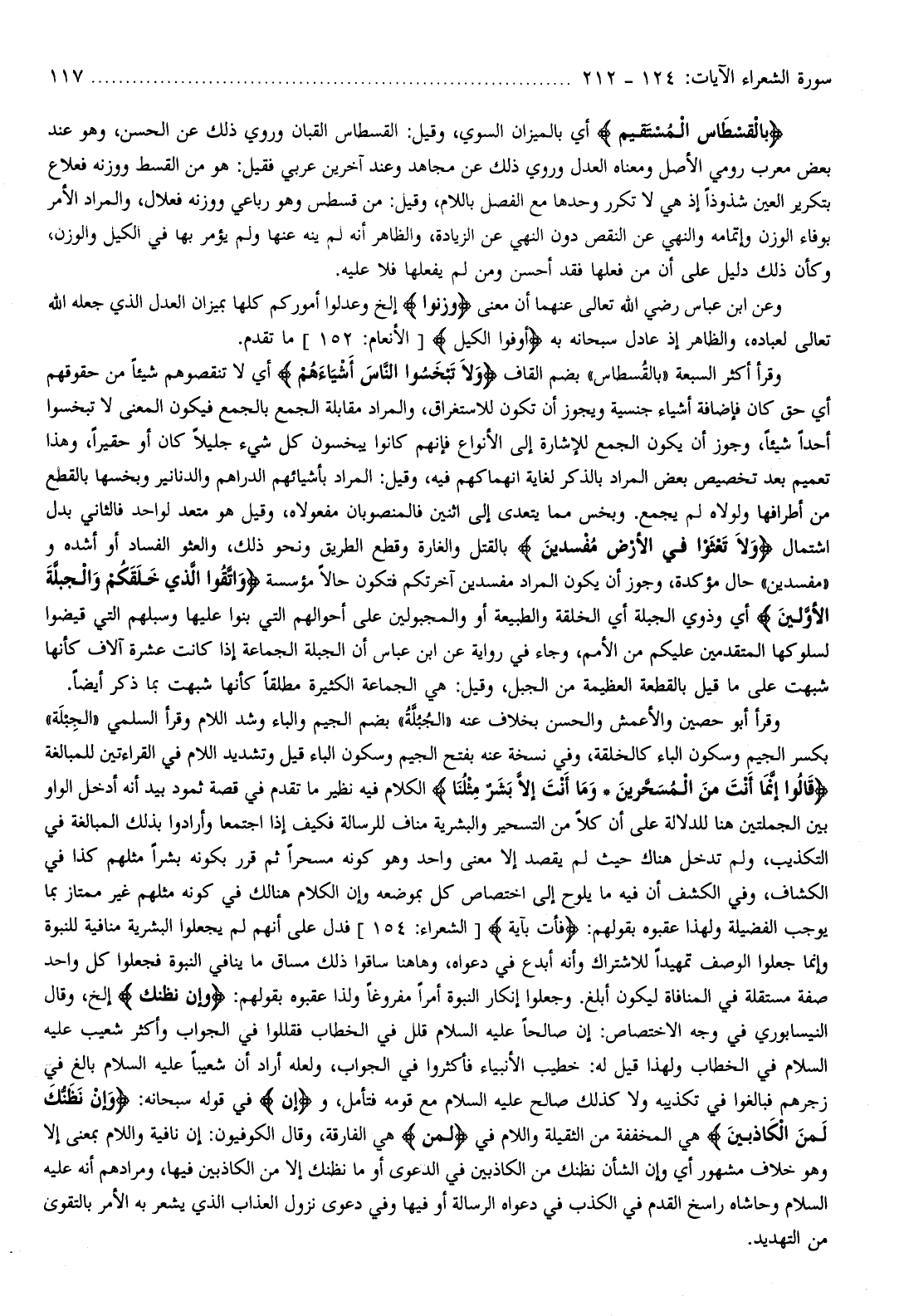 وقرأ أكثر السبعة «بالقسطاس» بضم القاف وَلا تَبْخَسُوا النَّاسَ أَشْياءَهُمْ أي لا تنقصوهم شيئا من حقوقهم أي حق كان فإضافة أشياء جنسية ويجوز أن تكون للاستغراق، والمراد مقابلة الجمع بالجمع فيكون المعنى لا تبخسوا أحدا شيئا، وجوز أن يكون الجمع للإشارة إلى الأنواع فإنهم كانوا يبخسون كل شيء جليلا كان أو حقيرا، وهذا تعميم بعد تخصيص بعض المراد بالذكر لغاية انهماكهم فيه، وقيل: المراد بأشيائهم الدراهم والدنانير وبخسها بالقطع من أطرافها ولولاه لم يجمع. وبخس مما يتعدى إلى اثنين فالمنصوبان مفعولاه، وقيل هو متعد لواحد فالثاني بدل اشتمال وَلا تَعْثَوْا فِي الْأَرْضِ مُفْسِدِينَ بالقتل والغارة وقطع الطريق ونحو ذلك، والعثو الفساد أو أشده و «مفسدين» حال مؤكدة، وجوز أن يكون المراد مفسدين آخرتكم فتكون حالا مؤسسة وَاتَّقُوا الَّذِي خَلَقَكُمْ وَالْجِبِلَّةَ الْأَوَّلِينَ أي وذوي الجبلة أي الخلقة والطبيعة أو والمجبولين على أحوالهم التي بنوا عليها وسبلهم التي قيضوا لسلوكها المتقدمين عليكم من الأمم، وجاء في رواية عن ابن عباس أن الجبلة الجماعة إذا كانت عشرة آلاف كأنها شبهت على ما قيل بالقطعة العظيمة من الجبل، وقيل: هي الجماعة الكثيرة مطلقا كأنها شبهت بما ذكر أيضا.