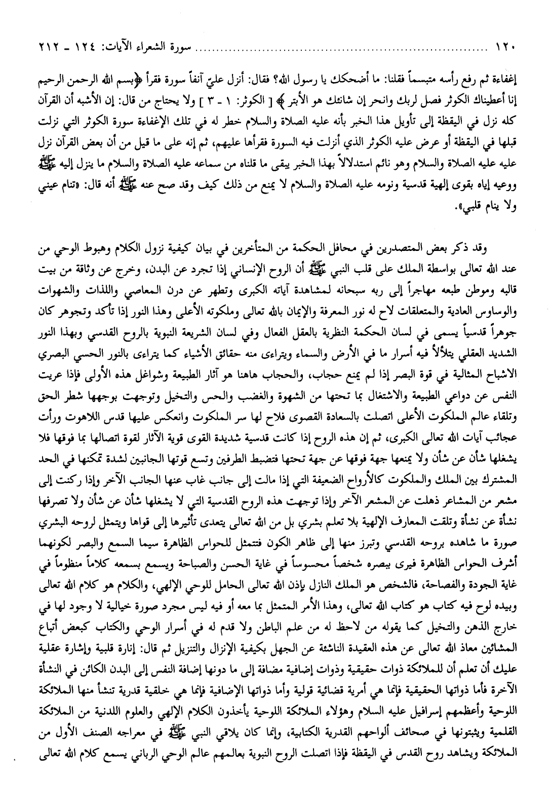ولا يحتاج من قال: إن الأشبه أن القرآن كله نزل في اليقظة إلى تأويل هذا الخبر بأنه عليه الصلاة والسلام خطر له في تلك الإغفاءة سورة الكوثر التي نزلت قبلها في اليقظة أو عرض عليه الكوثر الذي أنزلت فيه السورة فقرأها عليهم، ثم إنه على ما قيل من أن بعض القرآن نزل عليه عليه الصلاة والسلام وهو نائم استدلالا بهذا الخبر يبقى ما قلناه من سماعه عليه الصلاة والسلام ما ينزل إليه صلّى الله عليه وسلّم ووعيه إياه بقوى إلهية قدسية ونومه عليه الصلاة والسلام لا يمنع من ذلك كيف