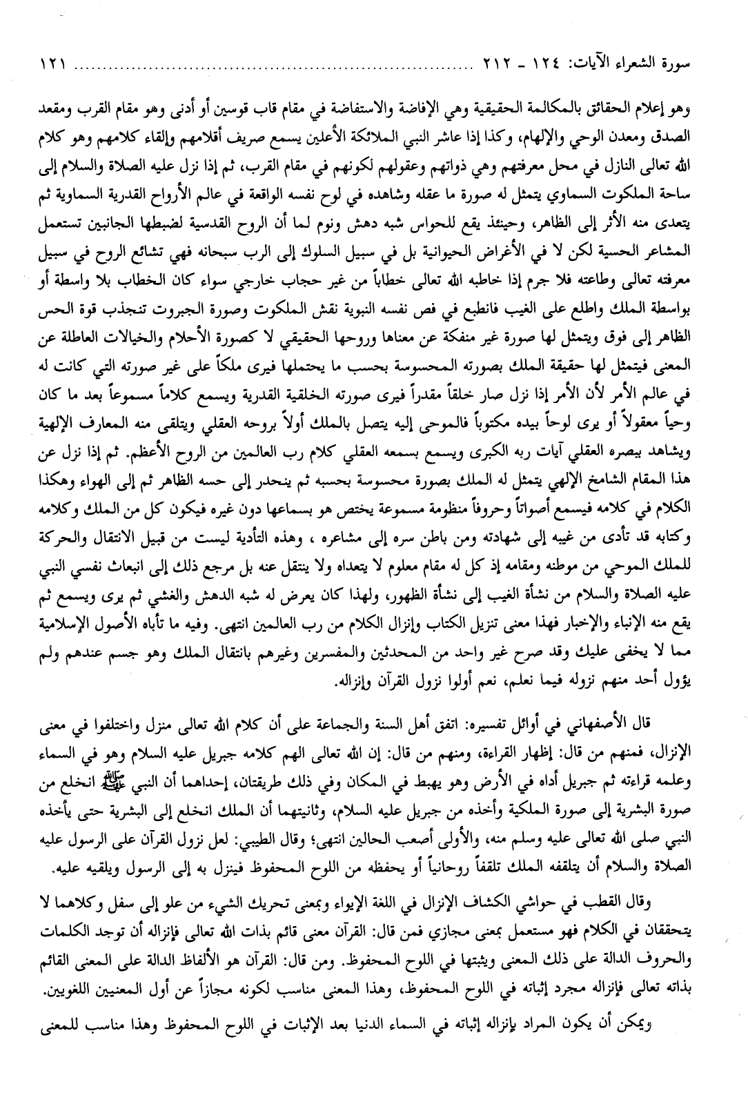 عن معناها وروحها الحقيقي لا كصورة الأحلام والخيالات العاطلة عن المعنى فيتمثل لها حقيقة الملك بصورته المحسوسة بحسب ما يحتملها فيرى ملكا على غير صورته التي كانت له في عالم الأمر لأن الأمر إذا نزل صار خلقا مقدرا فيرى صورته الخلقية القدرية ويسمع كلاما مسموعا بعد ما كان وحيا معقولا أو يرى لوحا بيده مكتوبا فالموحى إليه يتصل بالملك أولا بروحه العقلي ويتلقى منه المعارف الإلهية ويشاهد ببصره العقلي آيات ربه الكبرى ويسمع بسمعه العقلي كلام رب العالمين من الروح الأعظم. ثم إذا نزل عن هذا المقام الشامخ الإلهي يتمثل له الملك بصورة محسوسة بحسبه ثم ينحدر إلى حسه الظاهر ثم إلى الهواء وهكذا الكلام في كلامه فيسمع أصواتا وحروفا منظومة مسموعة يختص هو بسماعها دون غيره فيكون كل من الملك وكلامه وكتابه قد تأدى من غيبه إلى شهادته ومن باطن سره إلى مشاعره، وهذه التأدية ليست من قبيل الانتقال والحركة للملك الموحي من موطنه ومقامه إذ كل له مقام معلوم لا يتعداه ولا ينتقل عنه بل مرجع ذلك إلى انبعاث نفسي النبي عليه الصلاة والسلام من نشأة الغيب إلى نشأة الظهور، ولهذا كان يعرض له شبه الدهش والغشي ثم يرى ويسمع ثم يقع منه الإنباء والإخبار فهذا معنى تنزيل الكتاب وإنزال الكلام من رب العالمين انتهى. وفيه ما تأباه الأصول الإسلامية مما لا يخفى عليك وقد صرح غير واحد من المحدثين والمفسرين وغيرهم بانتقال الملك وهو جسم عندهم ولم يؤول أحد منهم نزوله فيما نعلم، نعم أولوا نزول القرآن وإنزاله.