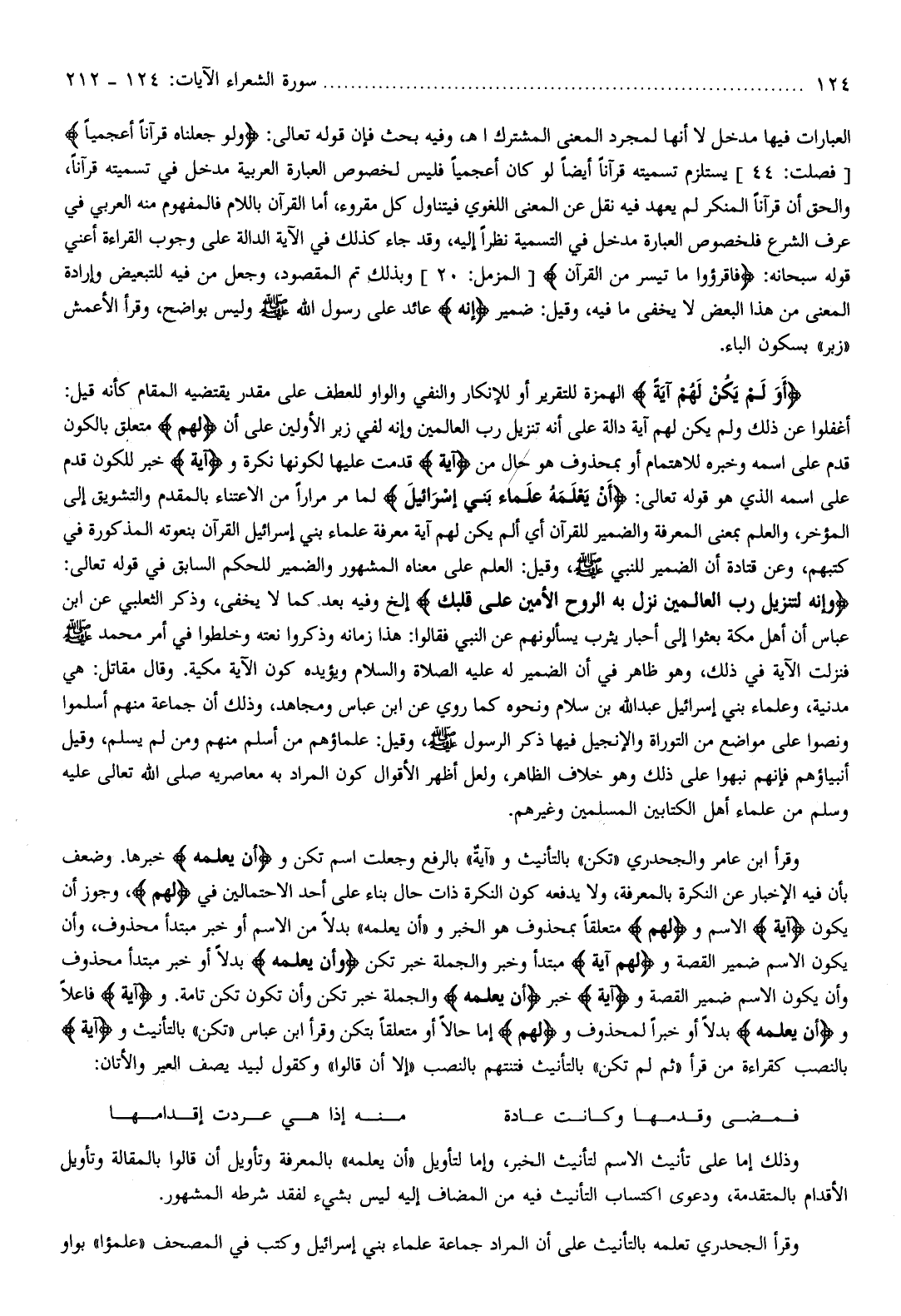 وقرأ ابن عامر والجحدري «تكن» بالتأنيث و «آية» بالرفع وجعلت اسم تكن وأَنْ يَعْلَمَهُ خبرها. وضعف بأن فيه الإخبار عن النكرة بالمعرفة، ولا يدفعه كون النكرة ذات حال بناء على أحد الاحتمالين في لَهُمْ، وجوز أن يكون آيَةً الاسم ولَهُمْ متعلقا بمحذوف هو الخبر و «أن يعلمه» بدلا من الاسم أو خبر مبتدأ محذوف، وأن يكون الاسم ضمير القصة ولَهُمْ آيَةً مبتدأ وخبر والجملة خبر تكن وأَنْ يَعْلَمَهُ بدلا أو خبر مبتدأ محذوف وأن يكون الاسم ضمير القصة وآيَةً خبر أَنْ يَعْلَمَهُ والجملة خبر تكن وأن تكون تكن تامة. وآيَةً فاعلا وأَنْ يَعْلَمَهُ بدلا أو خبرا لمحذوف ولَهُمْ إما حالا أو متعلقا بتكن وقرأ ابن عباس «تكن» بالتأنيث وآيَةً بالنصب كقراءة من قرأ «ثم لم تكن» بالتأنيث فتنتهم بالنصب «إلا أن قالوا» وكقول لبيد يصف العير والأتان:
