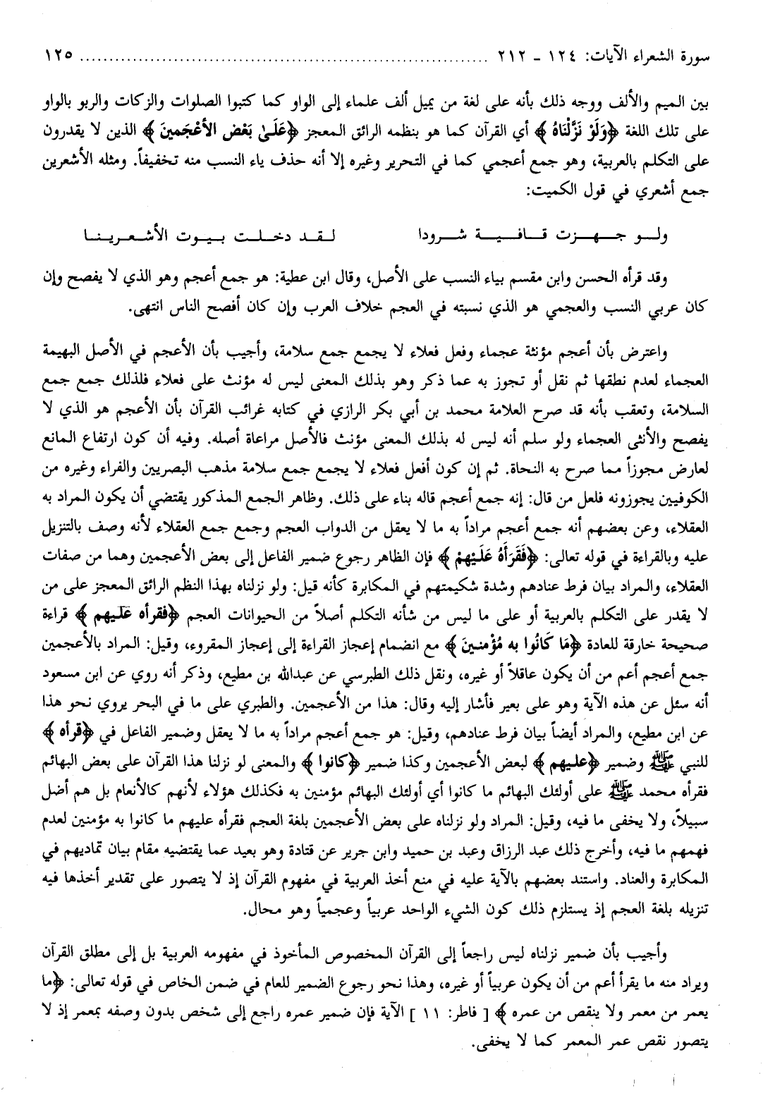 وأجيب بأن ضمير نزلناه ليس راجعا إلى القرآن المخصوص المأخوذ في مفهومه العربية بل إلى مطلق القرآن ويراد منه ما يقرأ أعم من أن يكون عربيا أو غيره، وهذا نحو رجوع الضمير للعام في ضمن الخاص في قوله تعالى: ما يُعَمَّرُ مِنْ مُعَمَّرٍ وَلا يُنْقَصُ مِنْ عُمُرِهِ [فاطر: 11] الآية فإن ضمير عمره راجع إلى شخص بدون وصفه بمعمر إذ لا يتصور نقص عمر المعمر كما لا يخفى.