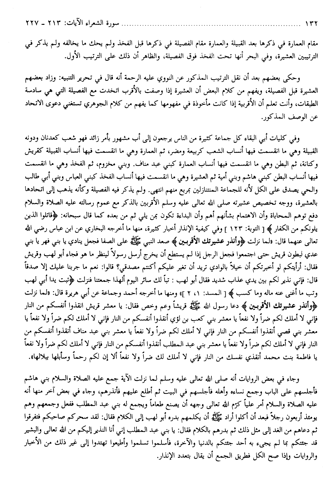 أخرجه أحمد وجماعة عن أبي هريرة قال: «لما نزلت وَأَنْذِرْ عَشِيرَتَكَ الْأَقْرَبِينَ دعا رسول الله صلّى الله عليه وسلّم قريشا وعم وخص فقال: يا معشر قريش أنقذوا أنفسكم من النار فإني لا أملك لكم ضرا ولا نفعا يا معشر بني كعب بن لؤي أنقذوا أنفسكم من النار فإني لا أملك لكم ضرا ولا نفعا يا معشر بني قصي أنقذوا أنفسكم من النار فإني لا أملك لكم ضرا ولا نفعا يا معشر بني عبد مناف أنقذوا أنفسكم من النار فإني لا أملك لكم ضرا ولا نفعا يا معشر بني عبد المطلب أنقذوا أنفسكم من النار فإني لا أملك لكم ضرا ولا نفعا يا فاطمة بنت محمد أنقذي نفسك من النار فإني لا أملك لك ضرا ولا نفعا ألا إن لكم رحما وسأبلها ببلالها» .