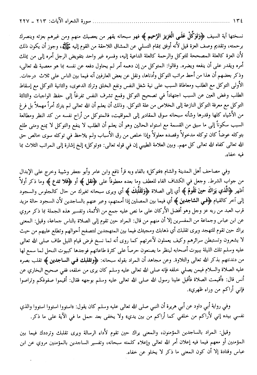 نسختها آية السيف وَتَوَكَّلْ عَلَى الْعَزِيزِ الرَّحِيمِ فهو سبحانه يقهر من يعصيك منهم ومن غيرهم بعزته وينصرك برحمته، وتقديم وصف العزة قيل لأنه أوفق بمقام التسلي عن المشاق اللاحقة من القوم إليه صلّى الله عليه وسلّم، وجوز أن يكون ذلك لأن العزة كالعلة المصححة للتوكل والرحمة كالعلة الداعية إليه، وفسره غير واحد بتفويض الرجل أمره إلى من يملك أمره ويقدر على أن ينفعه ويضره. وقالوا: المتوكل من إن دهمه أمر لم يحاول دفعه عن نفسه بما هو معصية لله تعالى، وذكر بعضهم أن هذا من أحط مراتب التوكل وأدناها، ونقل عن بعض العارفين أنه فيما بين الناس على ثلاث درجات.