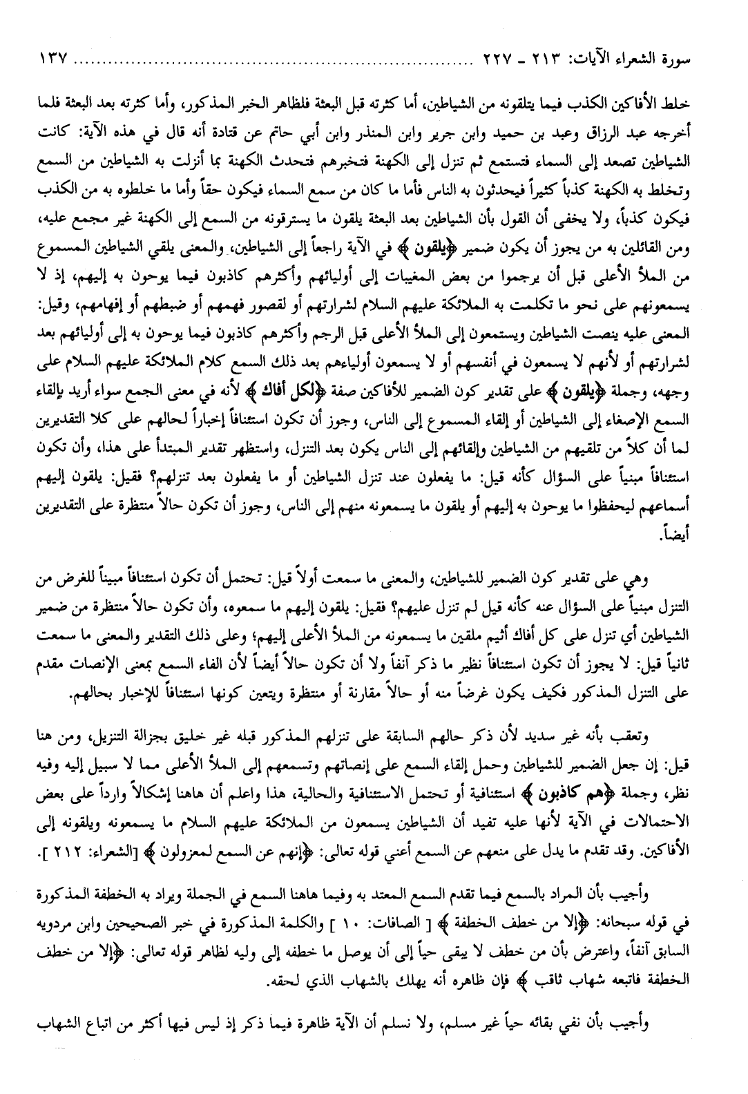 وتعقب بأنه غير سديد لأن ذكر حالهم السابقة على تنزلهم المذكور قبله غير خليق بجزالة التنزيل، ومن هنا قيل: إن جعل الضمير للشياطين وحمل إلقاء السمع على إنصاتهم وتسمعهم إلى الملأ الأعلى مما لا سبيل إليه وفيه نظر، وجملة أَكْثَرُهُمْ كاذِبُونَ استئنافية أو تحتمل الاستئنافية والحالية، هذا واعلم أن هاهنا إشكالا واردا على بعض الاحتمالات في الآية لأنها عليه تفيد أن الشياطين يسمعون من الملائكة عليهم السلام ما يسمعونه ويلقونه إلى الأفاكين. وقد تقدم ما يدل على منعهم عن السمع أعني قوله تعالى: إِنَّهُمْ عَنِ السَّمْعِ لَمَعْزُولُونَ [الشعراء: 212] .