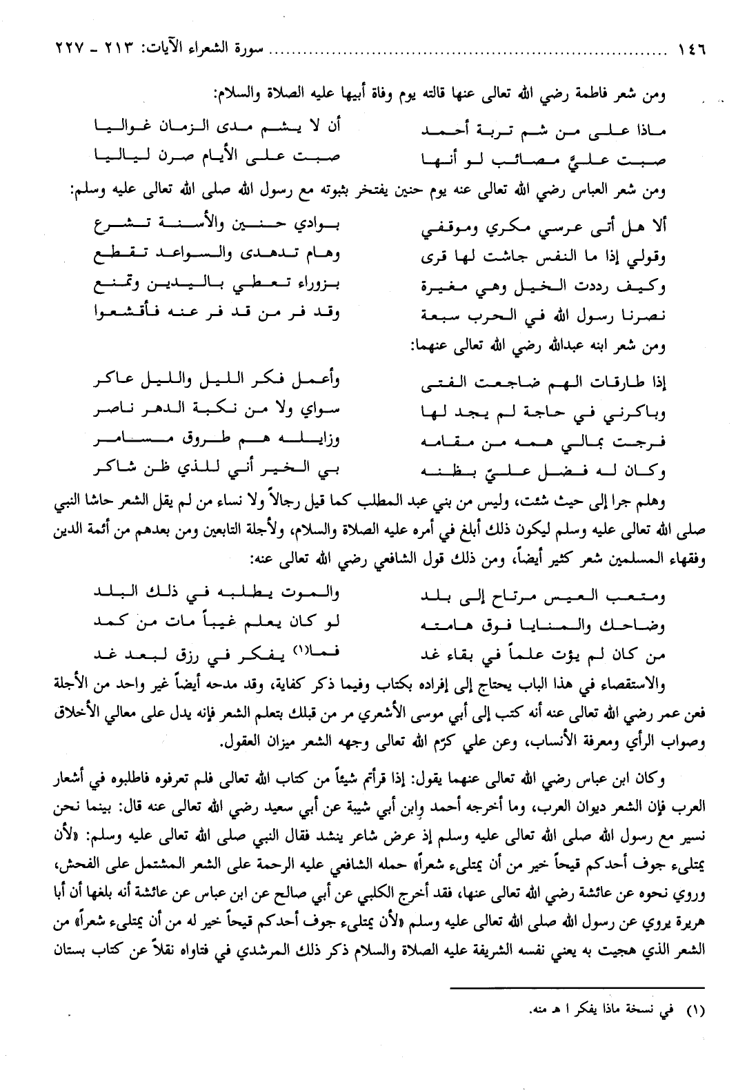 وهلم جرا إلى حيث شئت، وليس من بني عبد المطلب كما قيل رجالا ولا نساء من لم يقل الشعر حاشا النبي صلى الله تعالى عليه وسلّم ليكون ذلك أبلغ في أمره عليه الصلاة والسلام، ولأجلة التابعين ومن بعدهم من أئمة الدين وفقهاء المسلمين شعر كثير أيضا، ومن ذلك قول الشافعي رضي الله تعالى عنه: